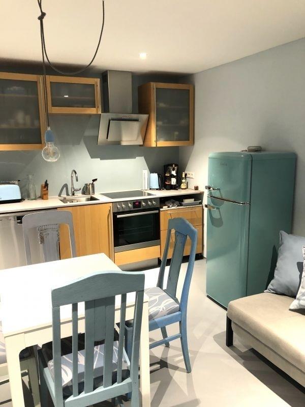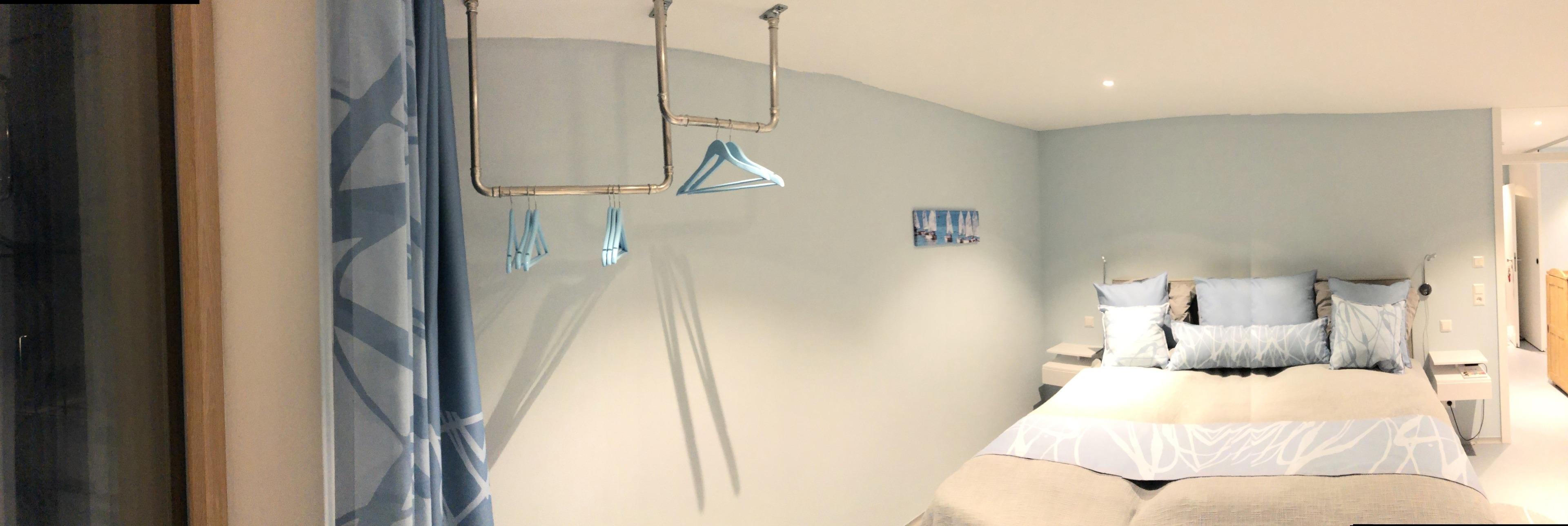 Das Apartment ist mit einem Design-Fußboden im Betonlook von der ‘Art on Floor‘-Designerin Jeanet Hönig, sowie gemütlichen Sesseln und einem bequemen Kingsize-Boxspringbett ausgestattet.
