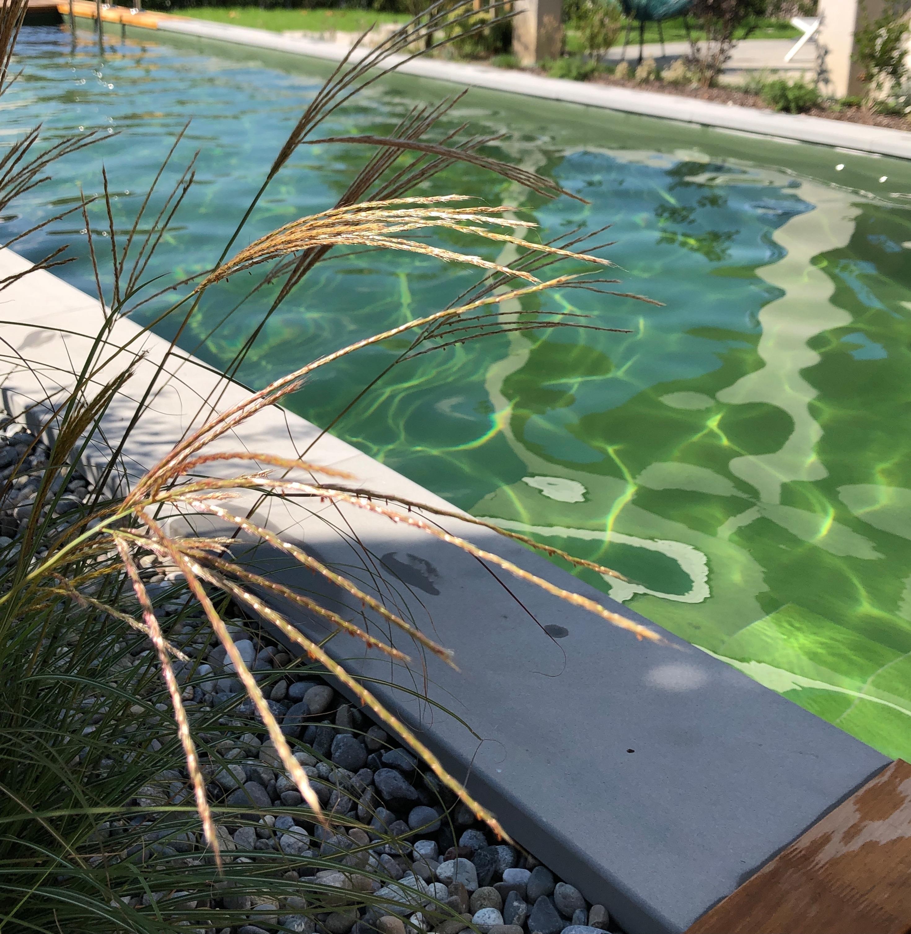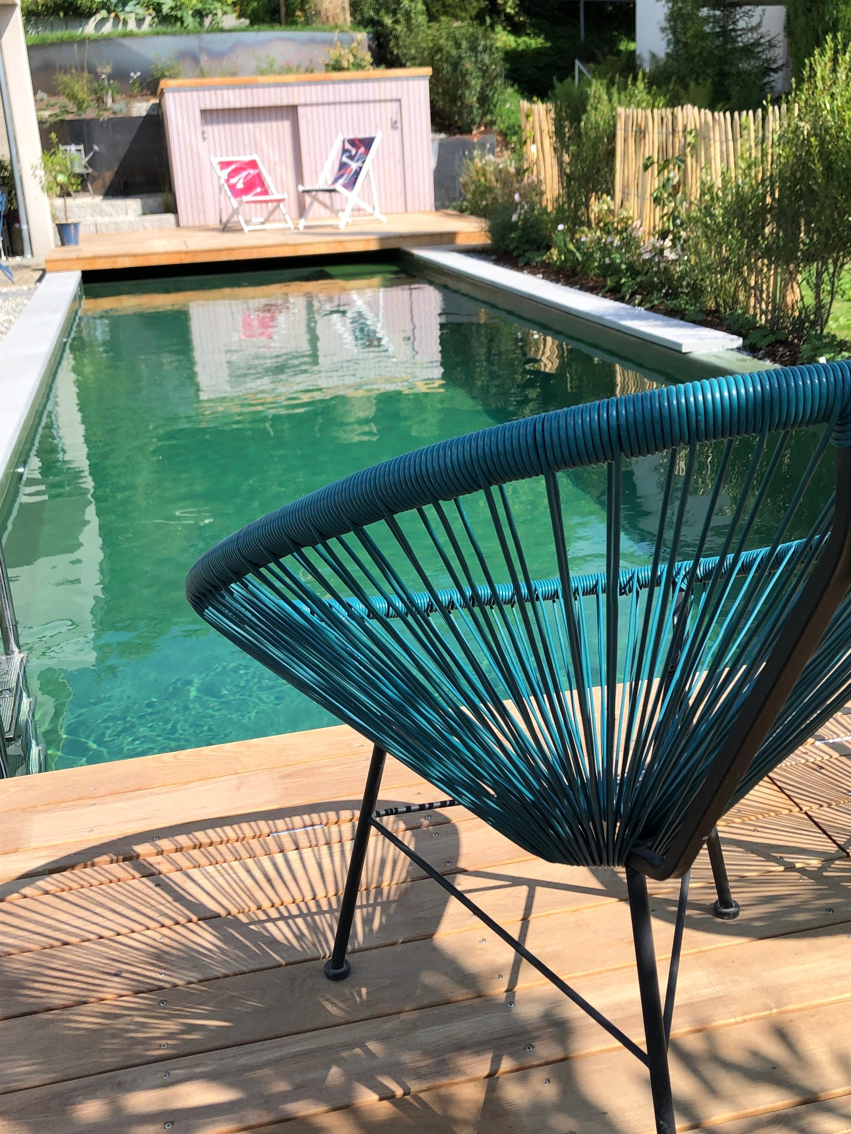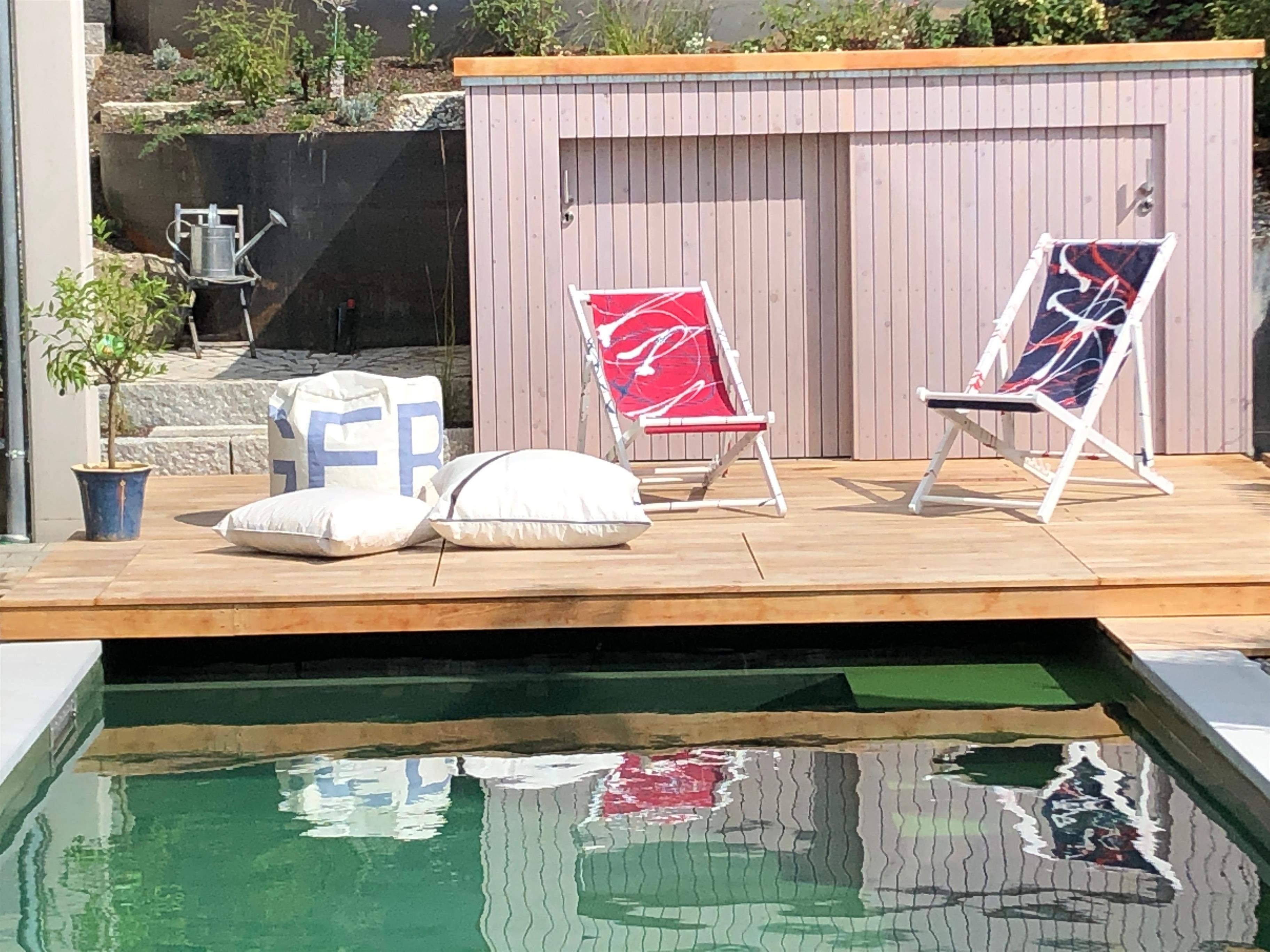 Teakholzmöbel mit Kissen und Decken sorgen für entspannte Stunden auf der Terrasse. Der gemeinsame Garten mit beheiztem Naturpool kann das ganze Jahr zum Auftanken und Abtauchen genutzt werden.