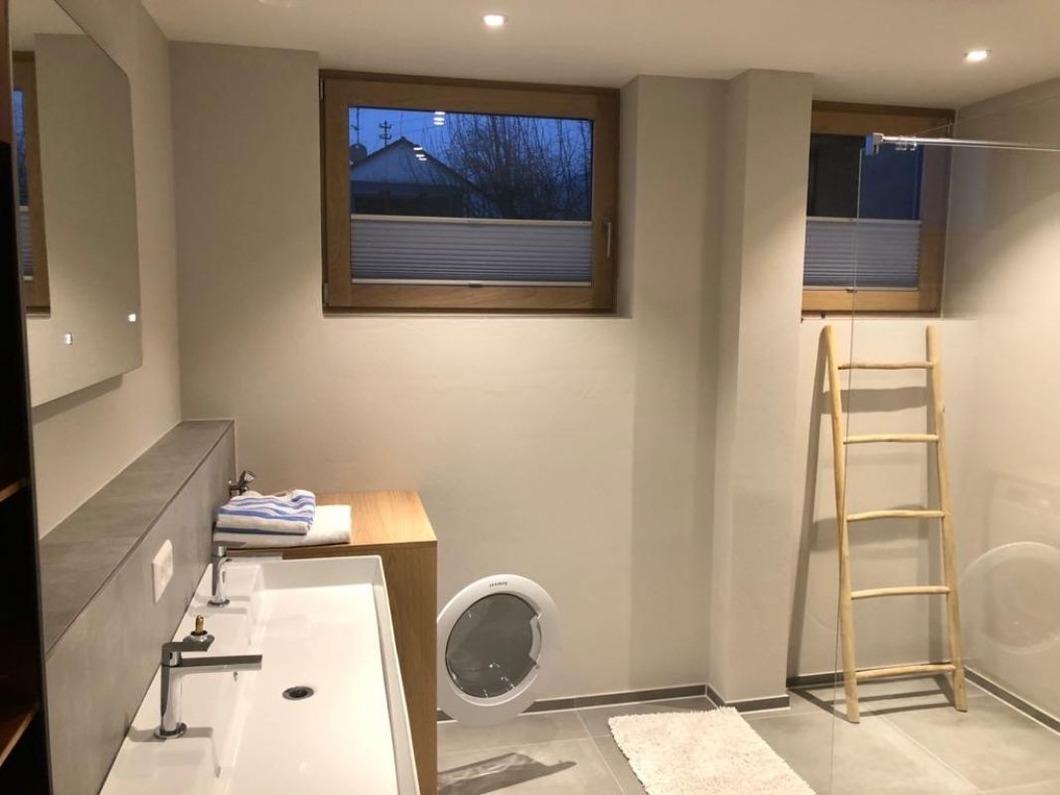 Das hochwertig eingerichtete Badezimmer ist eine lichtdurchflutete Wohlfühloase mit einer großzügigen Dusche und einem Doppelwaschbecken.