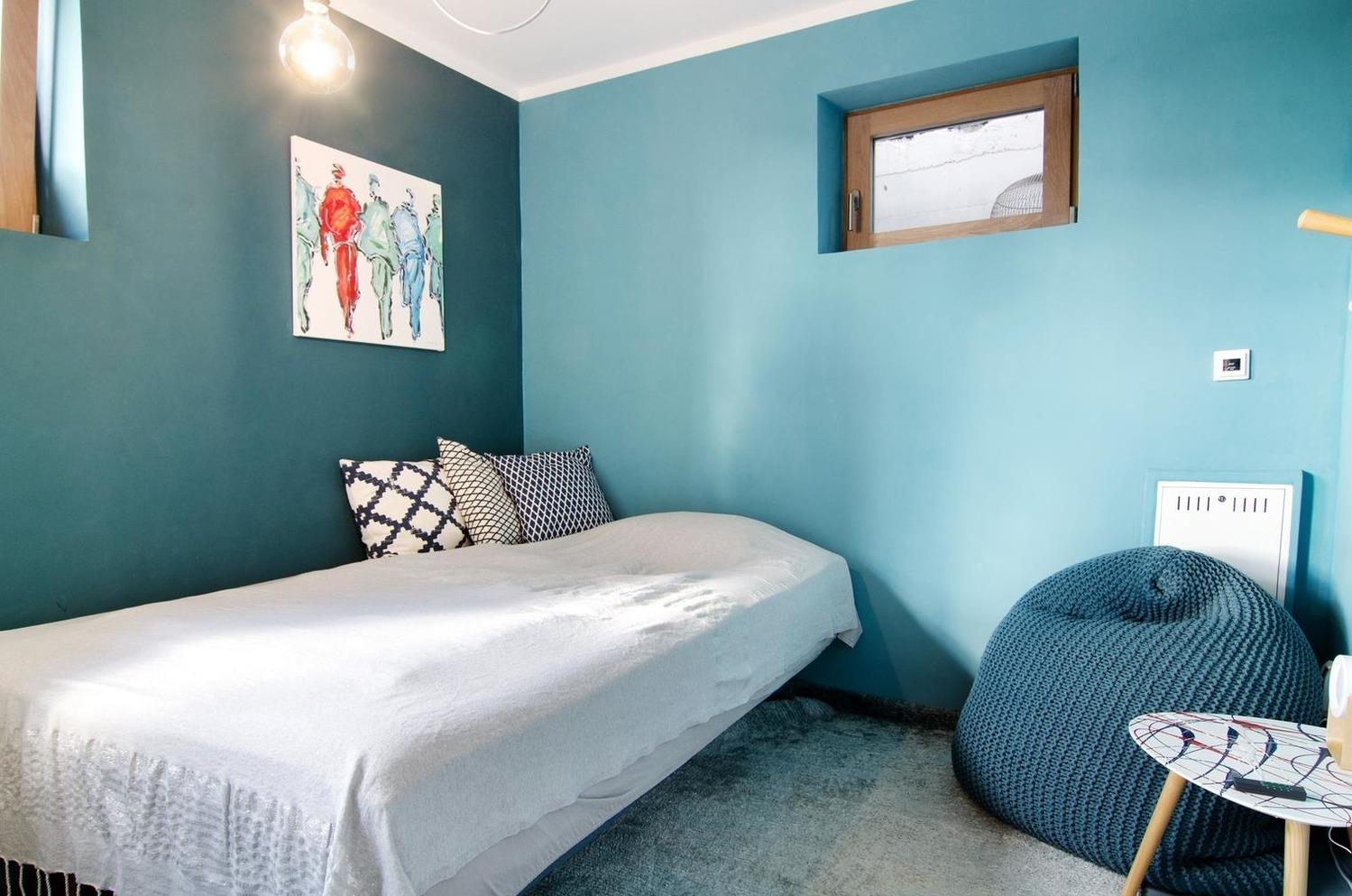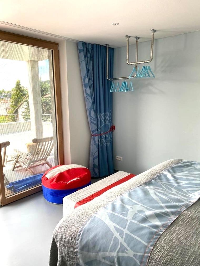 Da das SeeZeichen-Apartment No 26 mit 55 Quadratmetern reiner Wohnfläche eher klein ist, bieten wir ab 3 Personen die Möglichkeit unser Mini-Apartment SeeLiebe Apartment No.17 als Zusatzschlafzimmerchen zu nutzen. Inklusive extra Dusche und WC im gemeinsam genutzten, abschließbaren Saunabereich. Das extra Zimmerchen ist sehr klein und nur mit einer Schlafcouch, einem Sitzsack und einer Garderobenstange ausgestattet. Es verfügt über eine Infrarotheizung, nicht über eine Fußbodenheizung, wie der Rest unserer Ferienapartments. Es ist halb in den Hang gebaut und eher kühl. Es liegt direkt gegenüber des SeeZeichen- Apartment -2 Schritte über den Gang.
