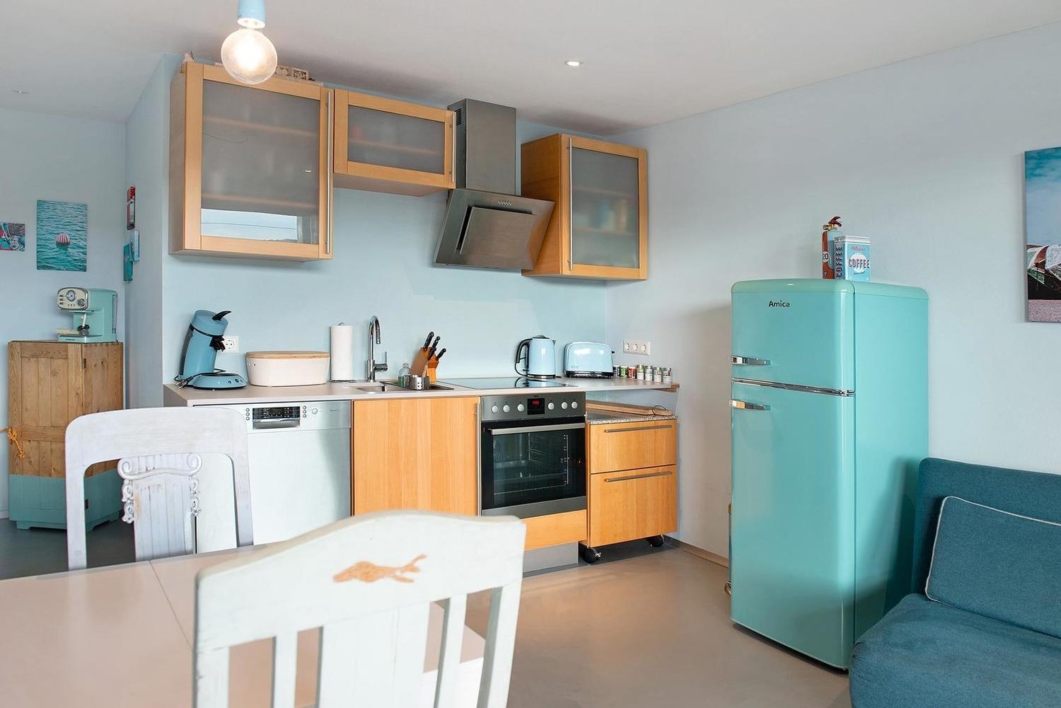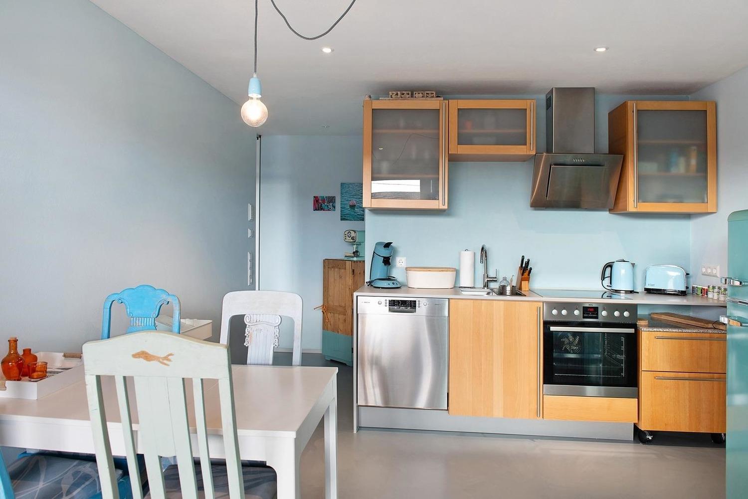 Ein weißer ausziehbarer Holztisch und liebevoll restaurierte, gepolsterte Vintage- Stühle laden zu unterhaltsamen Stunden bei Tisch. In der offenen, modernen Küche, mit Geschirrspülmaschine, Kochfeld, Backofen und Kühlschrank mit Gefrierfach, kann das Kochen auch im Urlaub Spaß machen.