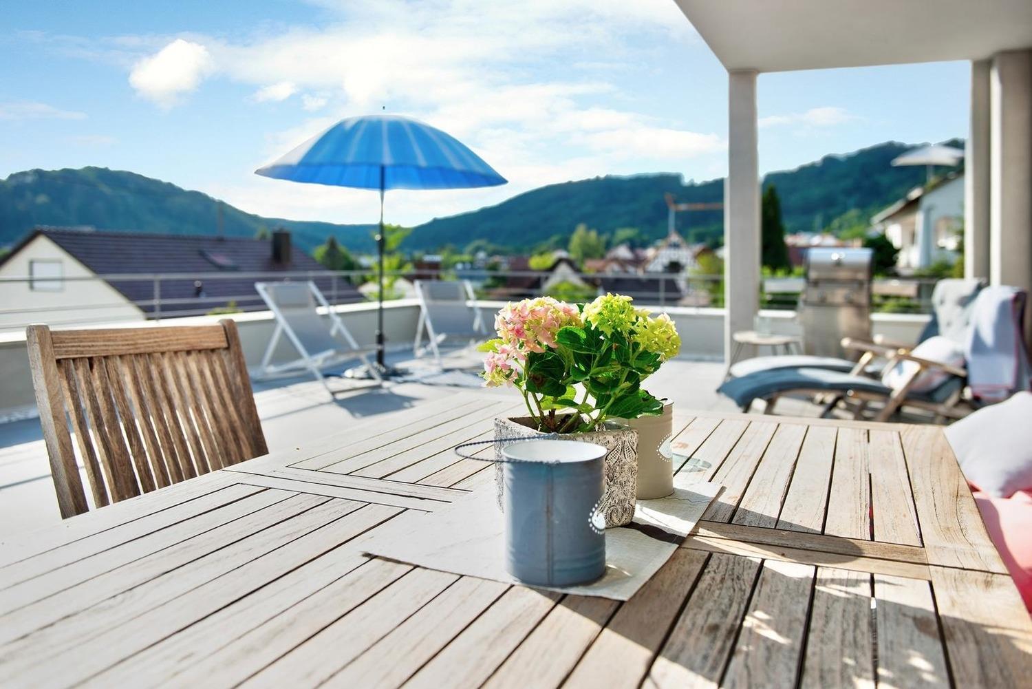Die Teil-Überdachung der Terrasse ermöglicht wohldosierten Sonnengenuss und verlängert damit Ihre Feriensaison und schöne Abende im Freien.