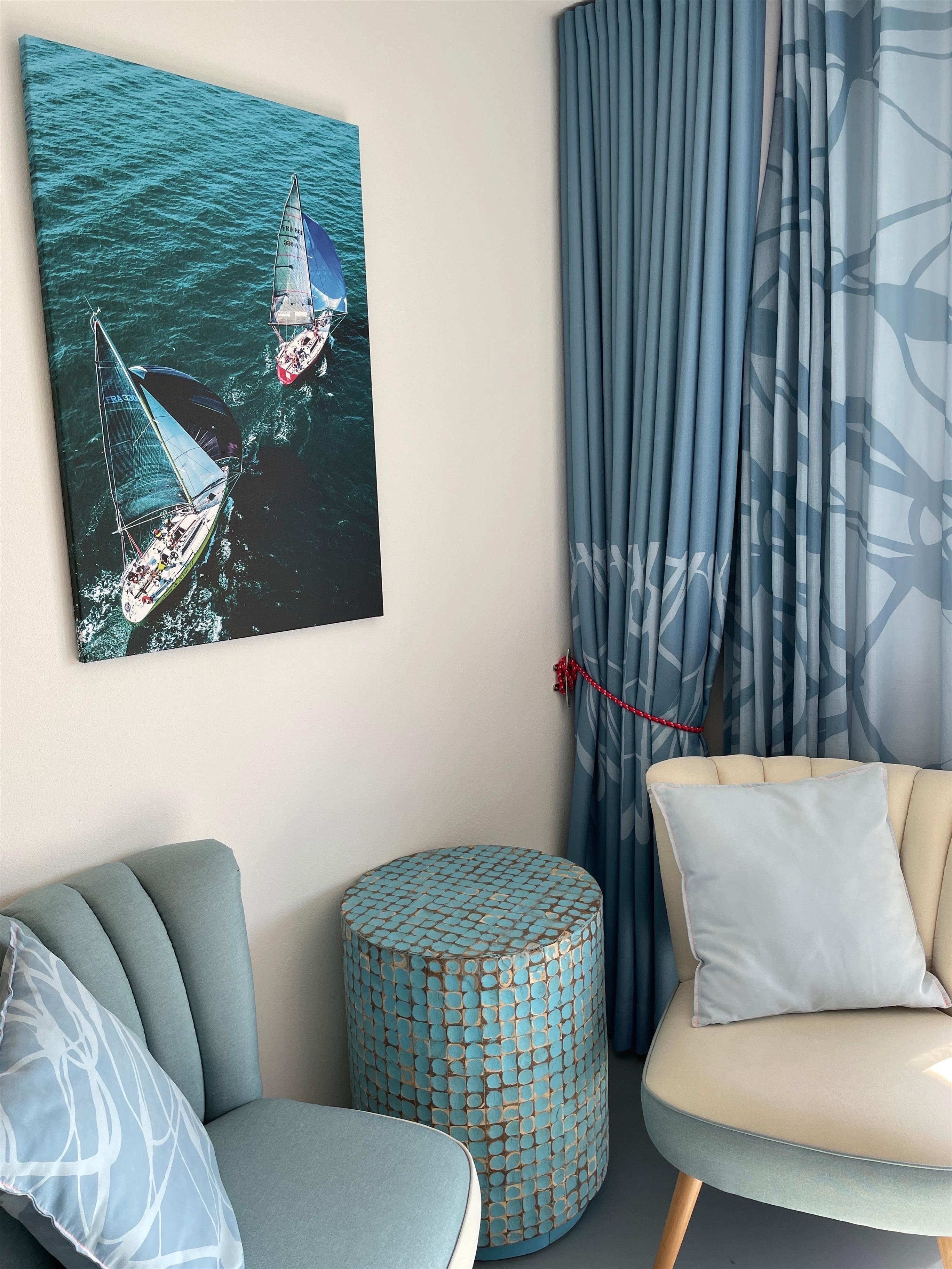 Das moderne Design der Vorhänge und Kissen ist einzigartig und macht die Ferienwohnung zu etwas ganz Besonderem.