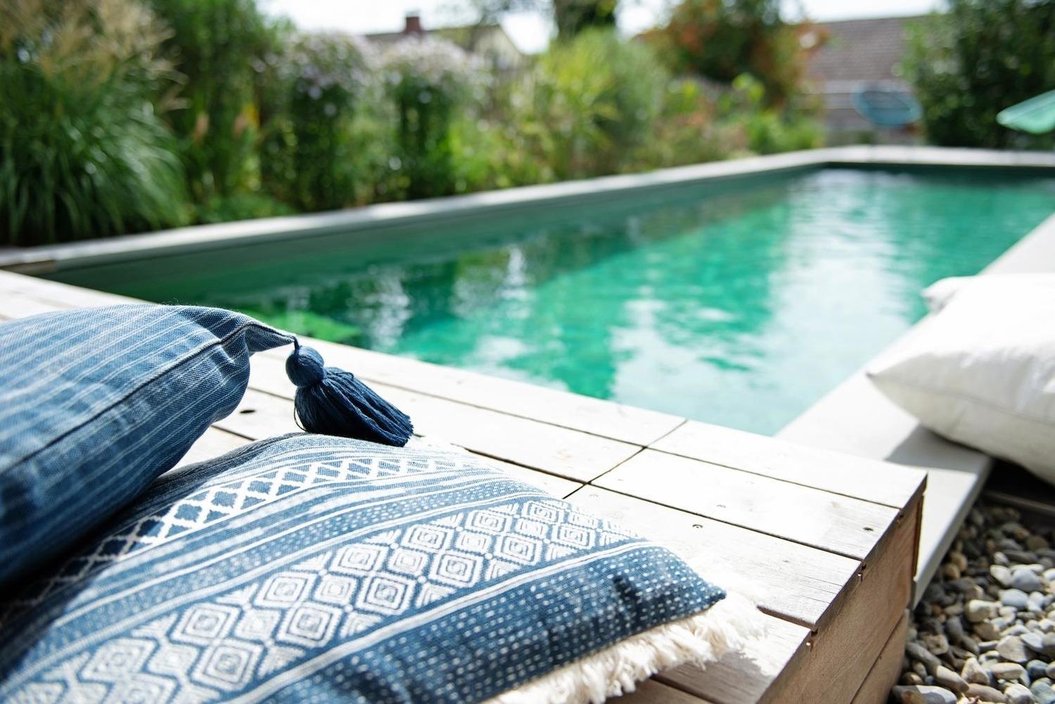 Die Gartenmöbel aus Teakholz sind mit Polstern, Kissen und Decken ausgestattet und sorgen damit für entspannte Stunden auf der Terrasse. Der gemeinsame Garten mit beheiztem Naturpool kann das ganze Jahr zum Auftanken genutzt werden.