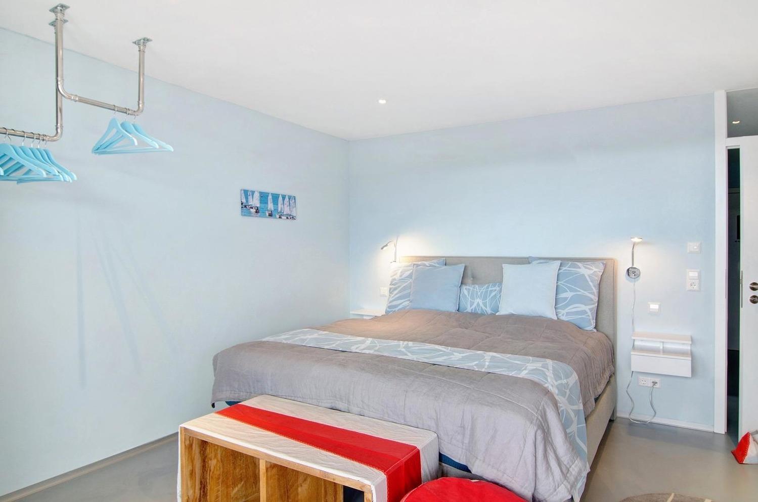 Das Apartment ist mit einem Design-Fußboden im Betonlook von der `Art on Floor´ Designerin Jeanet Hönig, sowie gemütlichen Sesseln und einem bequemen Kingsize Boxspringbett ausgestattet.