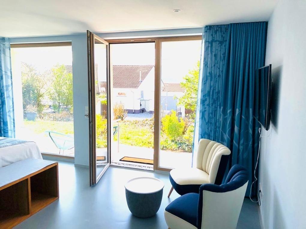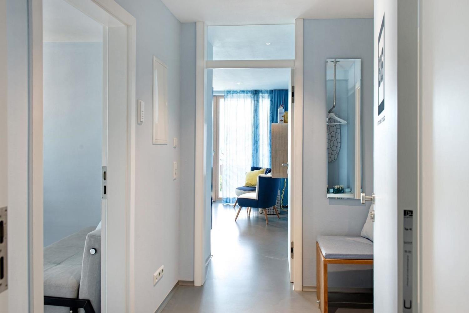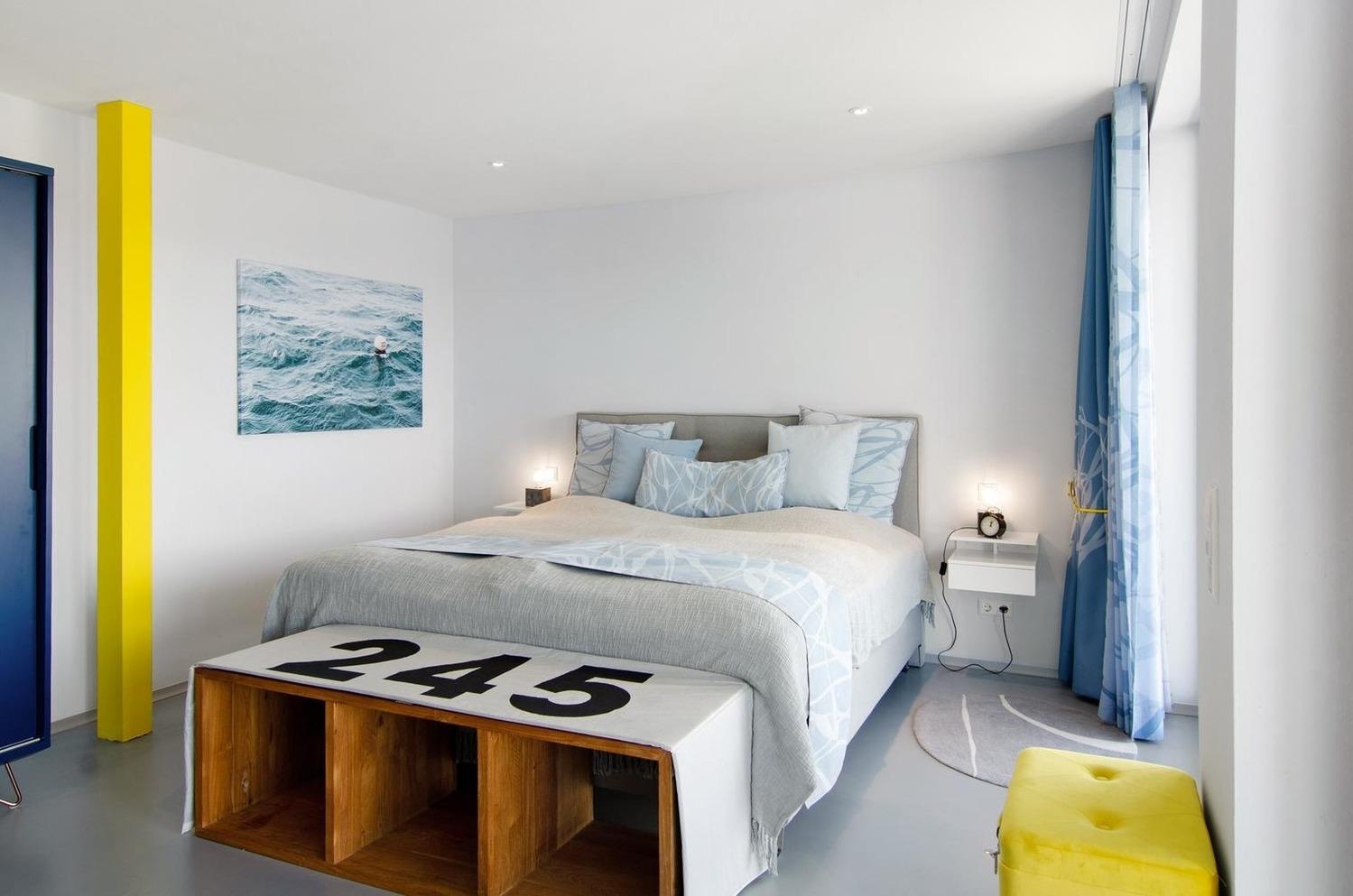 Der Design Fußboden im Betonlook von der `Art on Floor´ Designerin Jeanet Hönig, sowie die einzigartige Textilaustattung tragen zu dem außergewöhnlichen Ambiente der hochwertigen Ferienwohnungen bei.