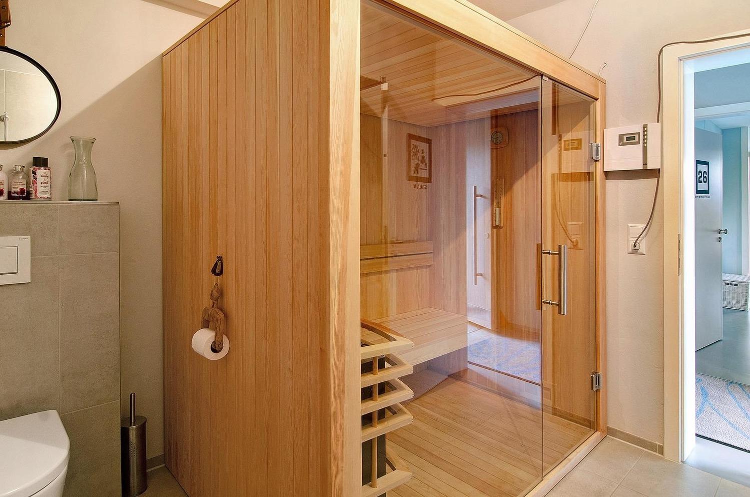 Der gemeinsame mini Wellnessbereich der Ferienapartments mit einer kleinen finnischen Sauna mit Dampfofen dient zum Relaxen, Entgiften und zur Stärkung des Immunsystems.