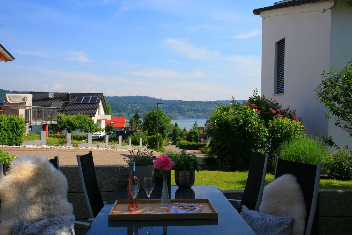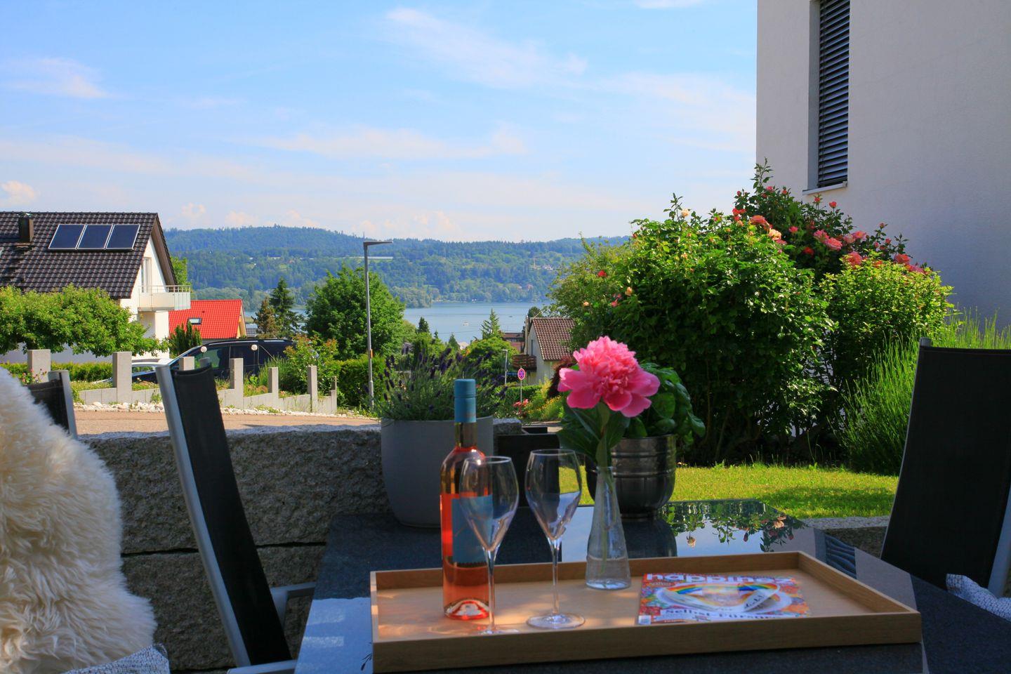 Vom Wohnbereich und der Terrasse genießen Sie einen wunderbaren Blick auf den See – perfekt, um den Tag bei einem Glas Bodensee-Wein oder einem guten Buch ausklingen zu lassen.
