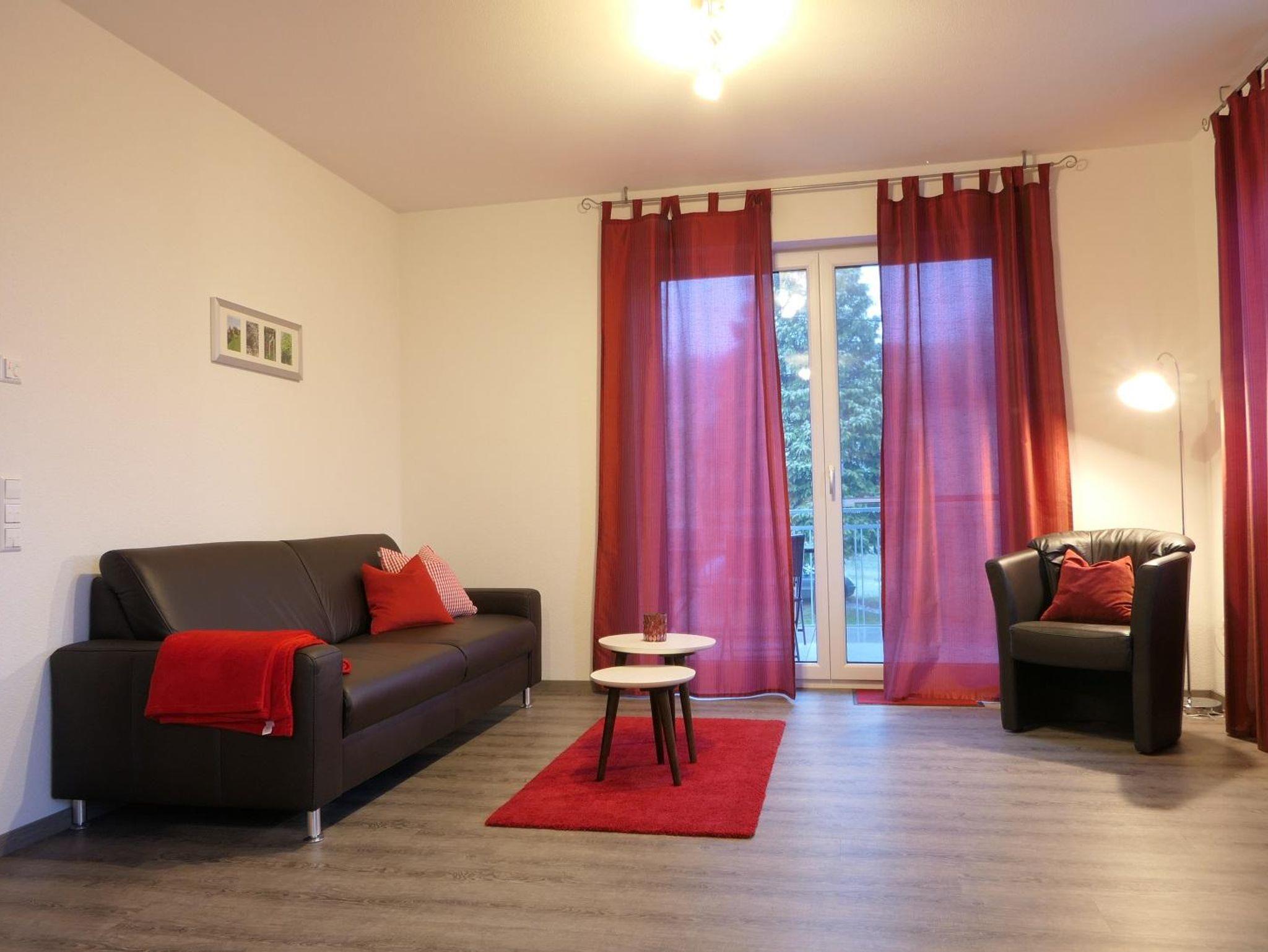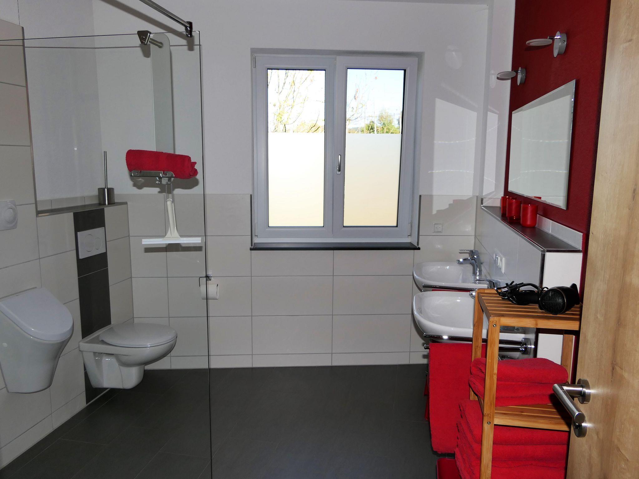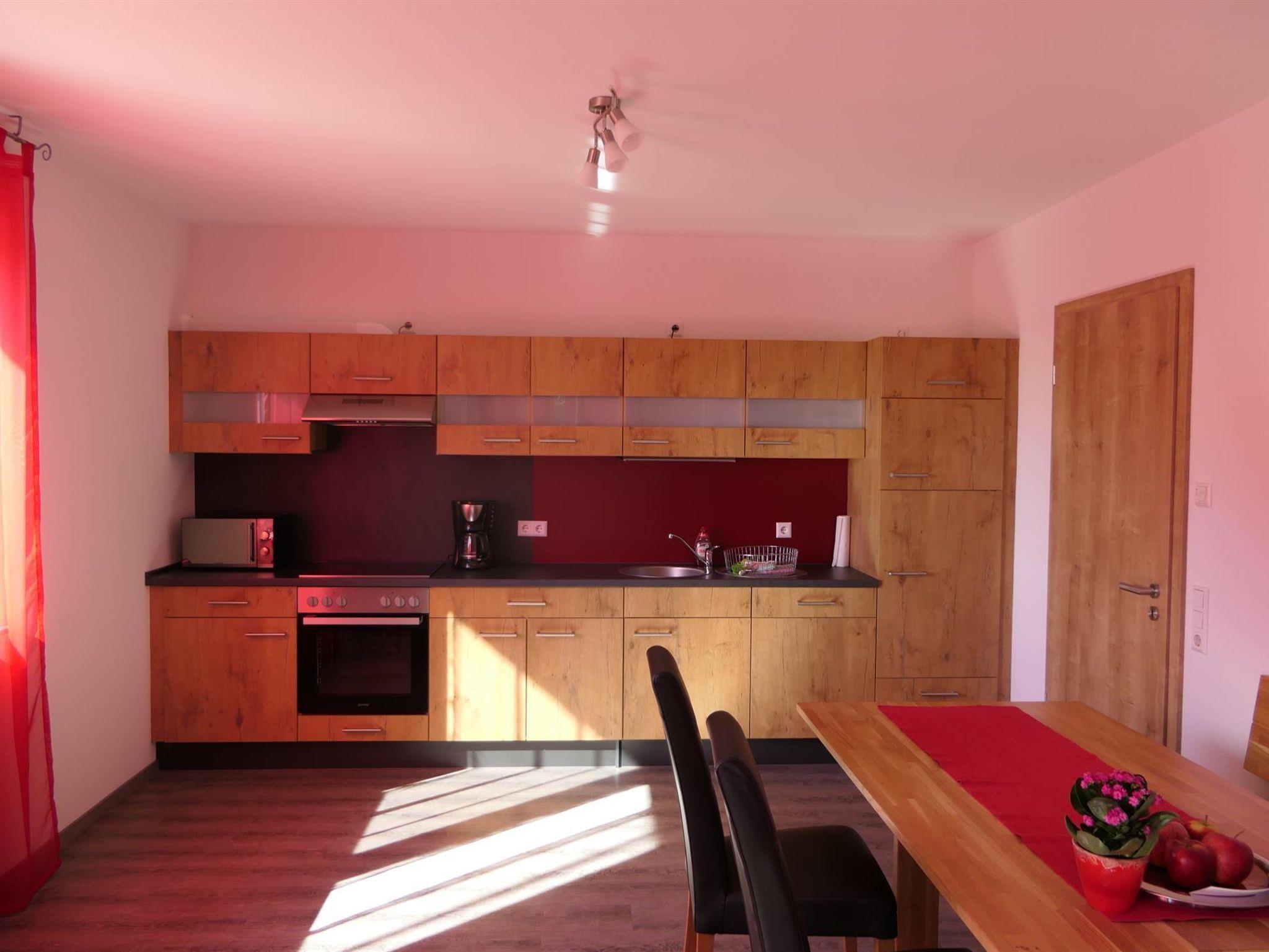 Die Wohnküche ist komplett ausgestattet und der Wohnbereich mit Ledercouch, TV und Kompaktanlage ladet zu gemütlichen Stunden ein - alles ist passend zum Thema roter Apfel eingerichtet. Das große Badezimmer verfügt über eine begehbare Dusche, Doppelwaschbecken und eine separate Toilette. Im OG befindet sich auch ein Aufenthaltsraum.