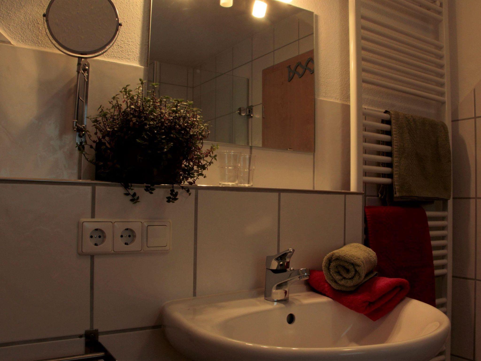 Im Badezimmer mit Außenfenster Dusche, Badewanne und Toilette haben wir Handtücher für Euch bereit gelegt. Seife, verschiedene Hygieneartikel und Toilettenpapier sind für die ersten Urlaubstage vorhanden.