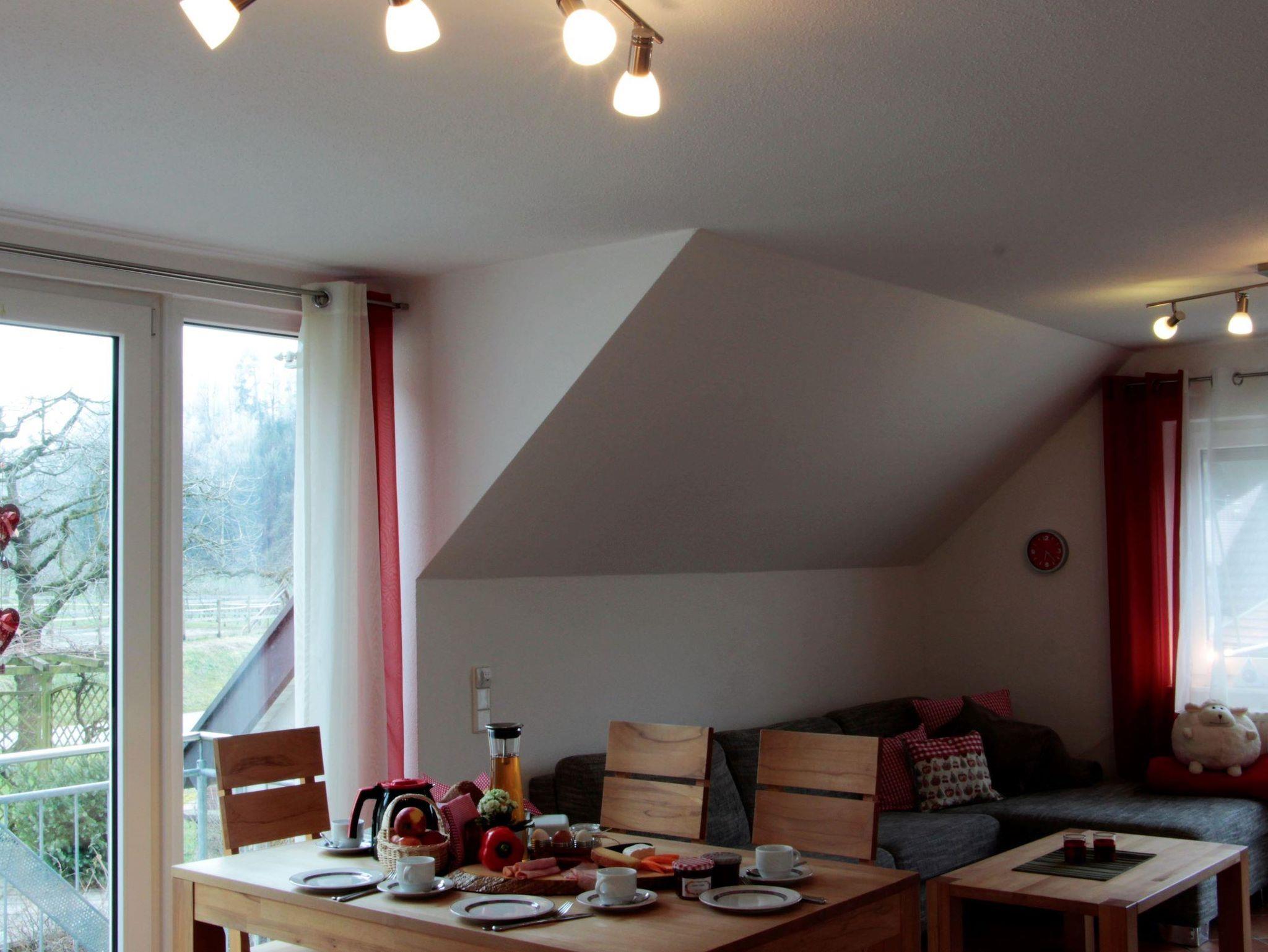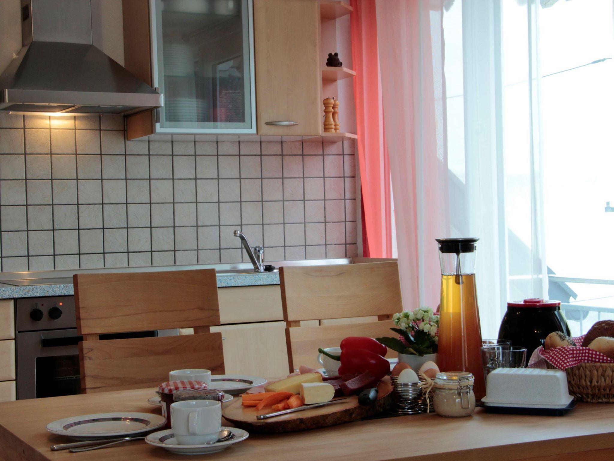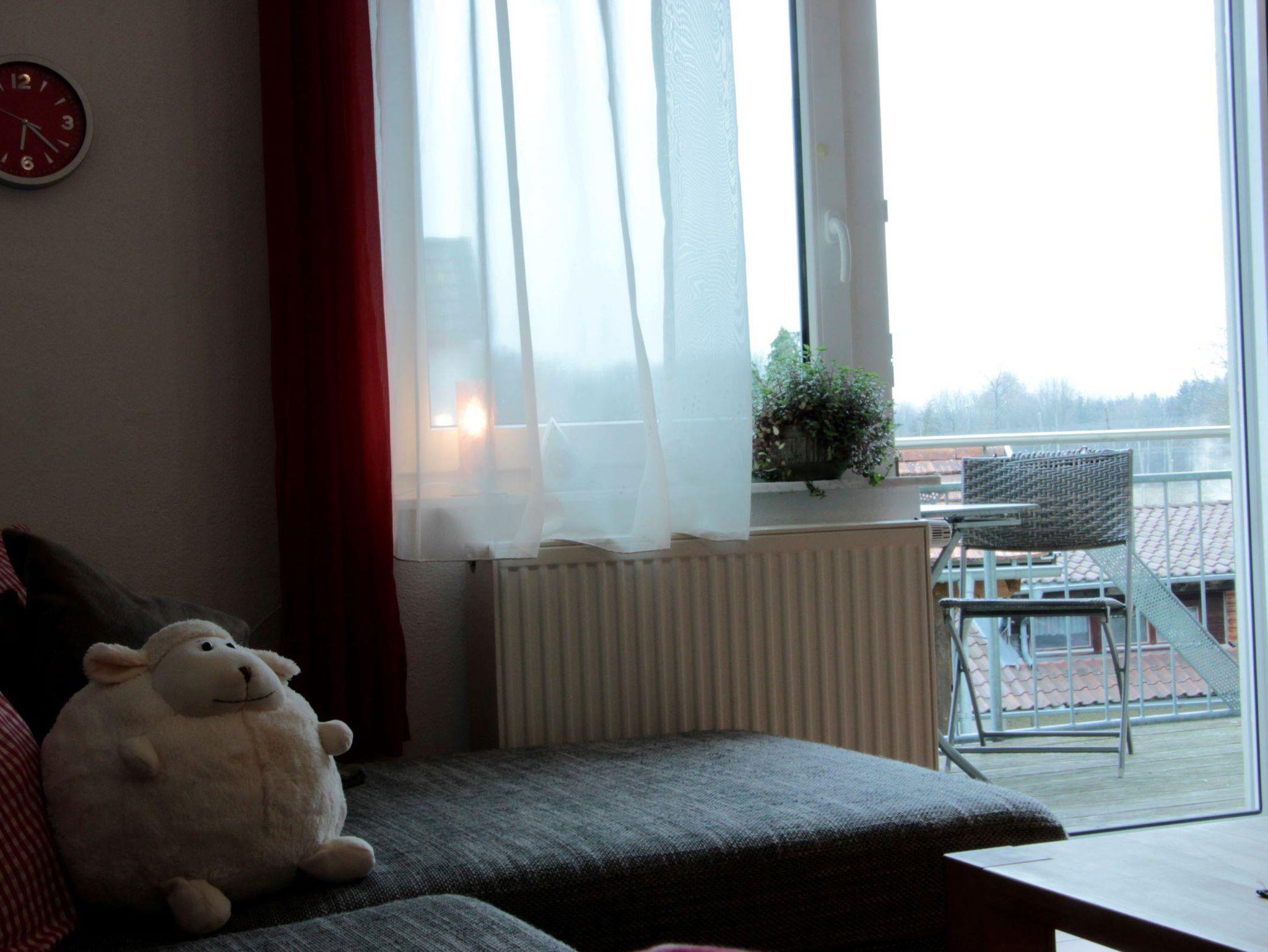Im hellen Wohnbereich mit komplett ausgestatteter Küchenzeile, Echtholztisch, großem Sofa und Balkonzugang genießt Ihr die Morgensonne zum Frühstücken.
