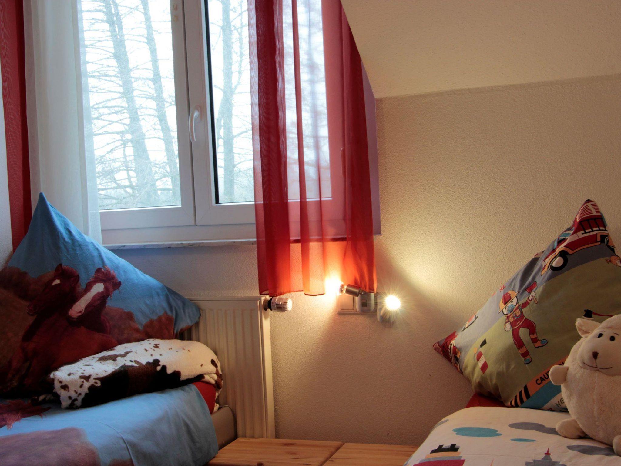 Es gibt ein Doppelschlafzimmer mit Balkonzugang, ein Schlafzimmer mit zwei Einzelbetten plus ein kleines Zimmer ohne Schrank mit Dachfenster, welches für ein Kinderbett oder Klappbett genutzt werden kann. Alle Zimmer lassen sich mit Rolladen oder Jalousie abdunkeln.