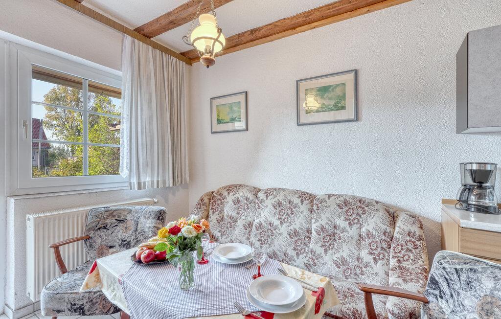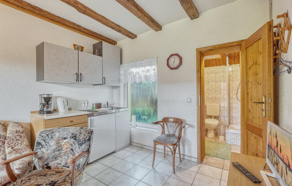 Sommerhuset med to separate boligenheder er beliggende separat og fritliggende på ejerens beboelsesejendom, ca 200 m fra stranden. Denne lejlighed har en stue med polstrede møbler, satellit-tv, en gæsteseng, der kan tilføjes, et tekøkken (tekøkken) med elektrisk kogeplade, køleskab, forskellige køkkenmaskiner, en sovealkove på loftet via en stejl trappe, hver med 2 stk. polstrede liggestole (80 cm brede), Brus/WC og centralvarme. Udstyret er overordnet enkelt og lever ikke op til høje standarder. Der er terrasse, grill og parkeringsplads. Håndklæder skal medbringes. Betales på stedet: spaskat.