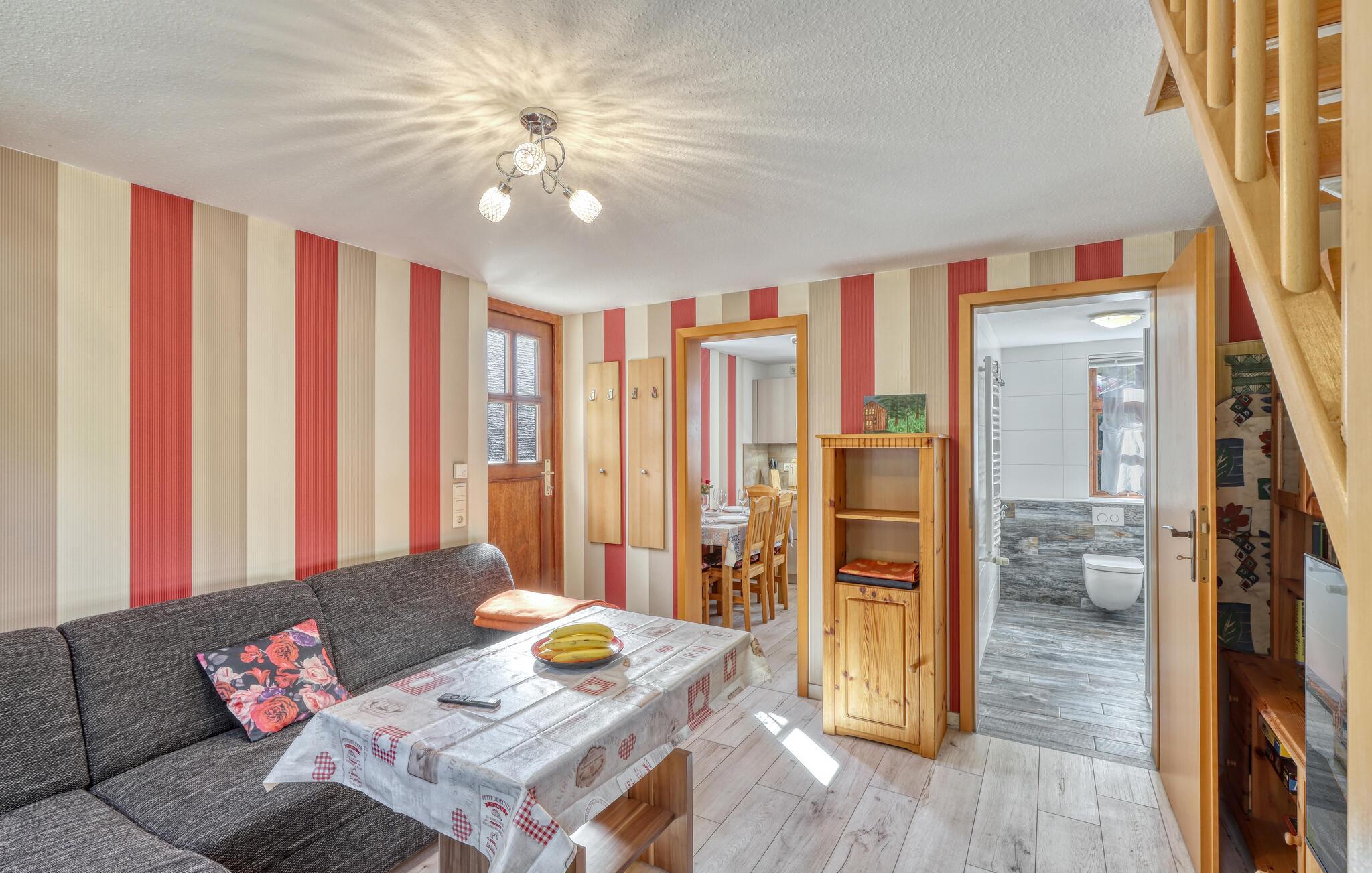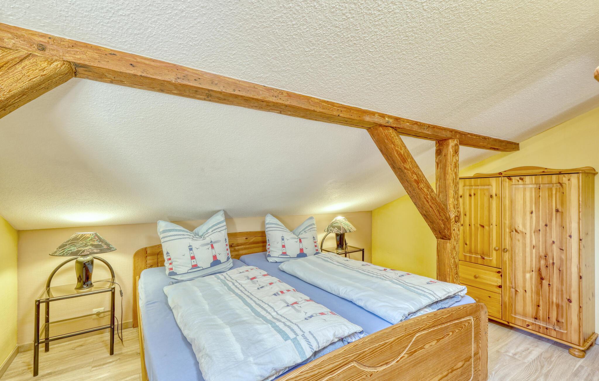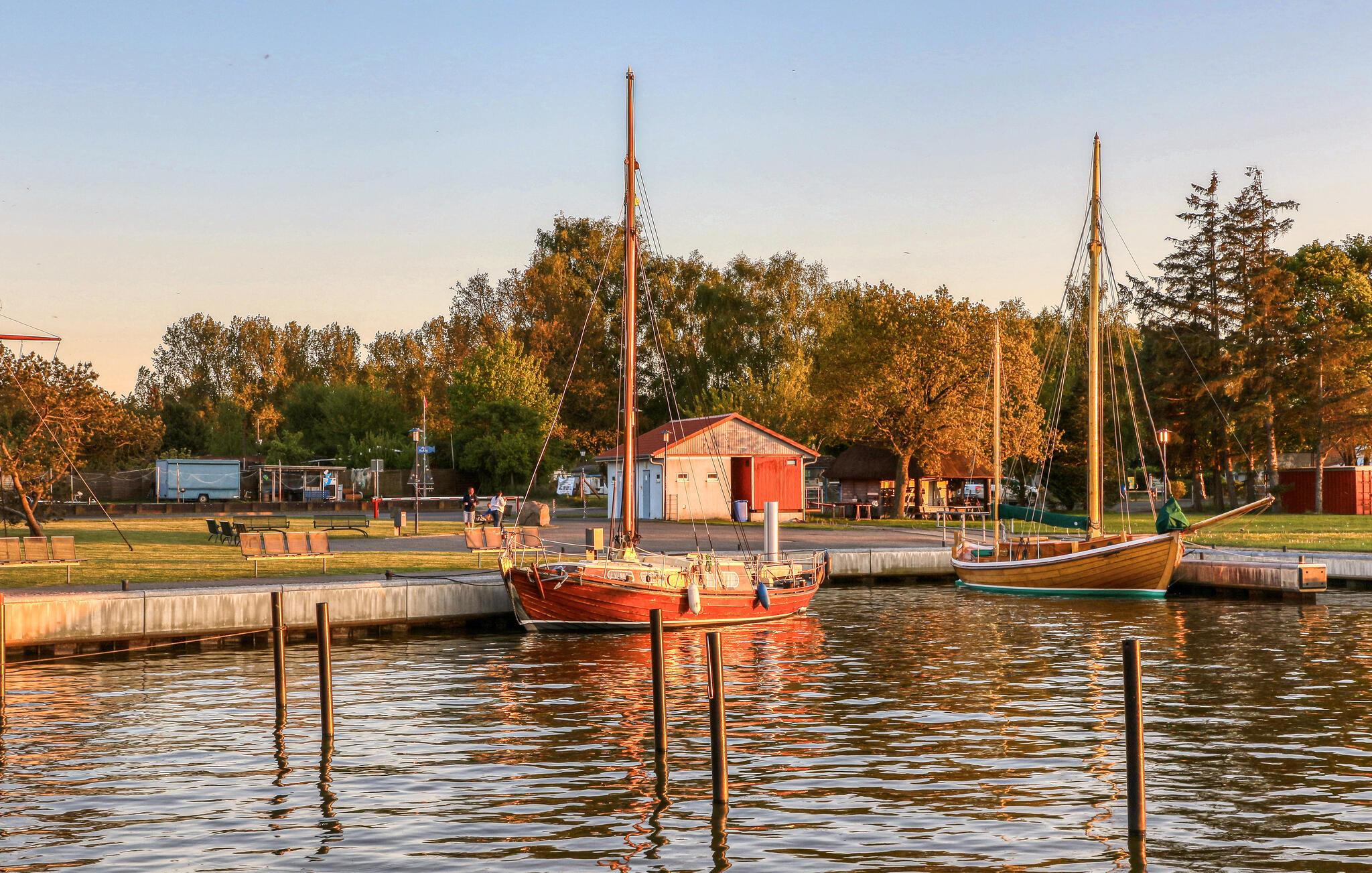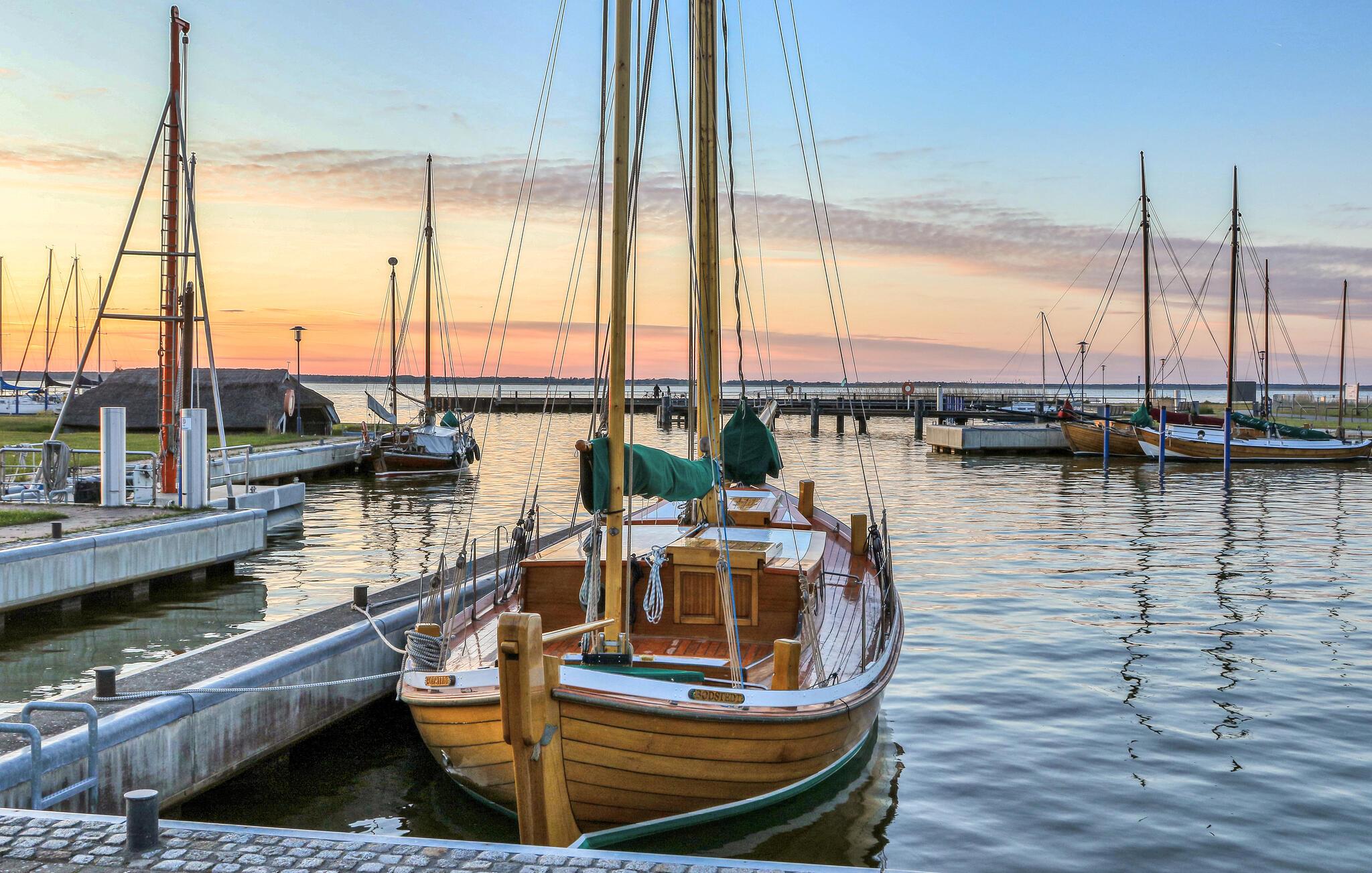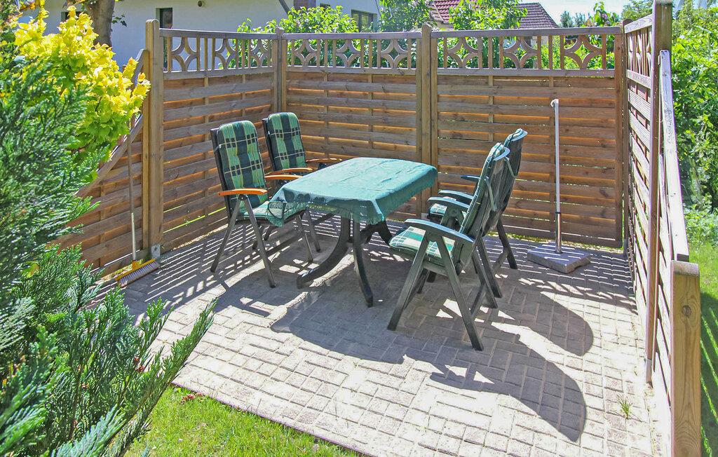 Sommerhuset med de to ferielejligheder er fritliggende på ejerens 2000 kvm store boligejendom, kun 300 m fra Bodstedt havn. Ejeren er kun lejlighedsvis på stedet af professionelle årsager. Denne lejlighed er udstyret med en stue (polstrede møbler, fladskærms-tv, radio), et køkken (elkomfur med ovn, køleskab med fryser, mikroovn, diverse køkkenmaskiner), 2 soveværelser på øverste etage via stejle trapper ( 1 x dobbeltseng, 1 x sammenklappelig seng) samt bad/toilet og centralvarme. En barneseng og høj stol kan stilles til rådighed for små børn. Loftshøjde på øverste etage ca 2,10 m. Der er møbleret terrasse, grill, WiFi og parkeringsplads til rådighed. Den samlede pris inkluderer slutrengøring samt vand- og energiforbrug. Sengelinned og håndklæder kan medbringes eller lejes på stedet. Kæledyr er tilladt i denne ejendom. Betales på stedet: spaskat. Bodstedt ligger syd for halvøen Fischland - Darß - Zingst på Bodstedter Bodden. Der er cirka 7 km til Østersøstranden i Østersøferiestedet Zingst og cirka 4 km til den lille by Barth. Byen har restaurant, havn med passagerfart, cykelstier og strand. Zees bådture og surfing skole på Bodden muligt. Ridemuligheder ved flere ridestalde i området. Fordi den lokale laguneregion er en af de største trækfugles rastepladser i Europa, tilbyder den de bedste betingelser for fuglekiggeri.