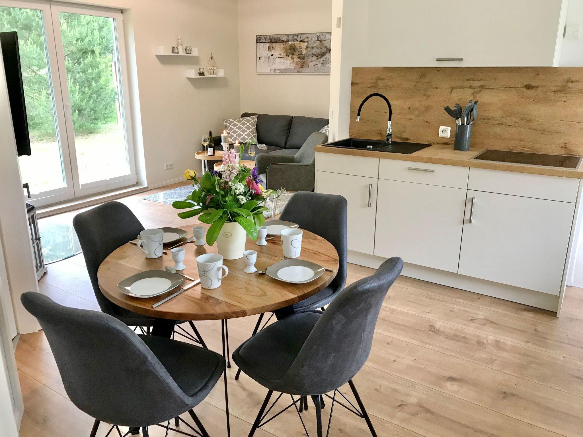 On a living area of approx. 60 m², you will find a living and dining room with a wood-burning stove, infrared heating, couch & armchair, 50" flat-screen TV and a dining table for 4 people in this holiday home. The large windows offer a marvellous view of the surrounding natural garden.