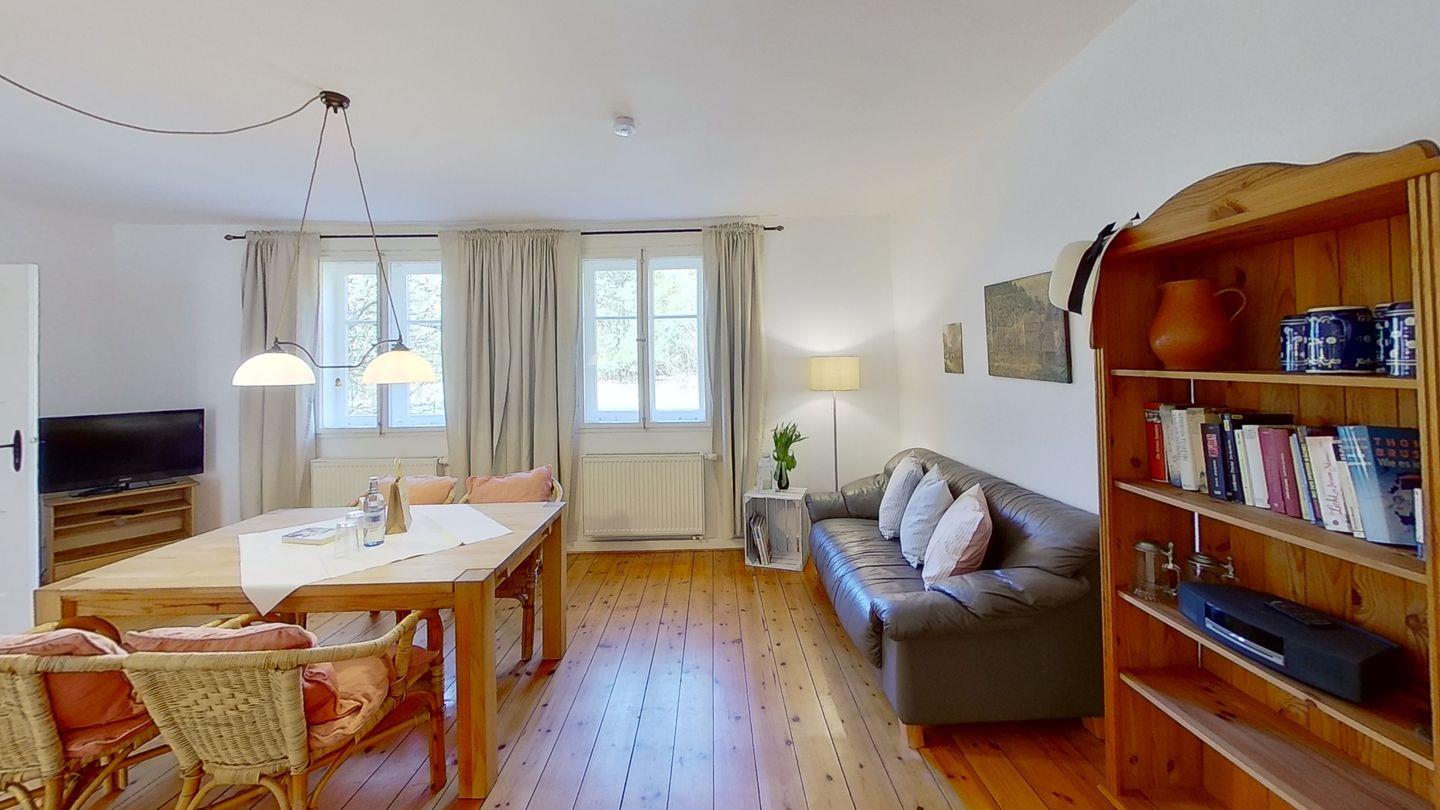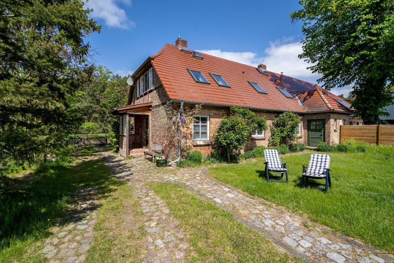 Unmittelbar am Eingang zum Müritz-Nationalpark liegt die Ferienwohnung "Am Wald" im Erdgeschoss eines idyllischen Fachwerkhauses von 1890, umgeben von einem über 3.000 m² großen, umzäunten Gartengrundstück. Die Wohnung verfügt über 2 Schlafimmer, Wohn- und Essbereich, Küche, Zentralheizung, Holzdielen, Massivholzmöbel und ist sehr gemütlich eingerichtet. Wichtig: bedenken Sie, dass das Badezimmer nur über das Hauptschlafzimmer zu begehen ist. Der großzügige Garten mit einfacher Sitzecke am Haus oder wo auch immer Sie im Garten mögen darf erkundet werden. Hier finden Sie absolute Ruhe und Entspannung vom Alltag. Fliegengitter und WLAN gehören zur selbstverständlichen Ausstattung. Die obere Wohnung wird manchmal von den Eigentümern selbst genutzt.