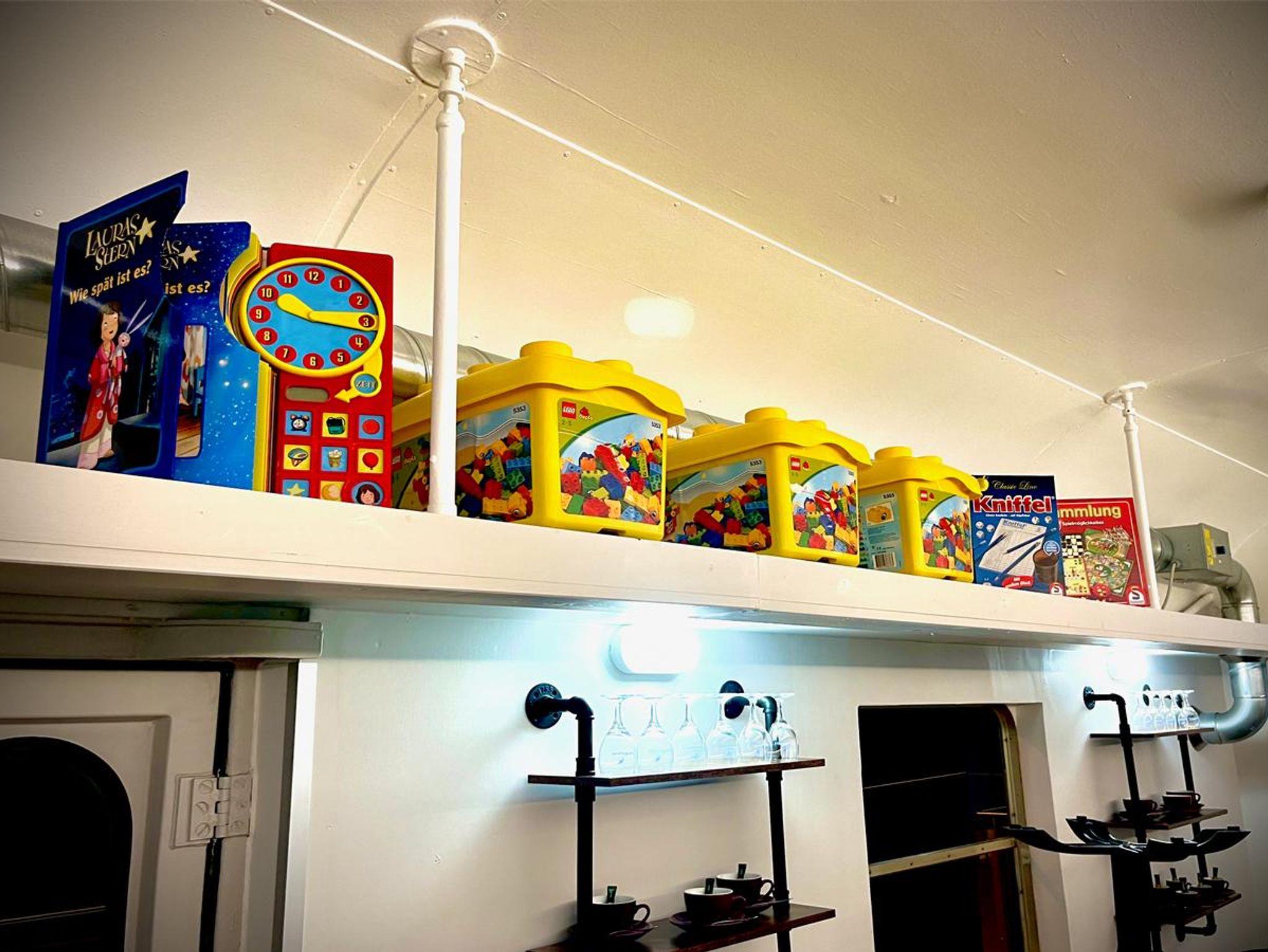Bücher und Kinder Bücher, verschiedene Familienspiele, Legosteine ,Verschiedene Kartenspiele , Spielesammlungen, Kniffel Becher sind für den Familien Spaß vorhanden!