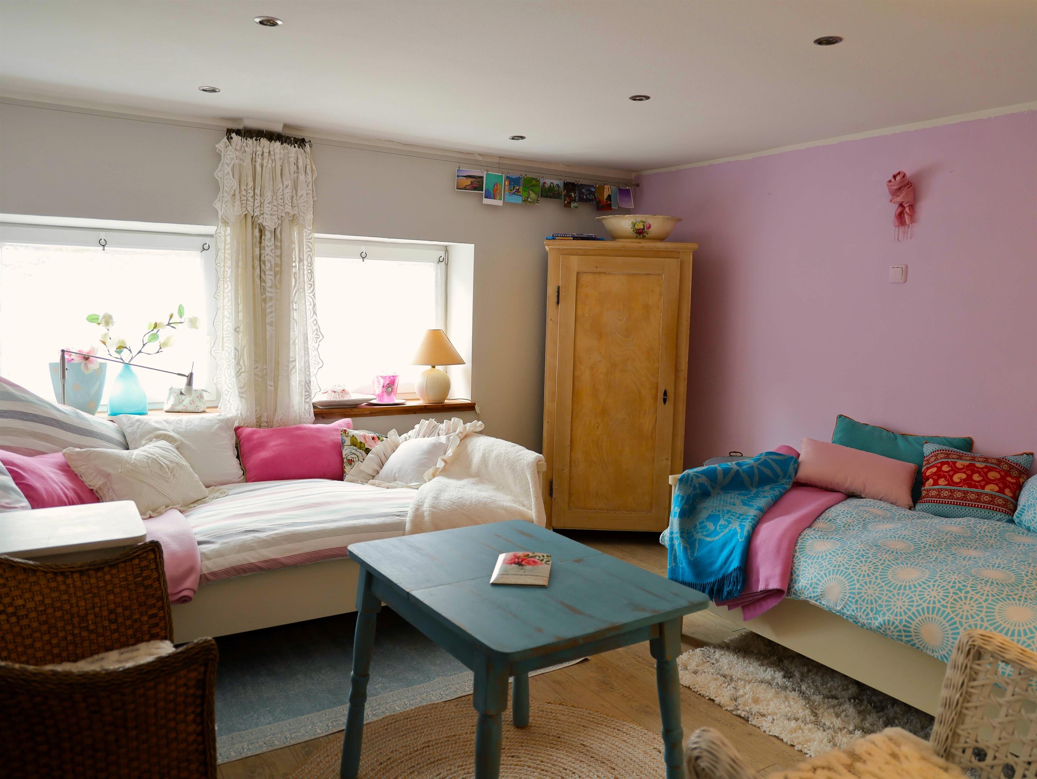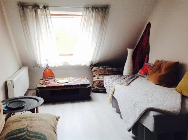 Der Gästebereich befindet sich in der ersten Etage meines Hauses. Auf Wunsch kann ein weiteres Zimmer mit zwei Schlafgelegenheiten in der zweiten Etage hinzu gebucht werden. Erreichbar ist das Dachgeschoss über eine schmale Raumspar-Treppe!