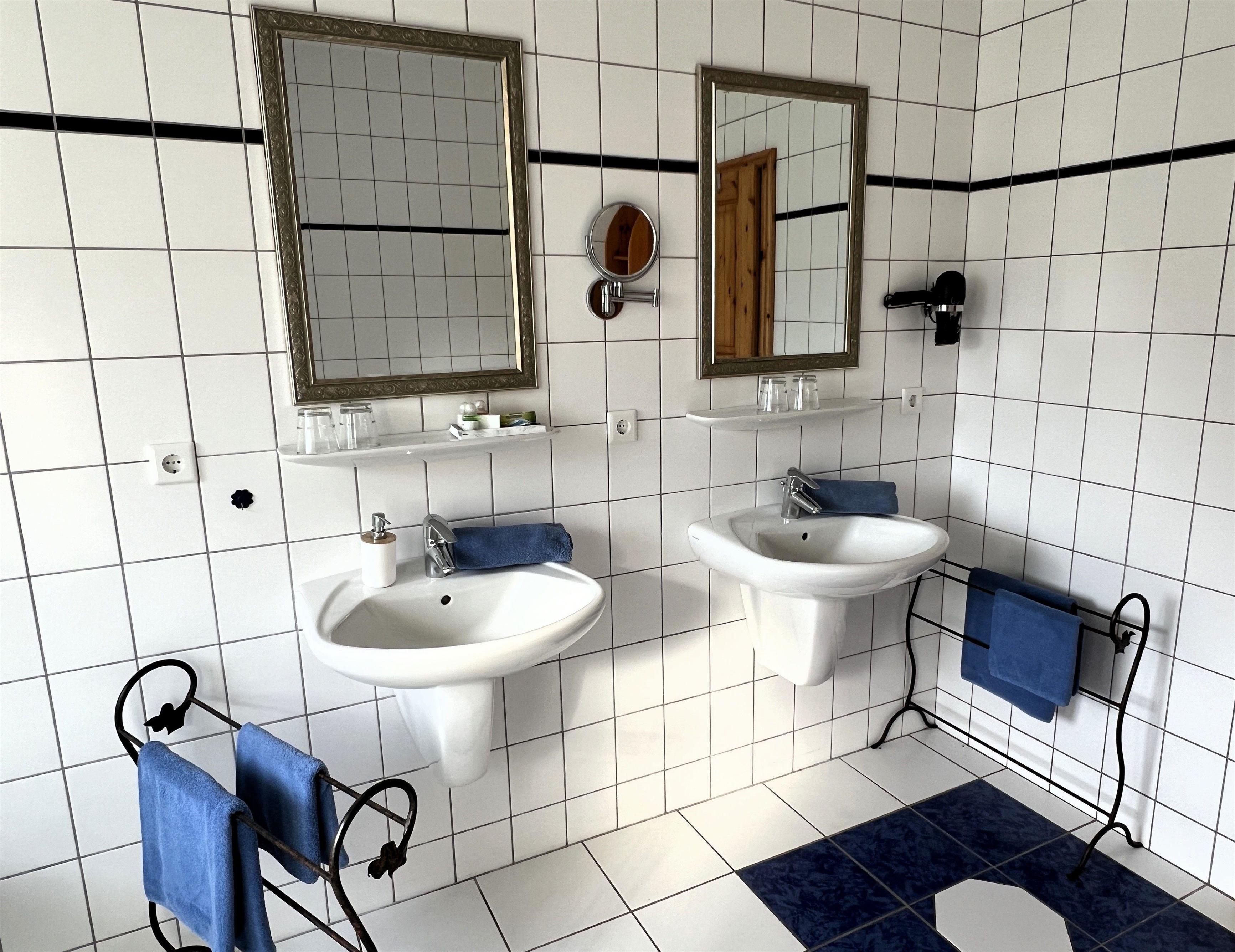 Weiterhin hat die Ferienwohnung ein Badezimmer mit Dusche, Badewanne und zwei separaten Waschbecken. Es gibt insgesamt zwei Schlafzimmer, von denen ein Schlafzimmer mit einem großen Doppelbett (1,80 m x 2,00 m) und geräumigen Kleiderschrank (inklusive Safe) und das andere Schlafzimmer, besonders gut geeignet als Kinderzimmer, mit drei Einzelbetten (0,90 m x 2,00 m), einem Babybett mit Wickeltisch, zwei Kleiderschränken, einem zusätzlichen TV mit DVD-Player sowie einer Mal- und Spielecke ausgestattet ist. W-Lan steht Ihnen in der gesamten Ferienwohnung kostenlos zur Verfügung.