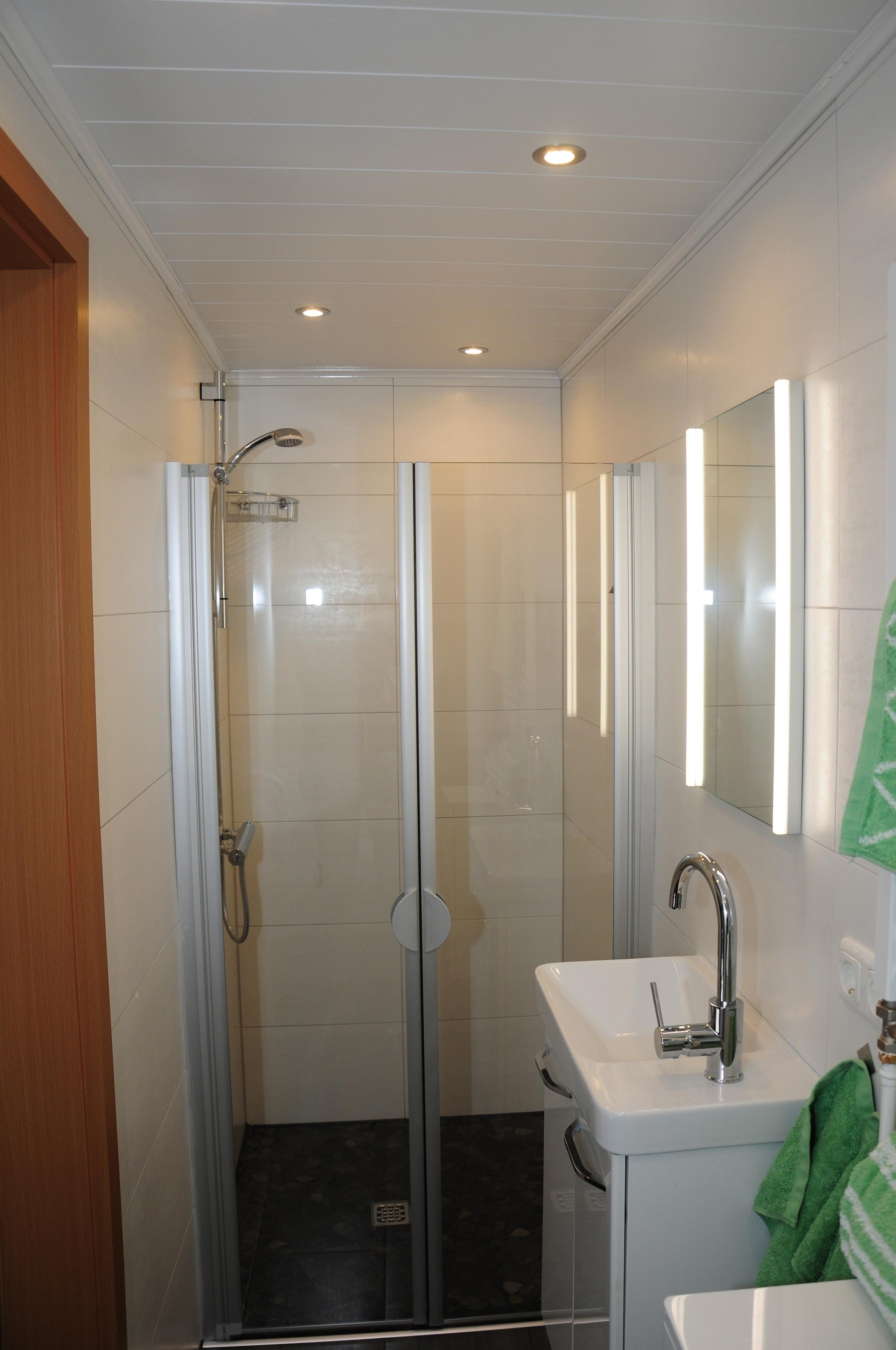 Badezimmer: Modern renoviert mit Dusche, Waschbecken und WC.