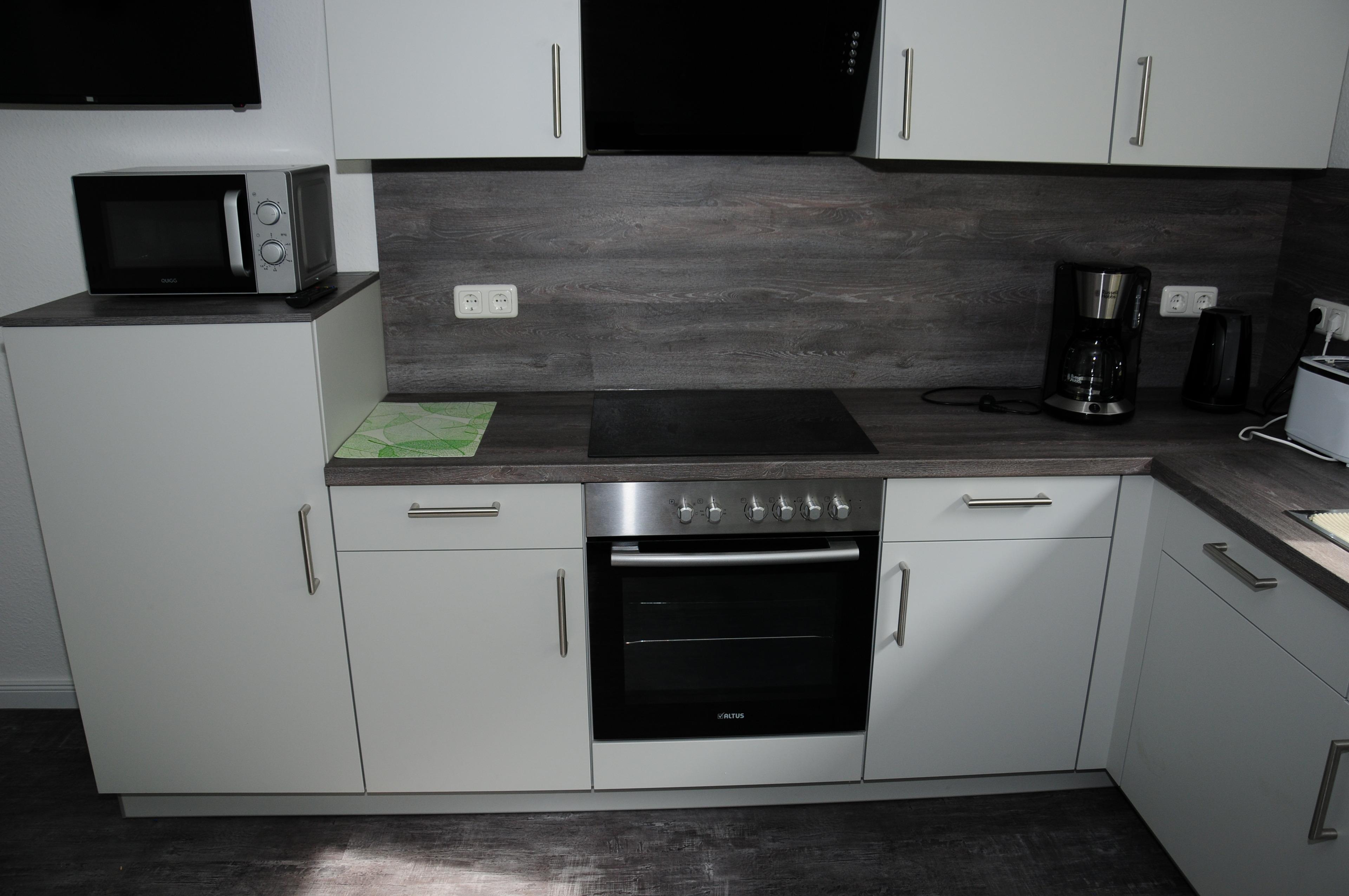Küche: Voll ausgestattet mit Kühlschrank, Geschirrspüler, Herd mit Backofen, Mikrowelle, Kaffeemaschine, Toaster und Wasserkocher. Eine gemütliche Sitzecke mit TV lädt zum Verweilen ein.