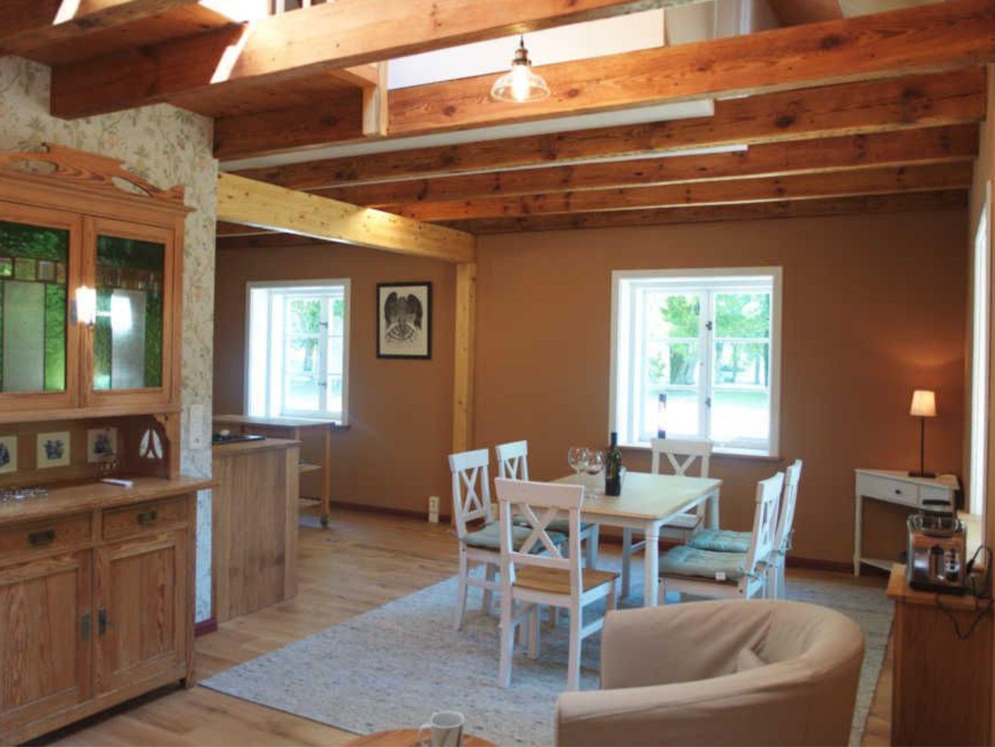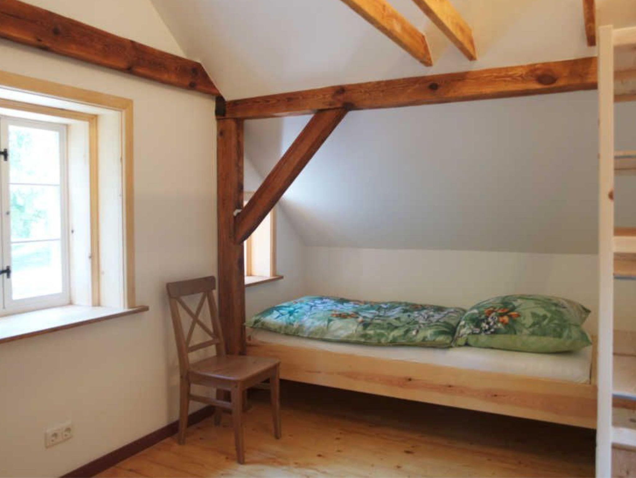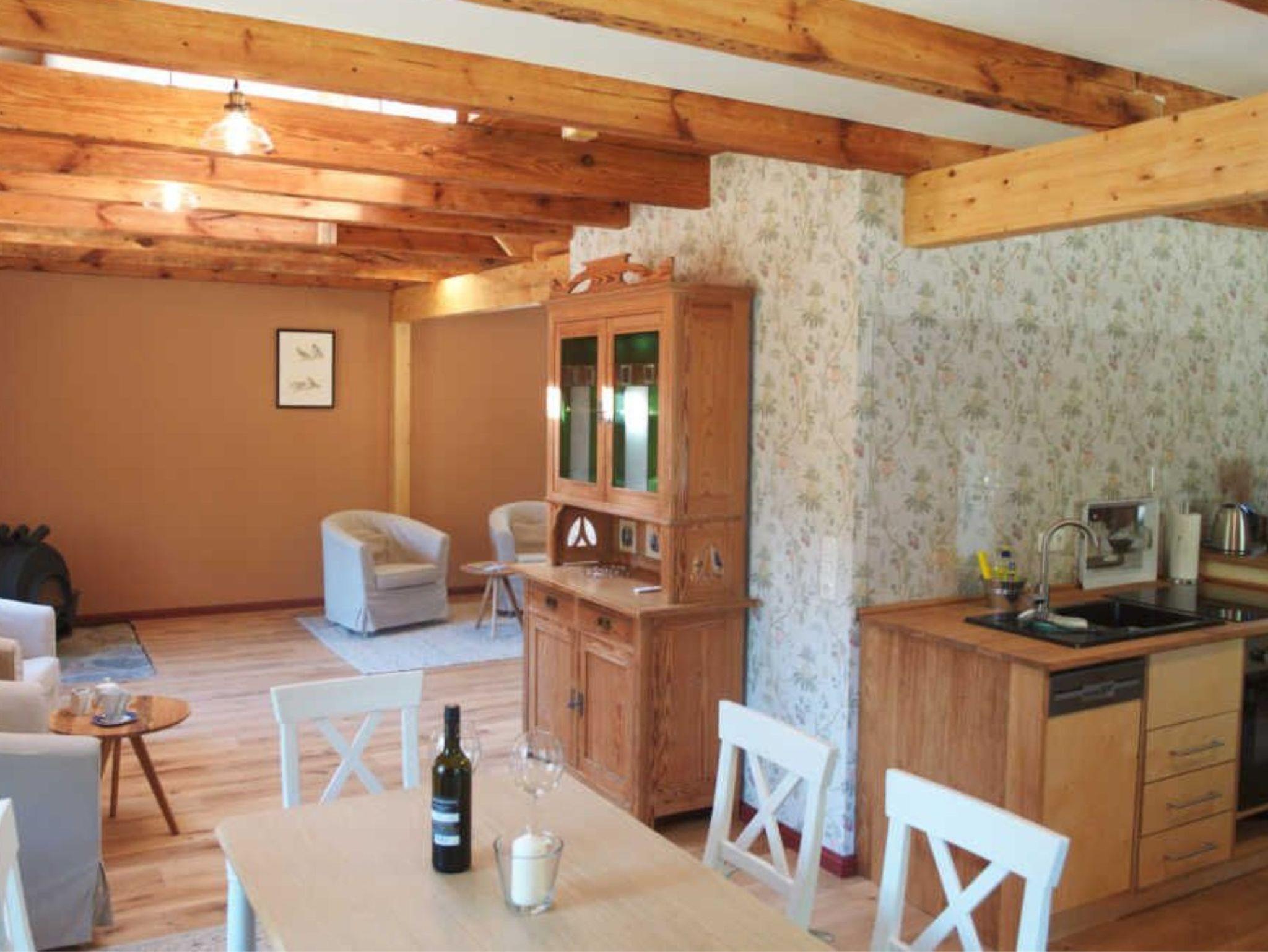 Auf zwei Etagen finden bis zu vier Personen Platz. Im Erdgeschoss erwartet die Gäste ein handwerklich gestalteter maßgefertigter Küchenblock, ein Essplatz, ein geräumiger Wohnbereich mit Kaminofen und ein WC. Im oberen Stockwerk gibt es zwei Schlafzimmer, eines mit Doppelbett, das andere mit zwei Einzelbetten sowie ein Duschbad.