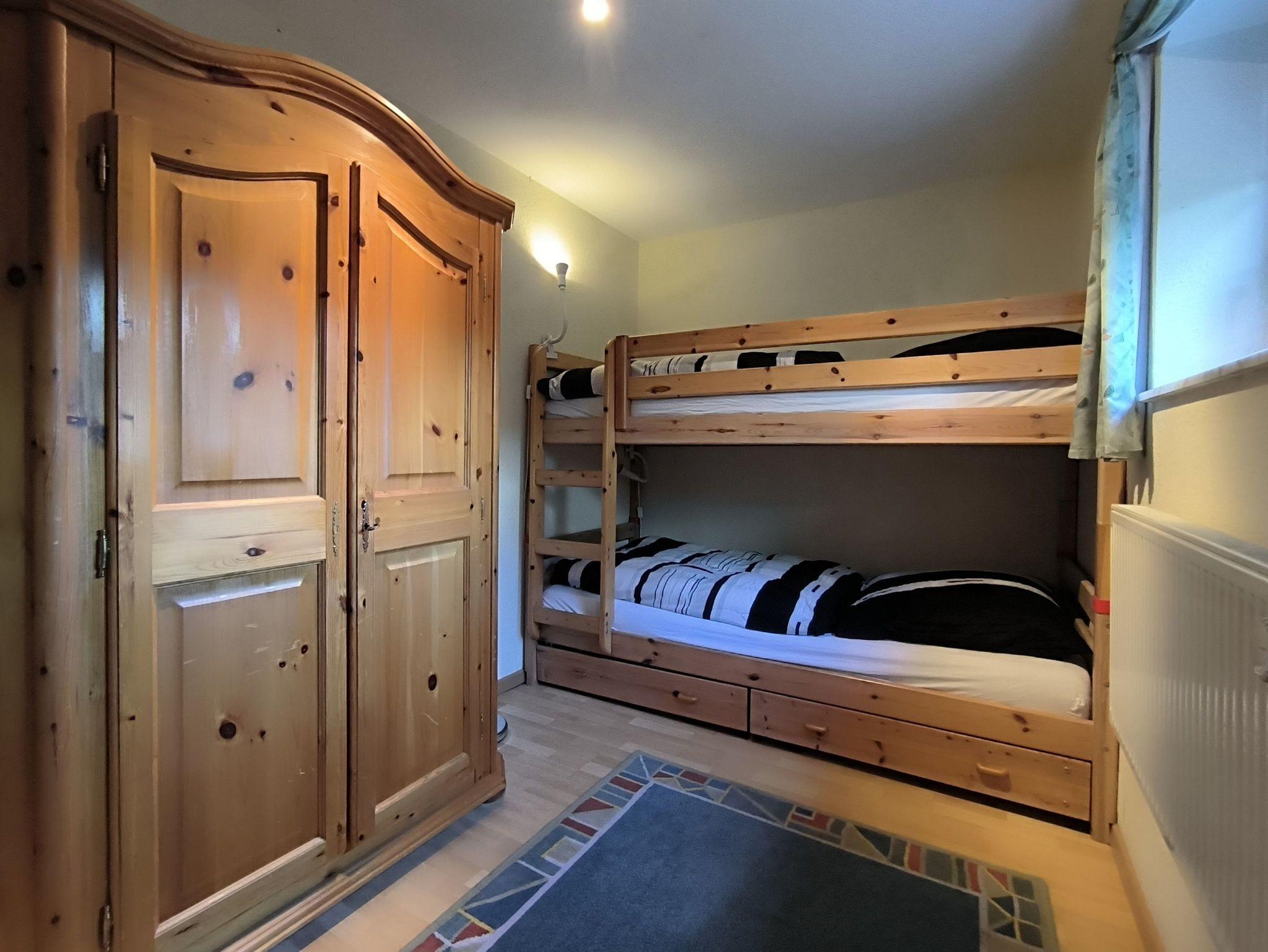 Helle Souterrain-Ferienwohnung über zwei Etagen (90 qm) im kleinen Ort Gammellund mit einem Schlafzimmer mit Etagenbett, einer gut ausgestatteten Küche, einem geräumigen Duschbad (unten), einem Wohnzimmer, einem Schlafzimmer mit Doppelbett und anliegendem WC (oben).
