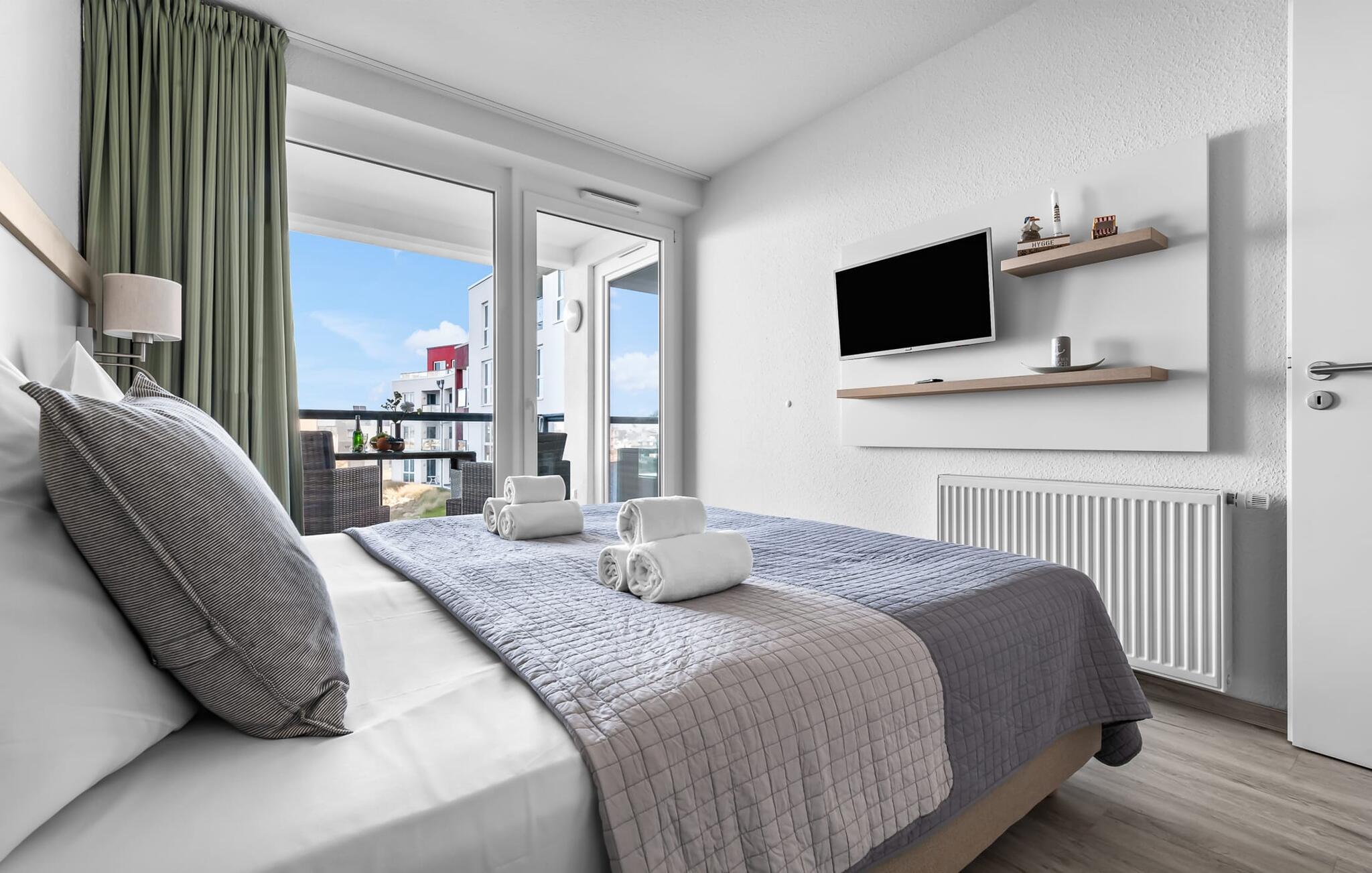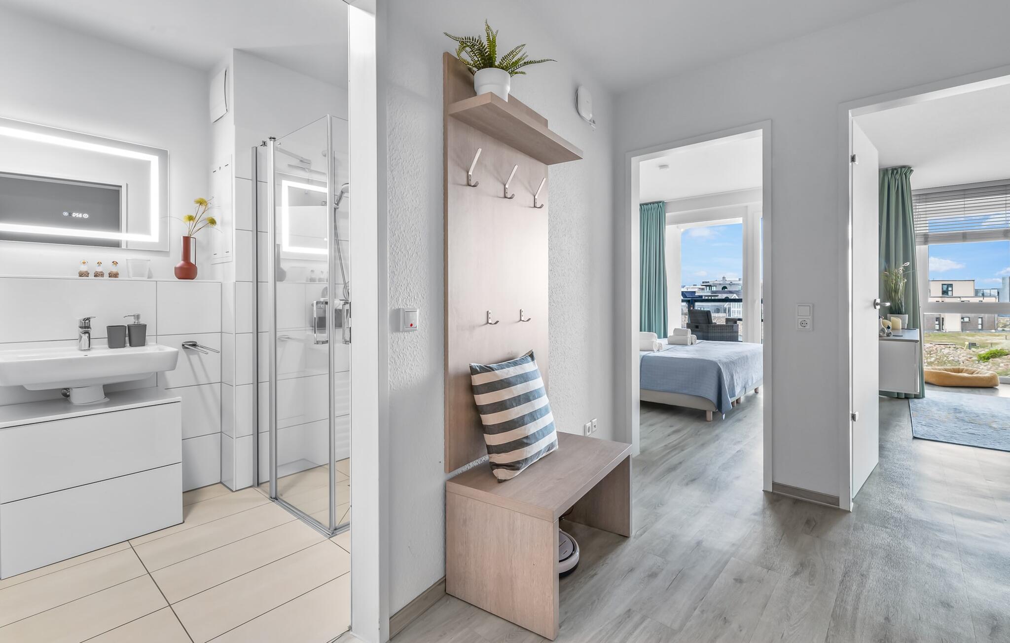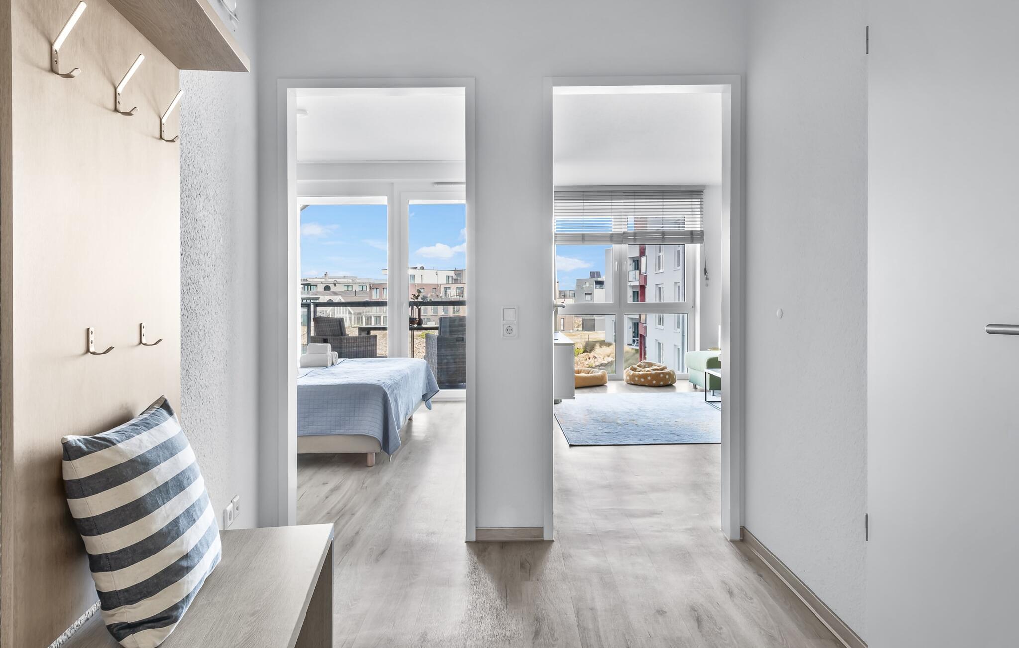 Lejligheden er egnet til op til tre personer, men ideelt egnet til to for at nyde maksimal komfort. Stuens sovesofa (1,60 m x 2,00 m) lægger op til hyggelige aftener. Udsigten fra alle vinduerne i soveværelset og stuen indfanger magien ved Østersøen, mens I glider ind i en verden af ??afslapning. Opholdsområderne er udstyret med fjernsyn, inklusive Sky Sports-kanaler, til jeres underholdning.