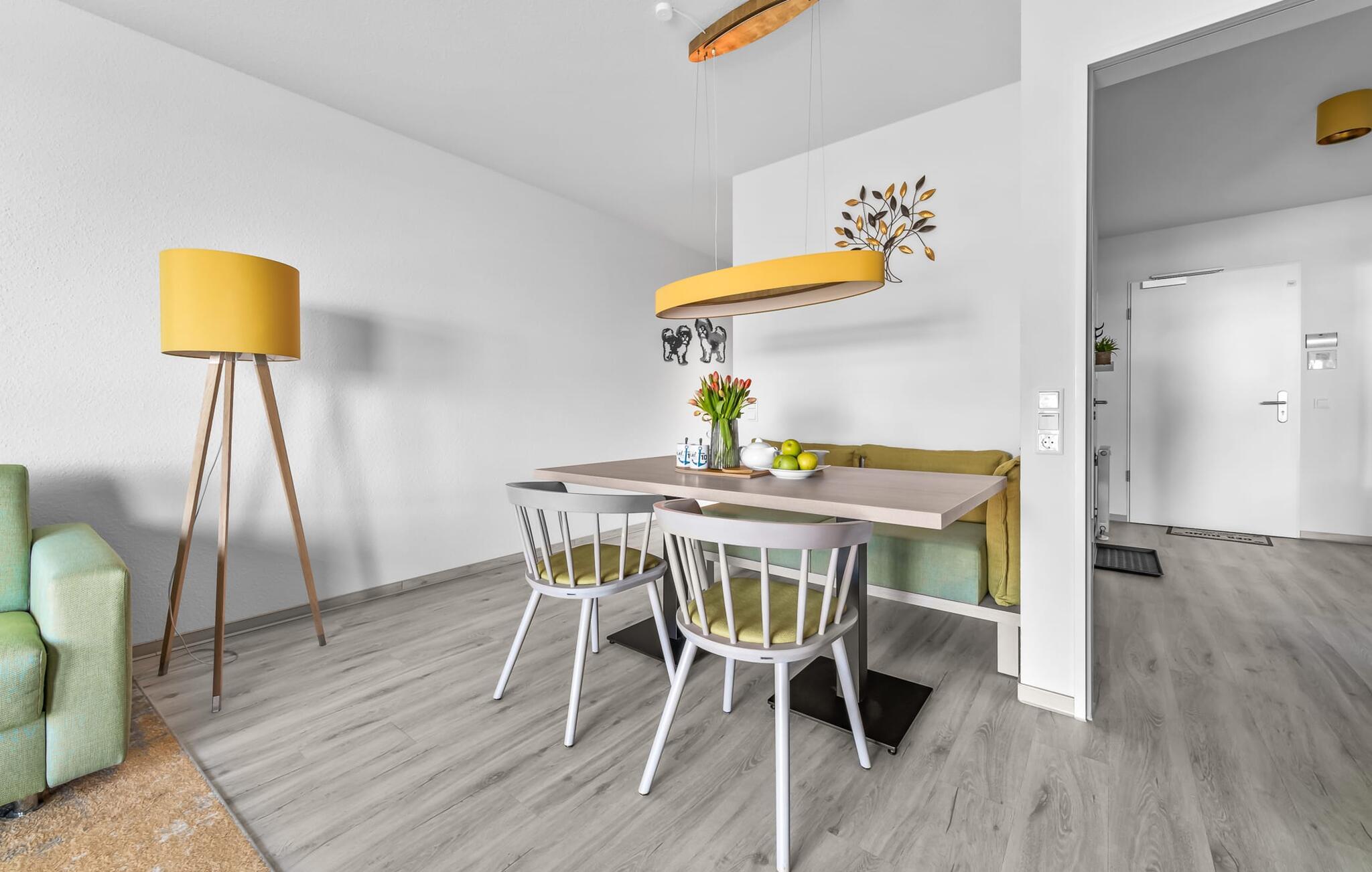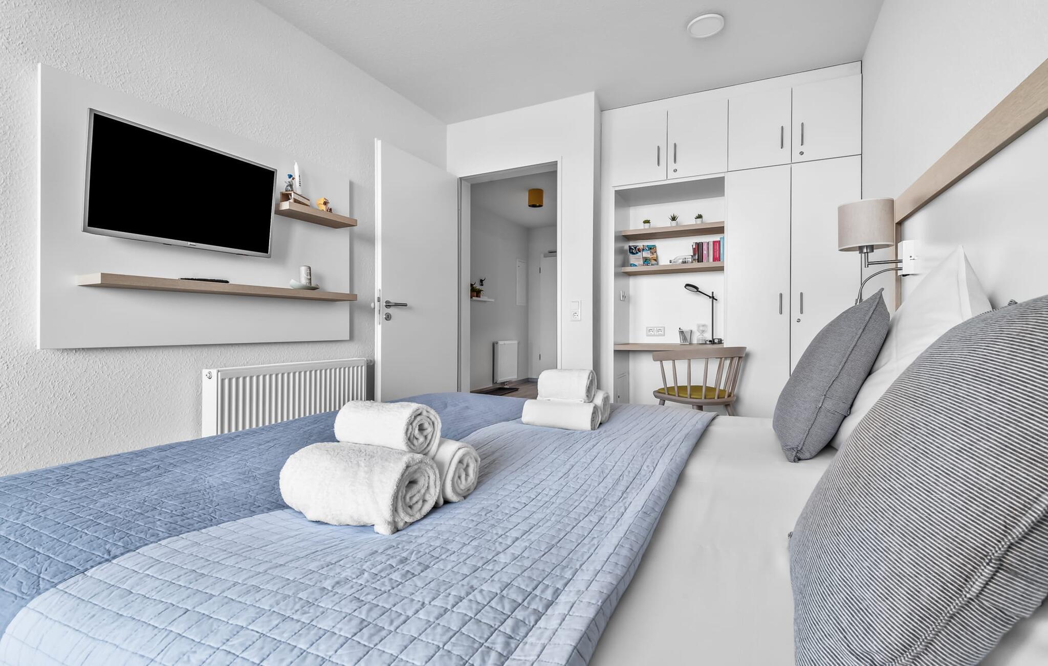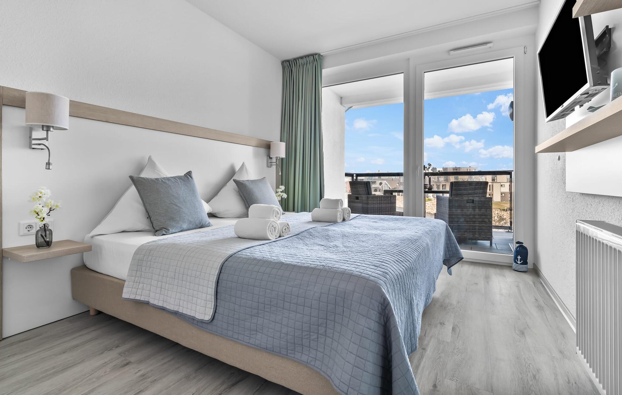 Lejligheden er egnet til op til tre personer, men ideelt egnet til to for at nyde maksimal komfort. Stuens sovesofa (1,60 m x 2,00 m) lægger op til hyggelige aftener. Udsigten fra alle vinduerne i soveværelset og stuen indfanger magien ved Østersøen, mens I glider ind i en verden af ??afslapning. Opholdsområderne er udstyret med fjernsyn, inklusive Sky Sports-kanaler, til jeres underholdning.