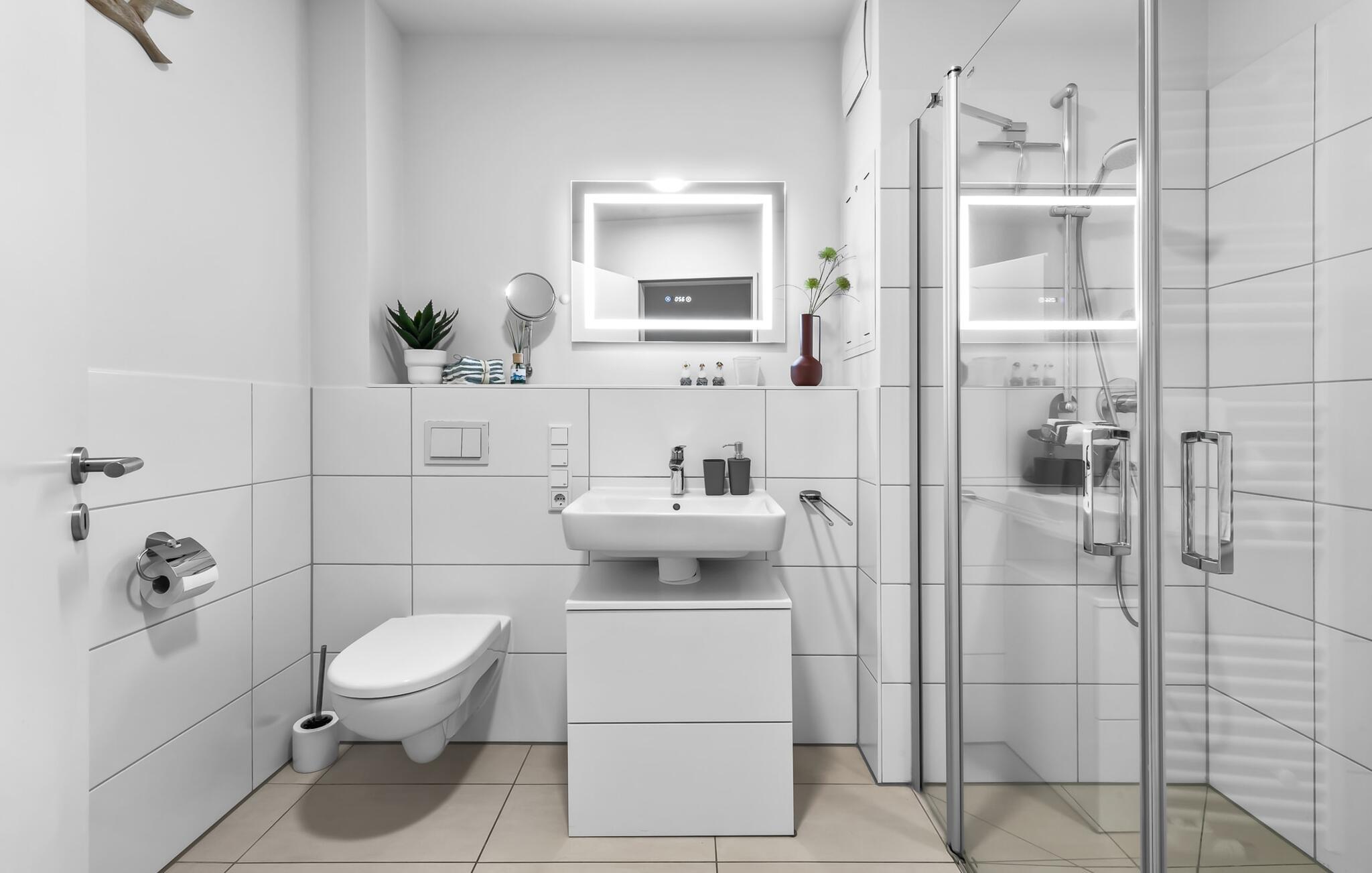 Badeværelset har en bruseniche, mens soveværelset tilbyder et hjemmekontorhjørne, så I kan holde kontakten selv på ferie.