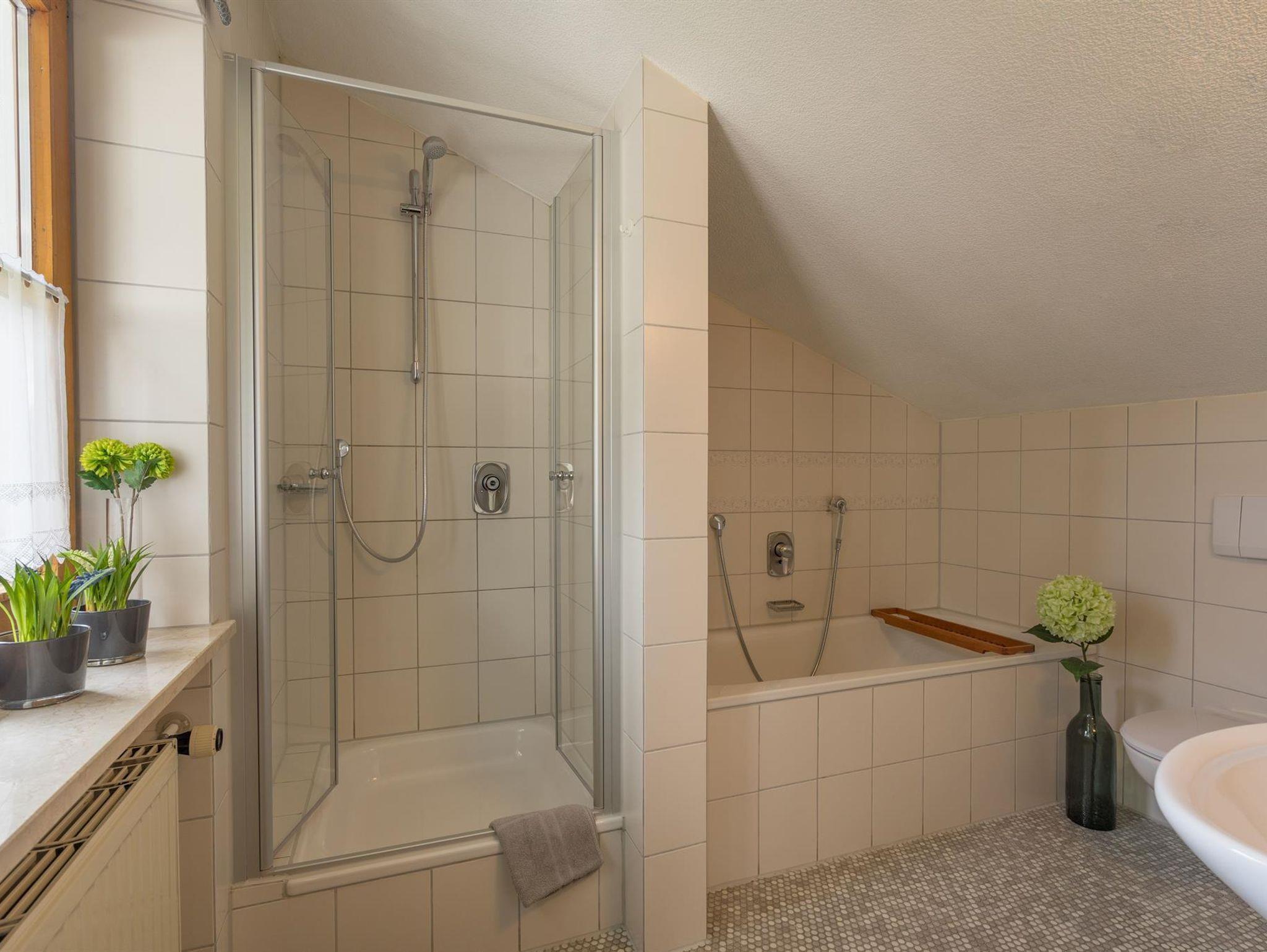 Ferienwohnung mit Süd und Westbalkon. Wohnküche, Wohn-Schlafraum, Schlafzimmer, Bad/DU/WC, Gäste-WC sowie Sat-TV.