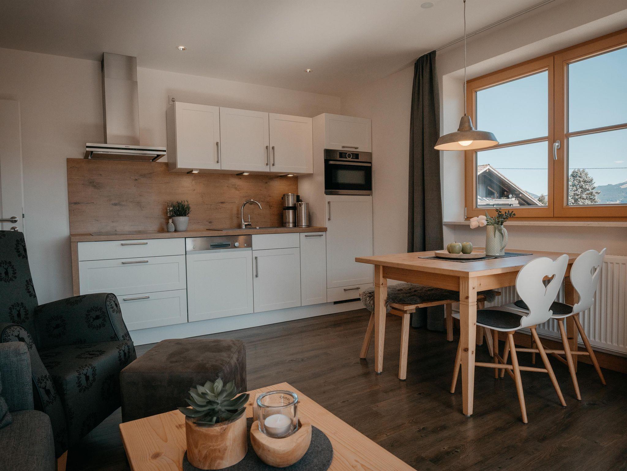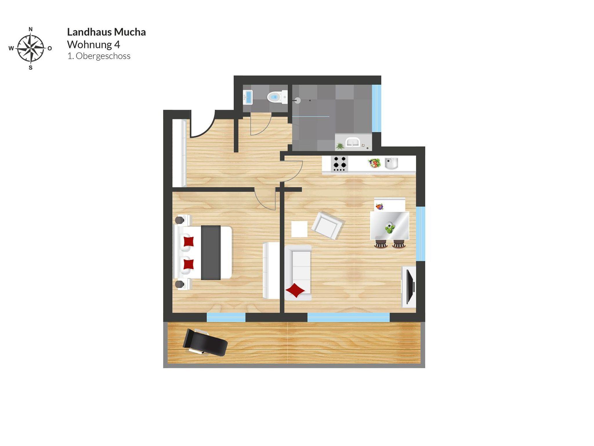 Die Wohnung im 1. Obergeschoss mit 45 m² verfügt über einen Wohnraum mit einer komplett ausgestatteten Küche, einem Esstisch, einer Sitzecke, Sat-TV, ein Schlafzimmer, Südbalkon und ein Bad mit Dusche und einer seperaten Toilette.
