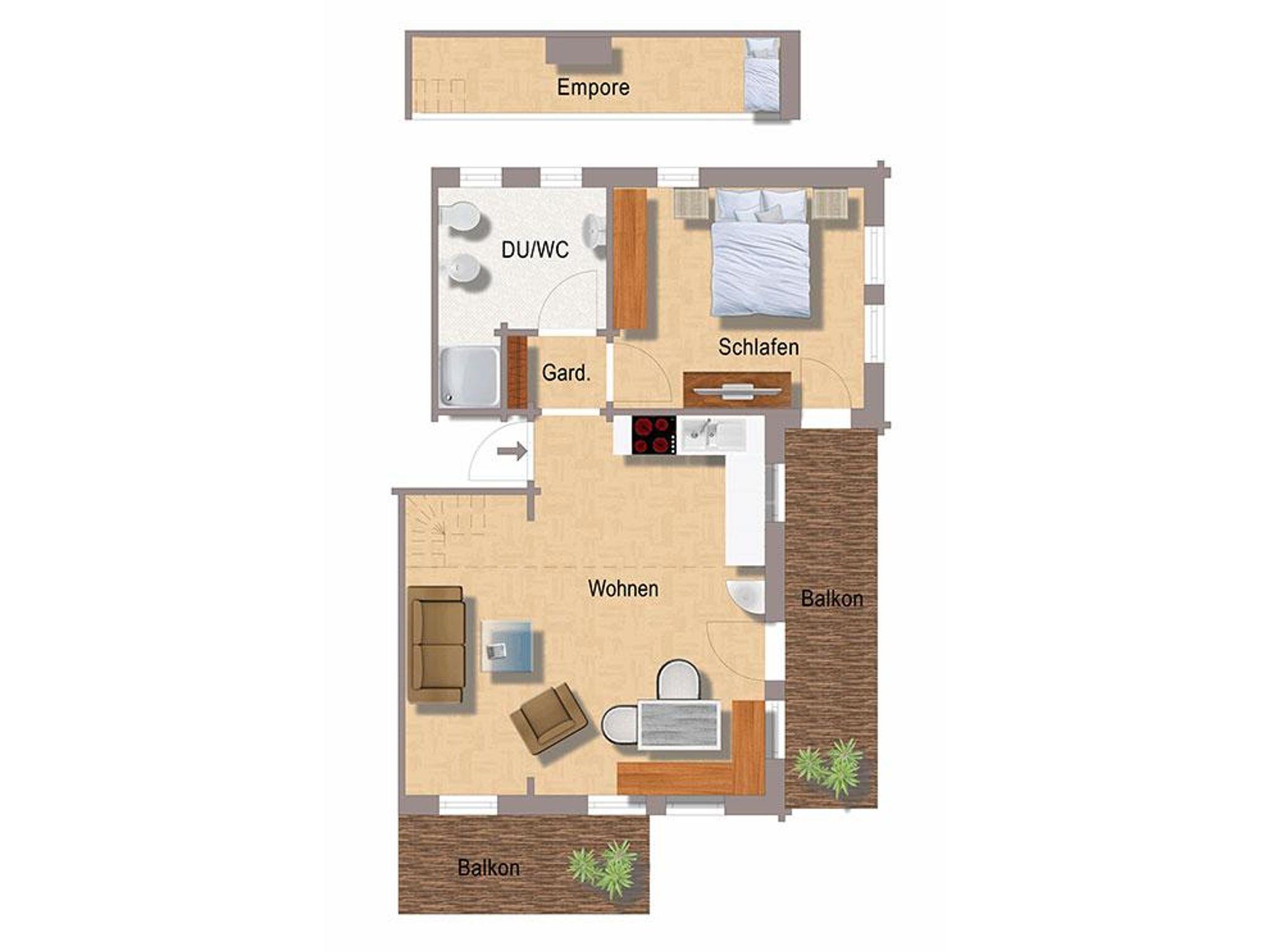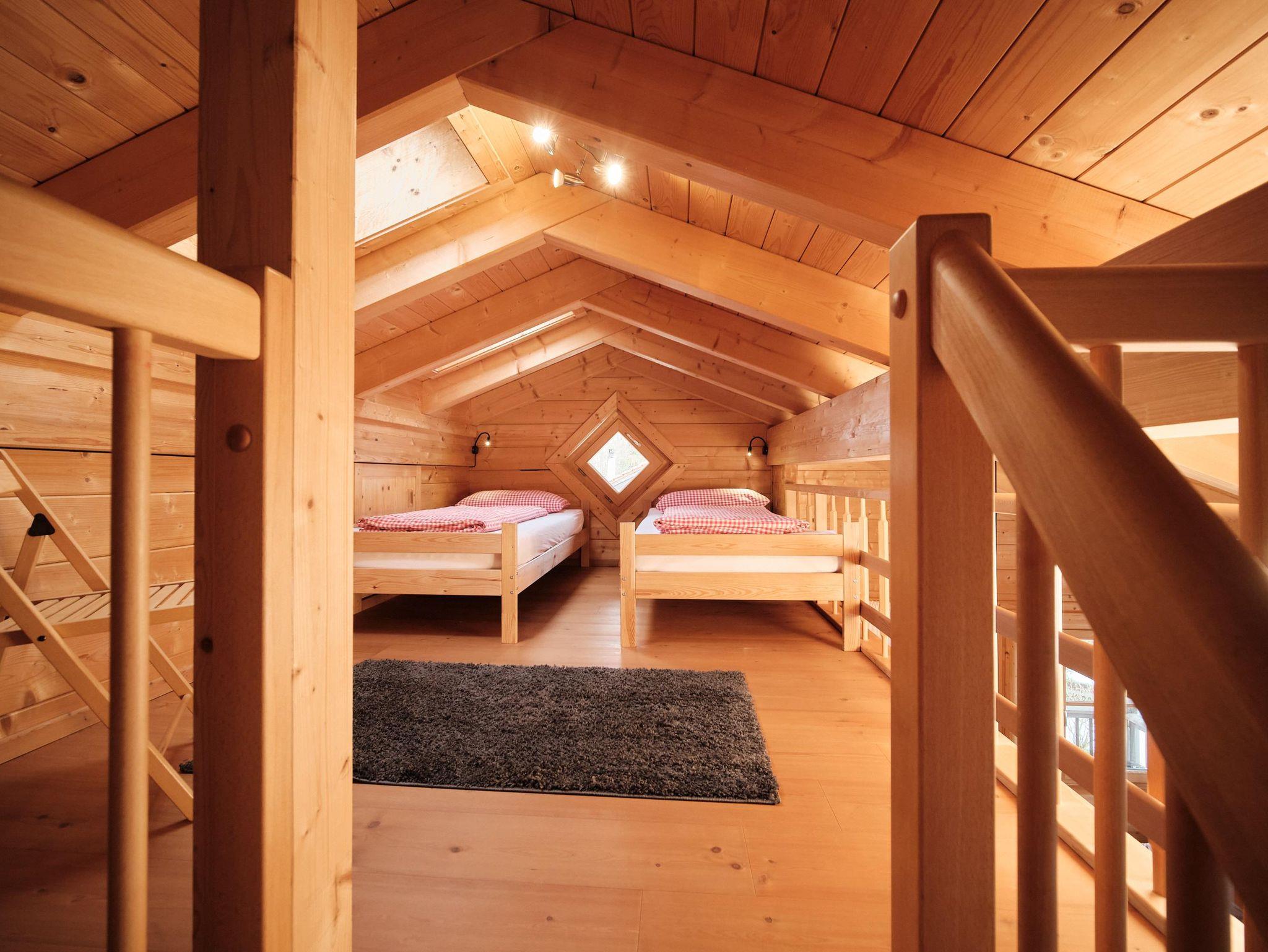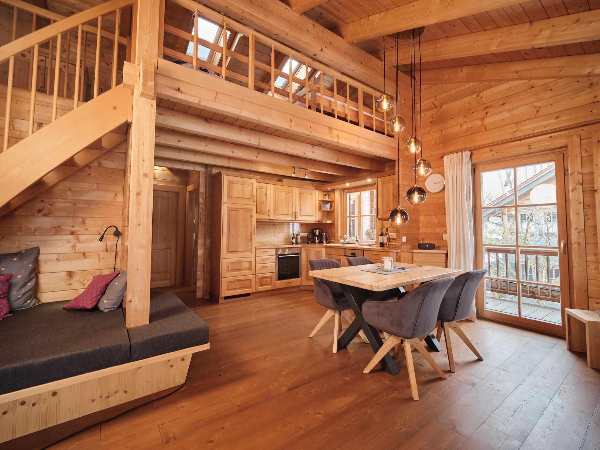Sie hat ein Doppelzimmer, einen großen Wohn-/Hauptraum mit einer top ausgestatteten Küche und einer Schlafgalerie mit 2 weiteren Einzelbetten.
