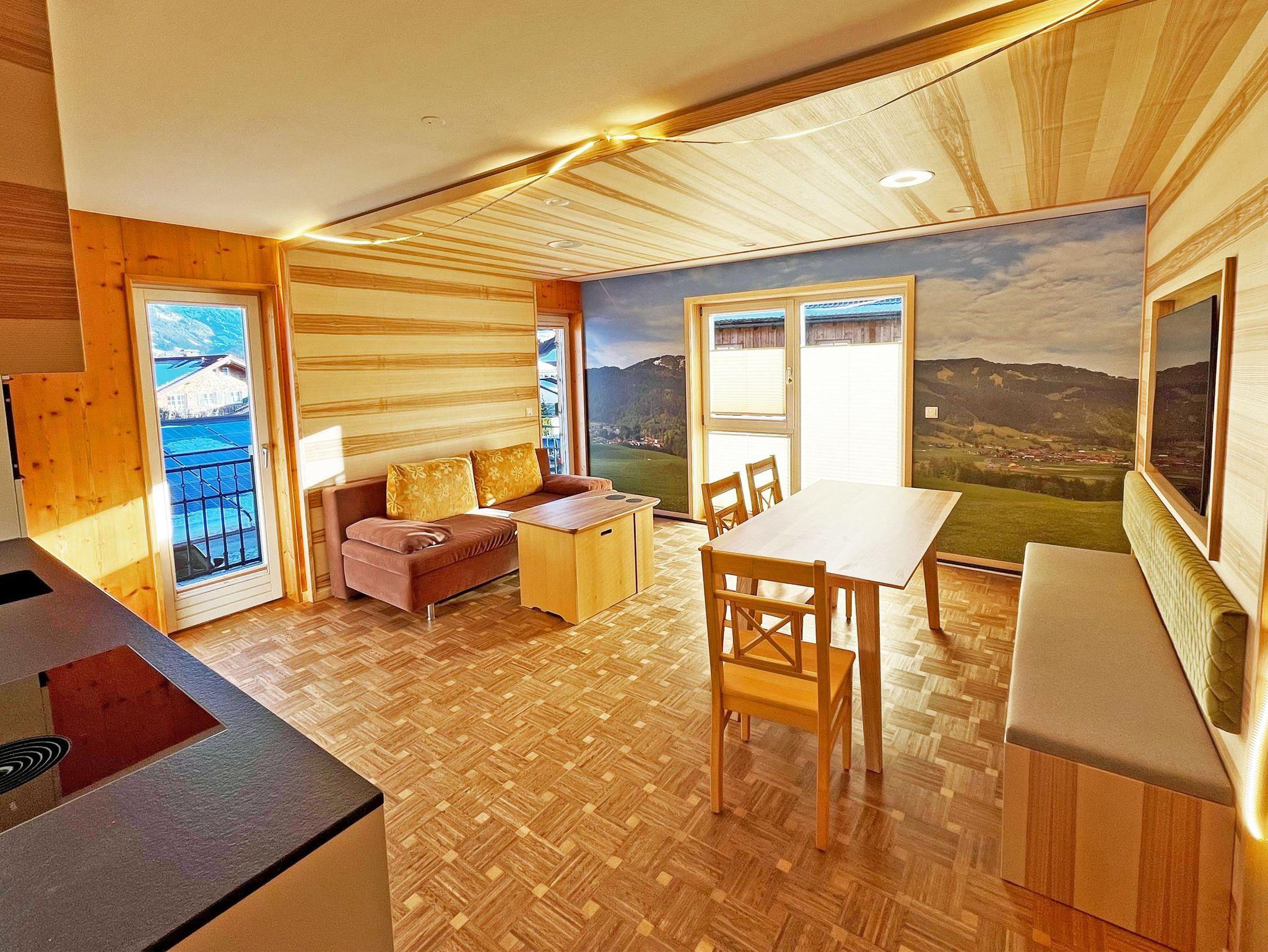 Die Holz-Esche sorgt für ein golden-heimeliges Ambiente in dem großzügigen Wohnbereich, die bodentiefen Fenster fluten den Raum mit Licht, während die Foto-Tapete das tolle Bergpanorama bis um den großen Frühstückstisch holt.