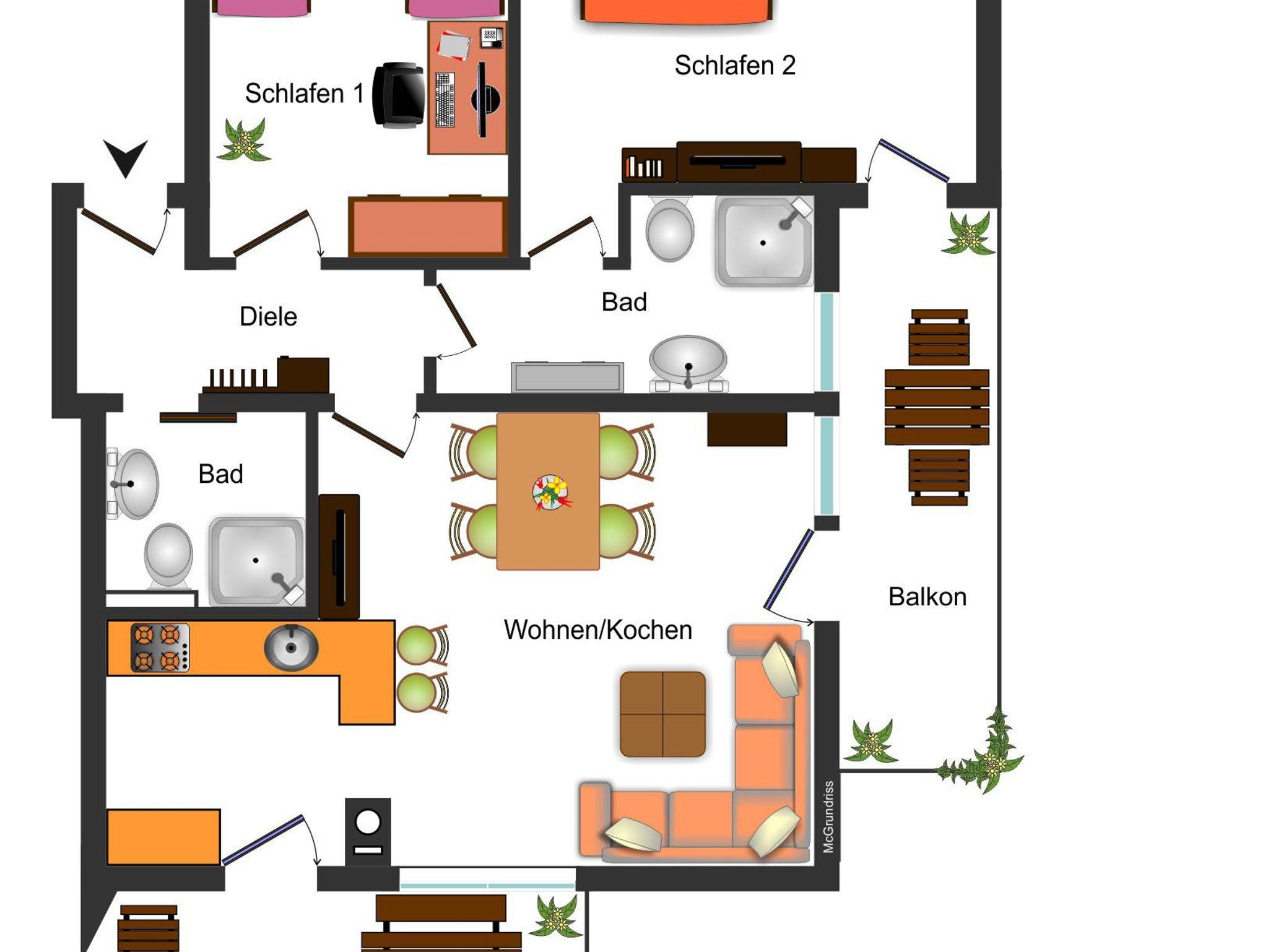 Relaxen ein. Jedes der beiden Schlafzimmer (Babybett zustellbar)verfügt über ein eigenes Duschbad mit WC .