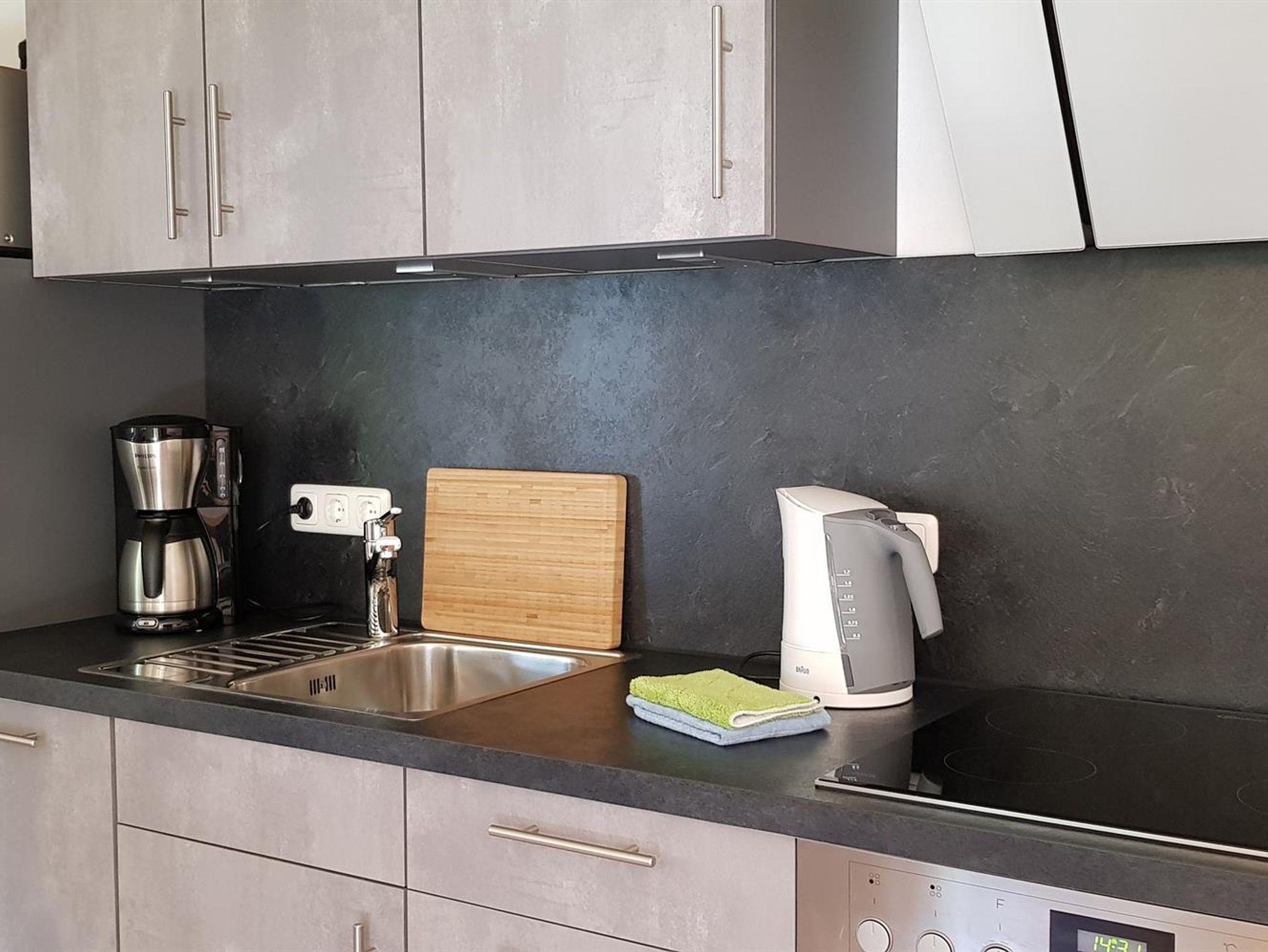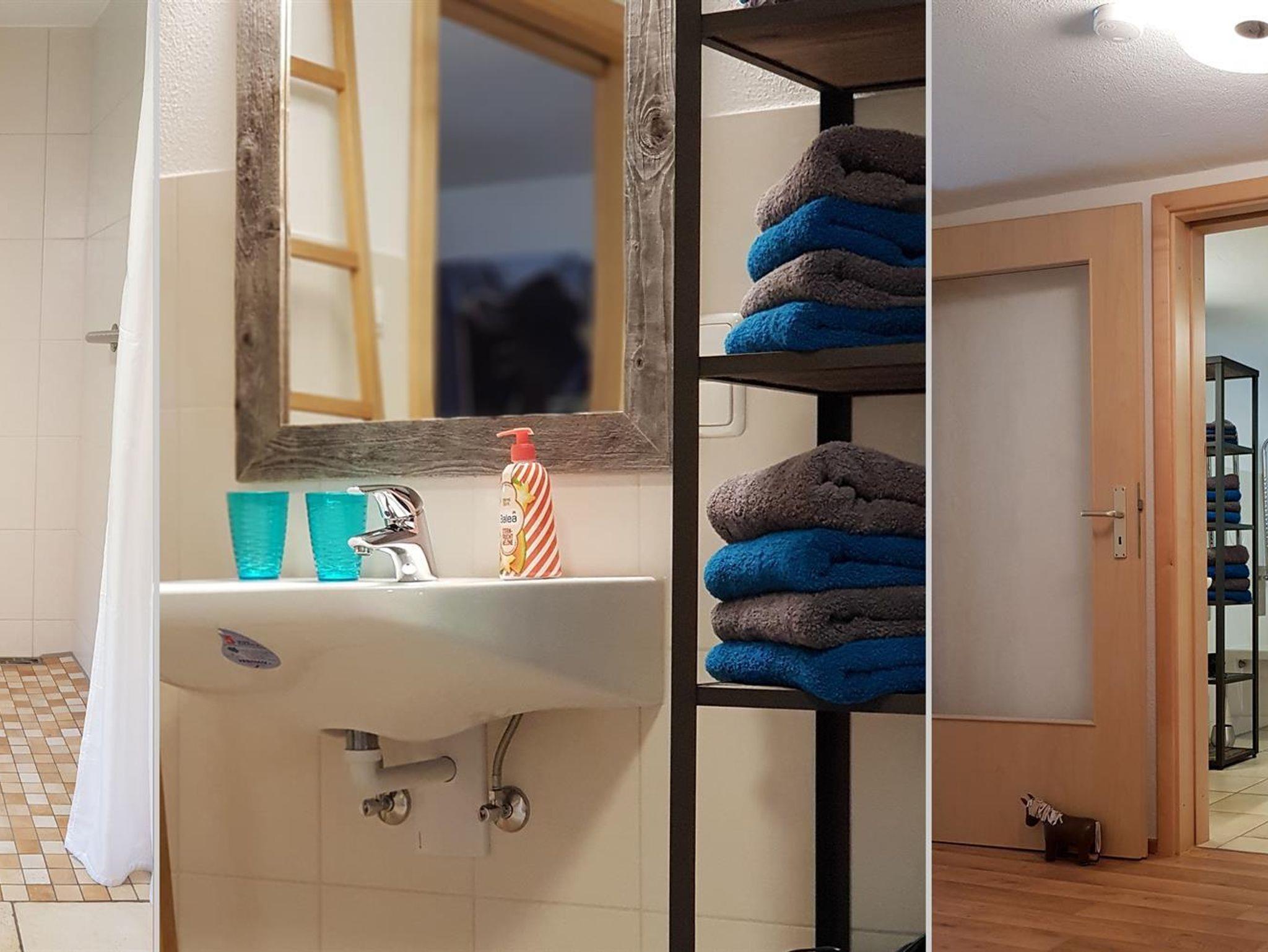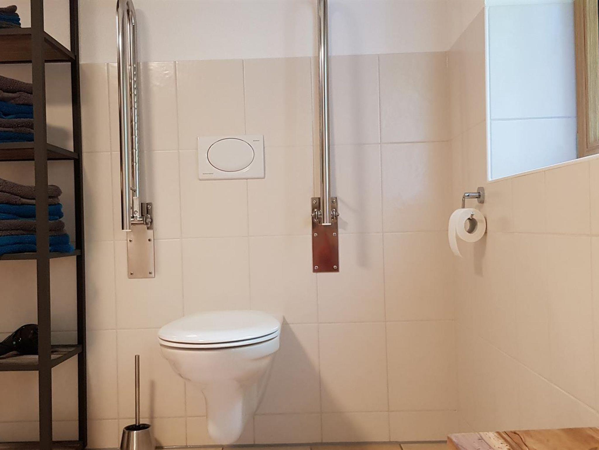 Niederschwellen-Terrassentüre, je 2 Haltegriffe an der Toilette und in der Dusche. Das Doppelbett im Schlafzimmer kann für Rollstuhlfahrer entsprechend positioniert werden (mehr Platz links oder rechts).