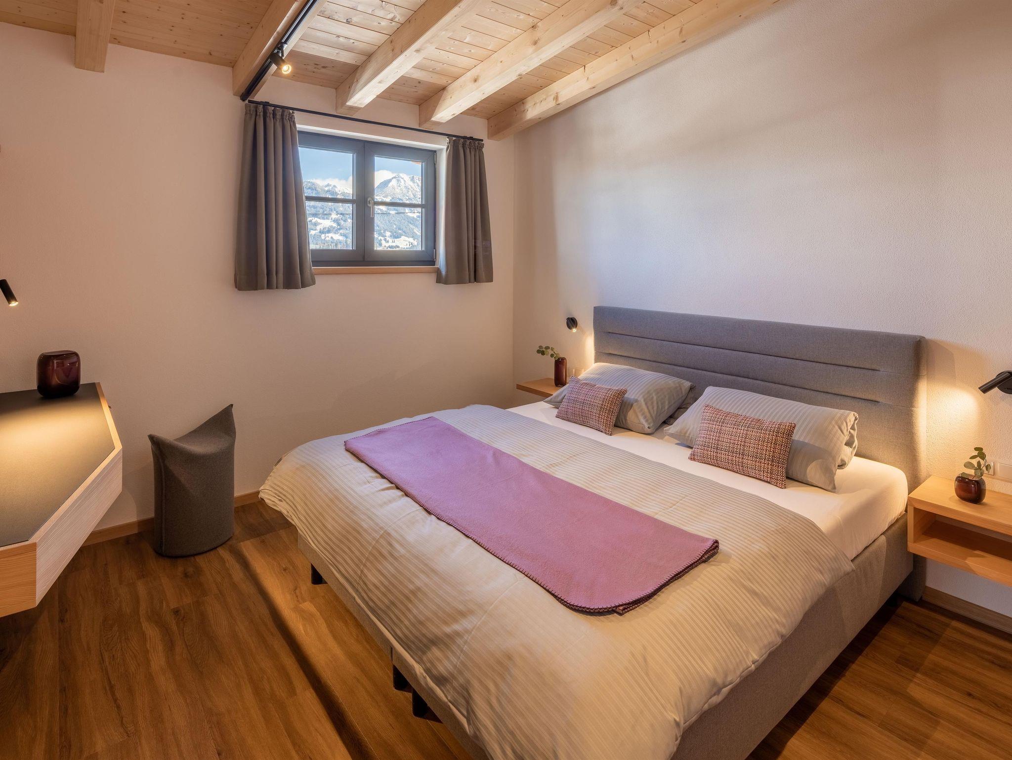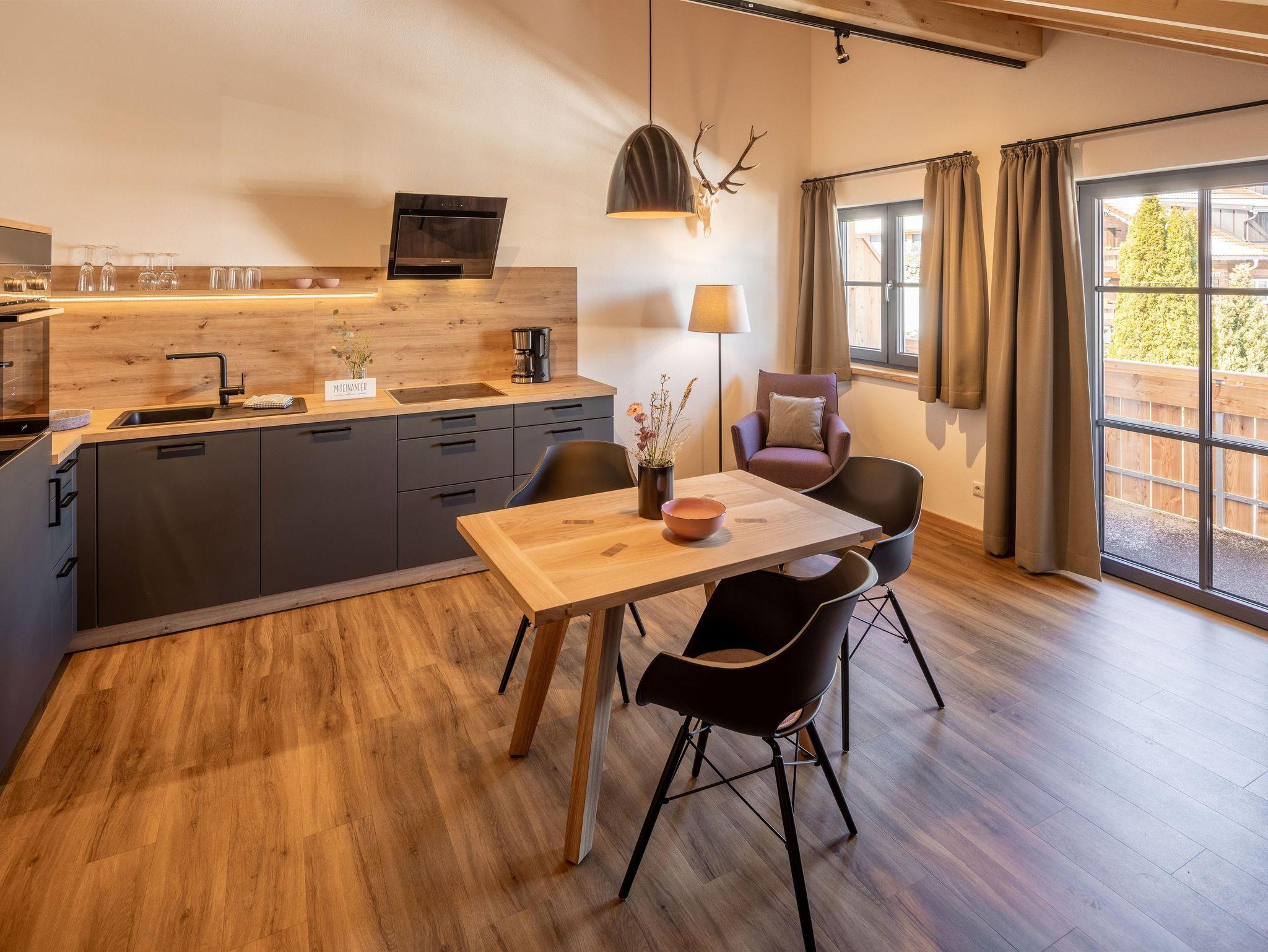 Neue moderne 2-Raum-Wohlfühlferienwohnung für 2 Personen, 60m², 2. Etage, sep. Schlafzimmer, mit Sichtdachstuhl, Balkon und schönem Bergblick Richtung Bolsterlanger Horn (Nord-Ost). Weitere Schlafmöglichkeiten für max. 1 Person auf Anfrage.