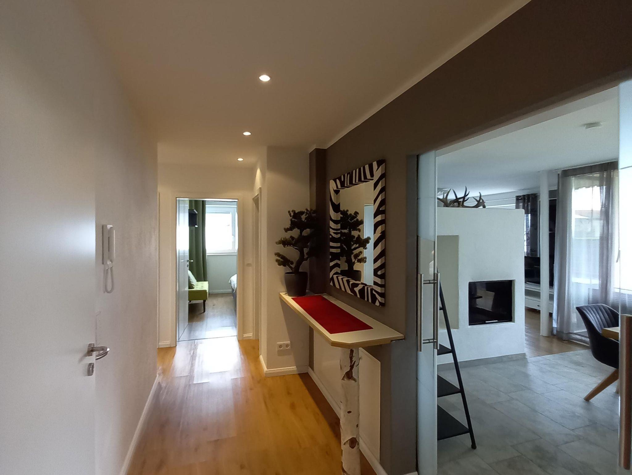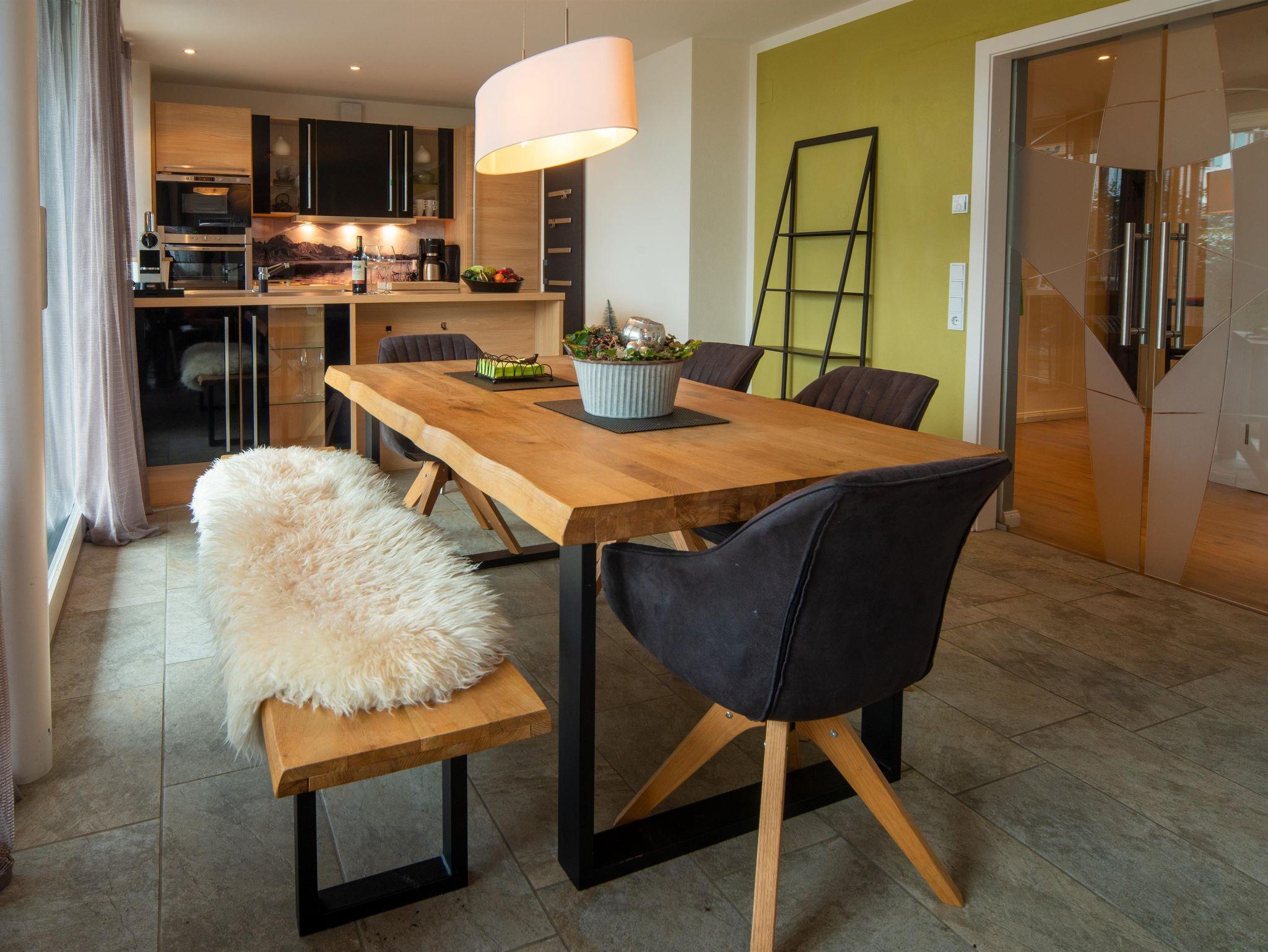 Unsere 4-Raum-Suite Glückskind im EG bietet auf 120 qm eine exklusive Ausstattung im modernen Alpin-Look. Der lichtdurchflutete Wohnraum ist modern und gemütlich eingerichtet und verfügt über einen Kamin mit sichtbarer Feuerstelle. Am großen Essplatz vor der offenen vollausgestatteten Traumküche genießen Sie Ihr Frühstück. 3 Schlafzimmer mit Boxspringbetten (Babybett zustellbar) und 2 Bäder mit ebener Dusche/2 WCs (für Rollstuhlfahrer geeignet) bieten viel Komfort. Eine eigene überdachte Terrasse mit Garten und Aussicht auf den Alpenhauptkamm lädt zum Relaxen ein.