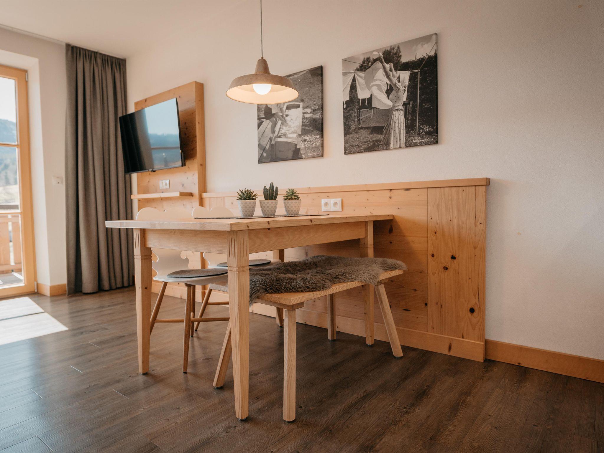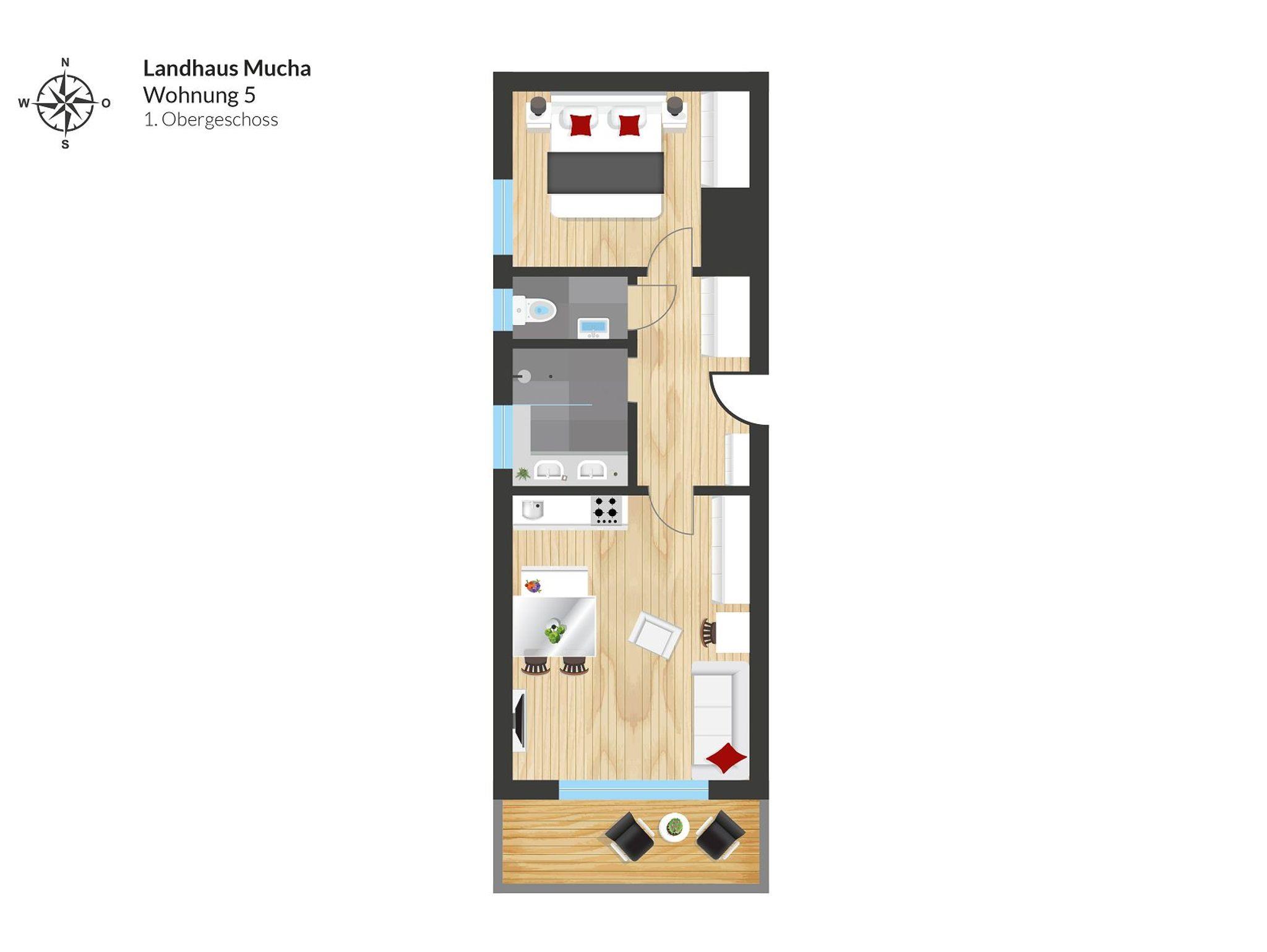 Die Wohnung im 1. Obergeschoss mit 45 m² verfügt über einen Wohnraum mit einer komplett ausgestatteten Küche, einem Esstisch, einer Sitzecke, Sat-TV, ein Schlafzimmer, Südbalkon und ein Bad mit Dusche und einer seperaten Toilette.
