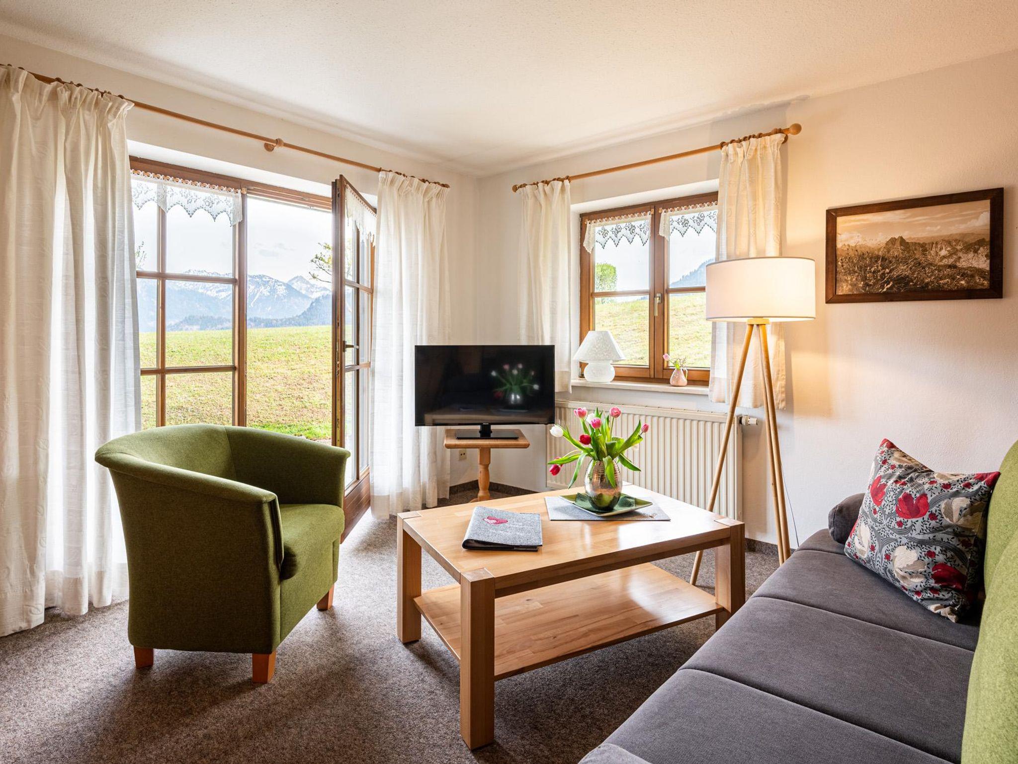 Ferienwohnung im Erdgeschoss mit einmaligem unverbautem Blick auf die Allgäuer Bergkette. Die gemütliche und komfortabel ausgestattete Wohnung ist 50qm groß und verfügt über ein separates Schlafzimmer, separates Wohnzimmer mit ausziehbarer Doppelcouch, separater Wohnküche, Du/WC sowie über eine große Sonnenterrasse mit direktem Zugung zum Garten.