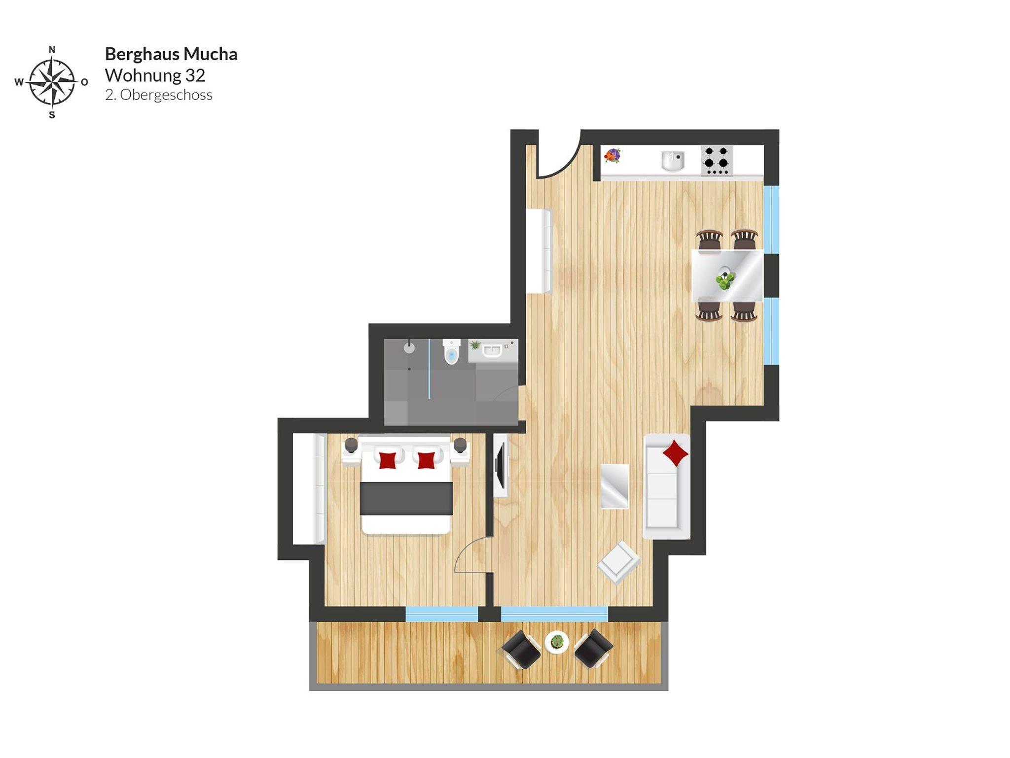 Die Wohnung im 2. Obergeschoss mit 52 m² verfügt über einen Wohnraum mit einer komplett ausgestatten Küche, einem Esstisch, einer Sitzecke, Sat-TV, ein Schlafzimmer, ein Süd-Balkon und ein Bad mit Dusche und Toilette.