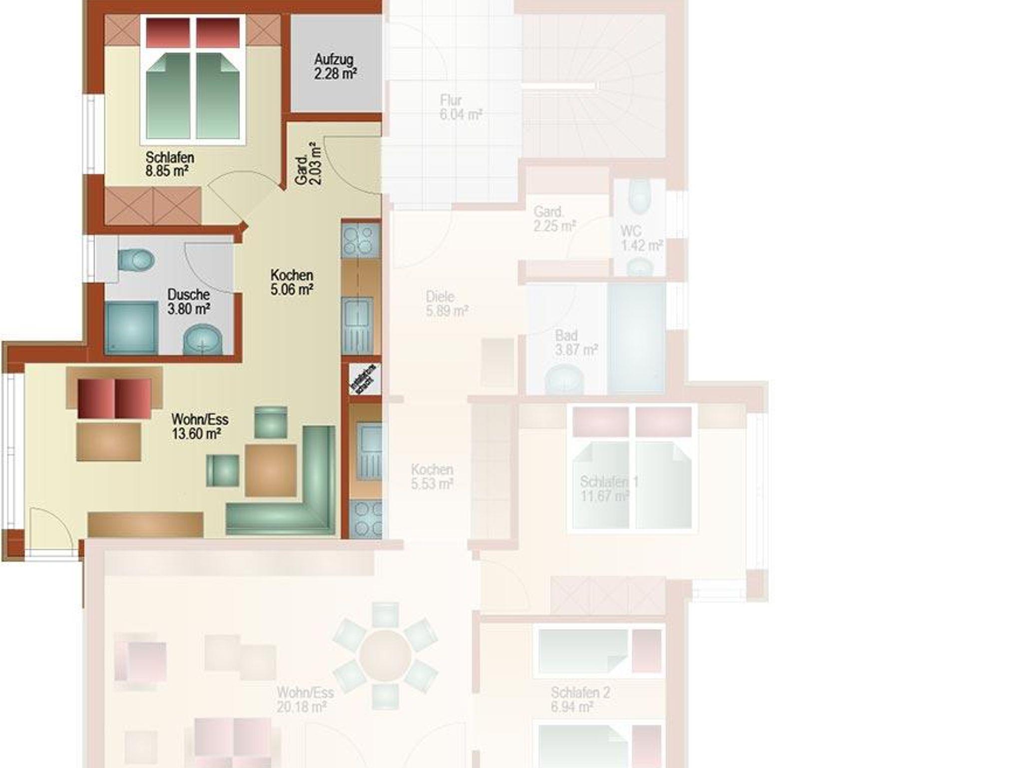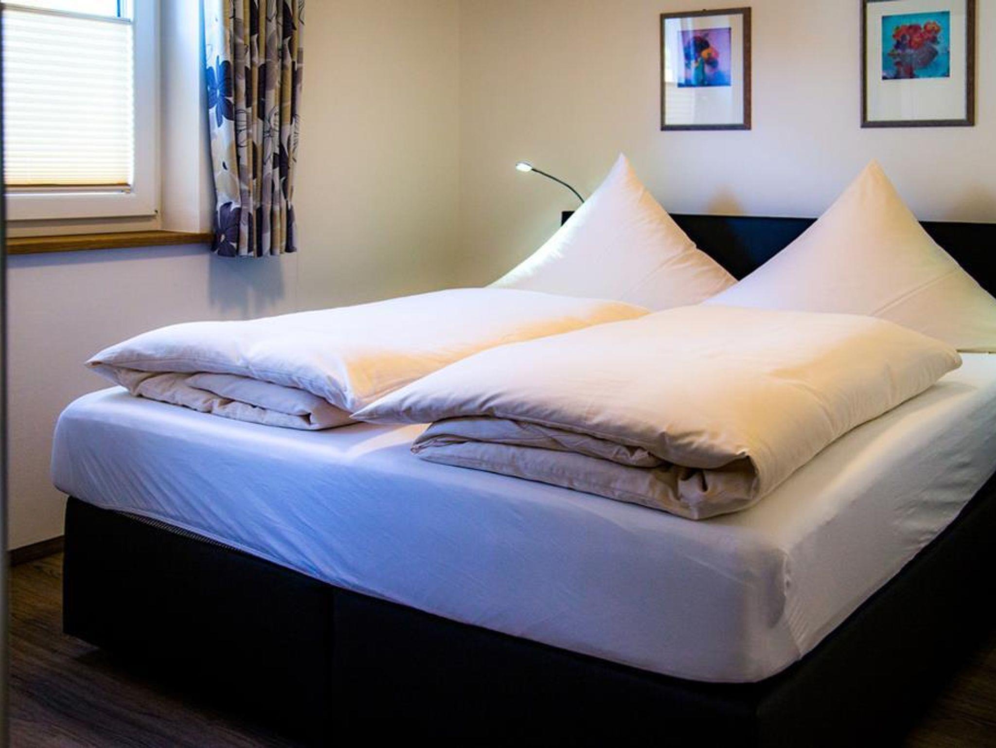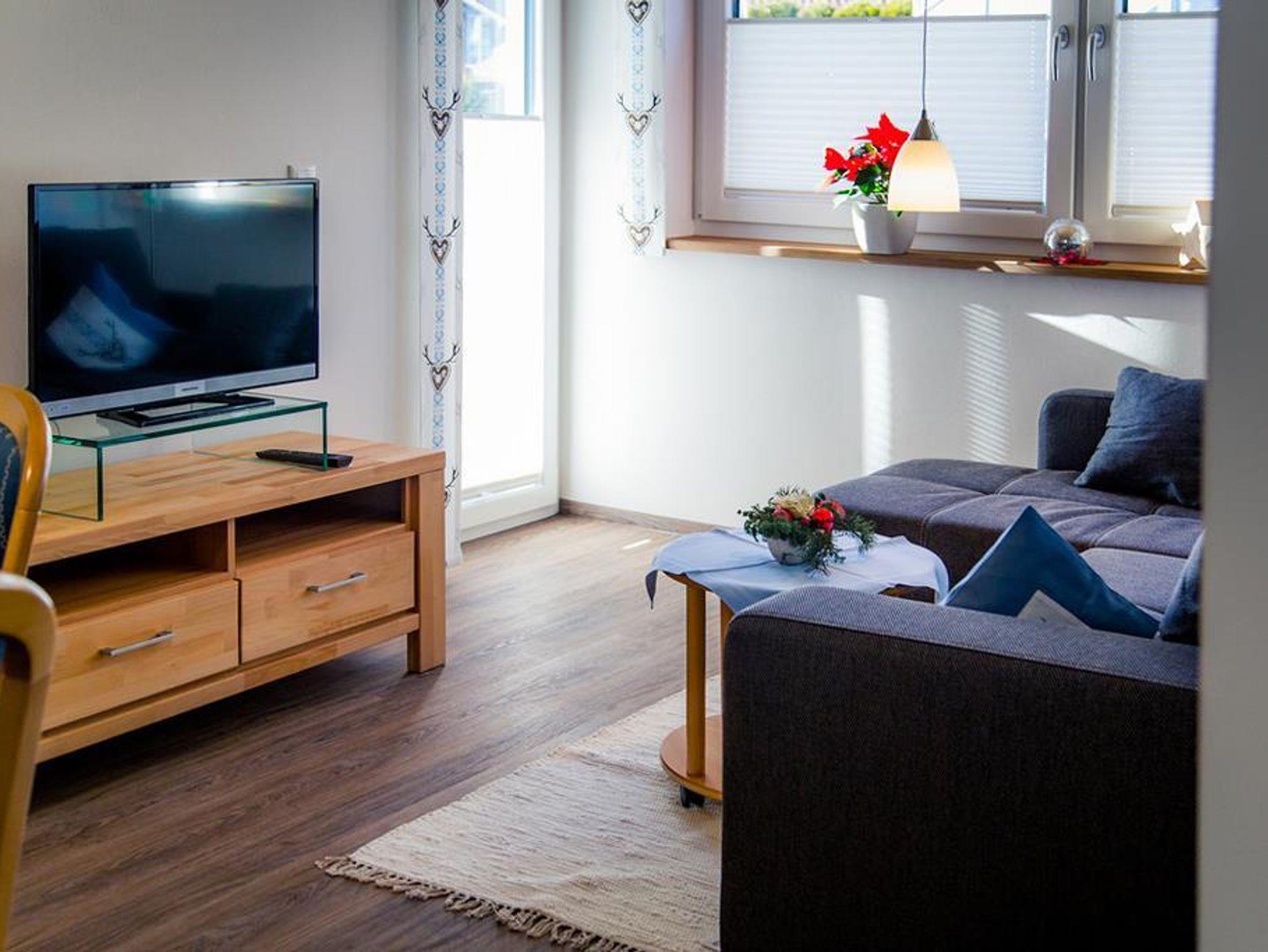 liebvolle 2-Raum-Ferienwohnung mit kleiner Süd/West-Terrasse mit Blick zur Hörnerbahn und den Skiliften. Komplett ausgestattete Küche, gemütliche Ess- und Sitzecke, Schlafzimmer mit Boxspringbetten, Dusche/WC