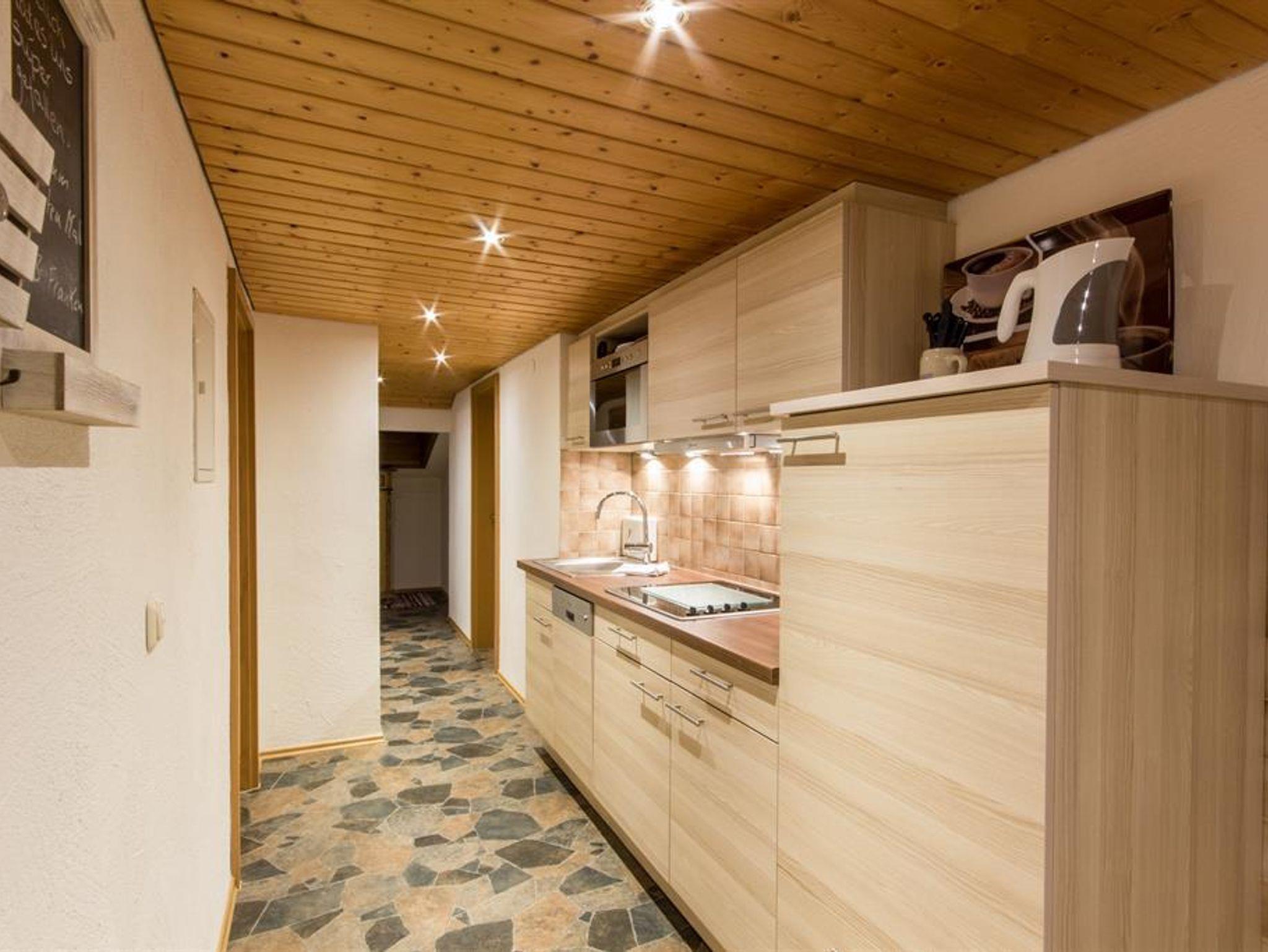 Komplett eingerichtete Küche mit Spülmaschine, 4 Platten Cerankochfeld und Mikrowelle.