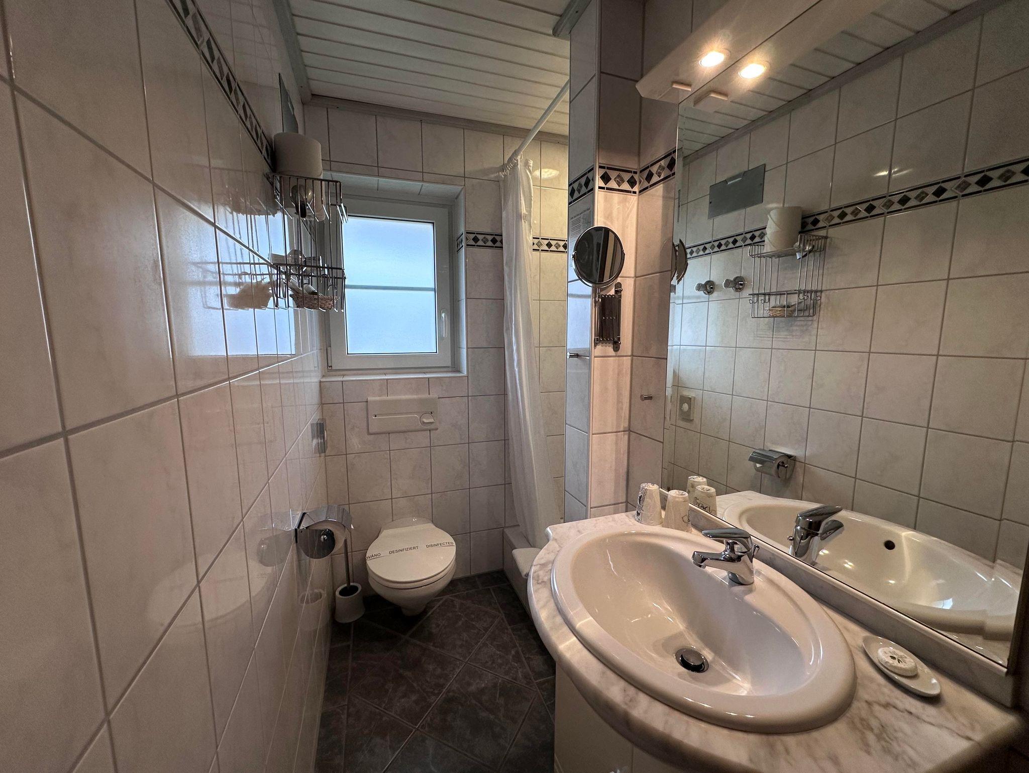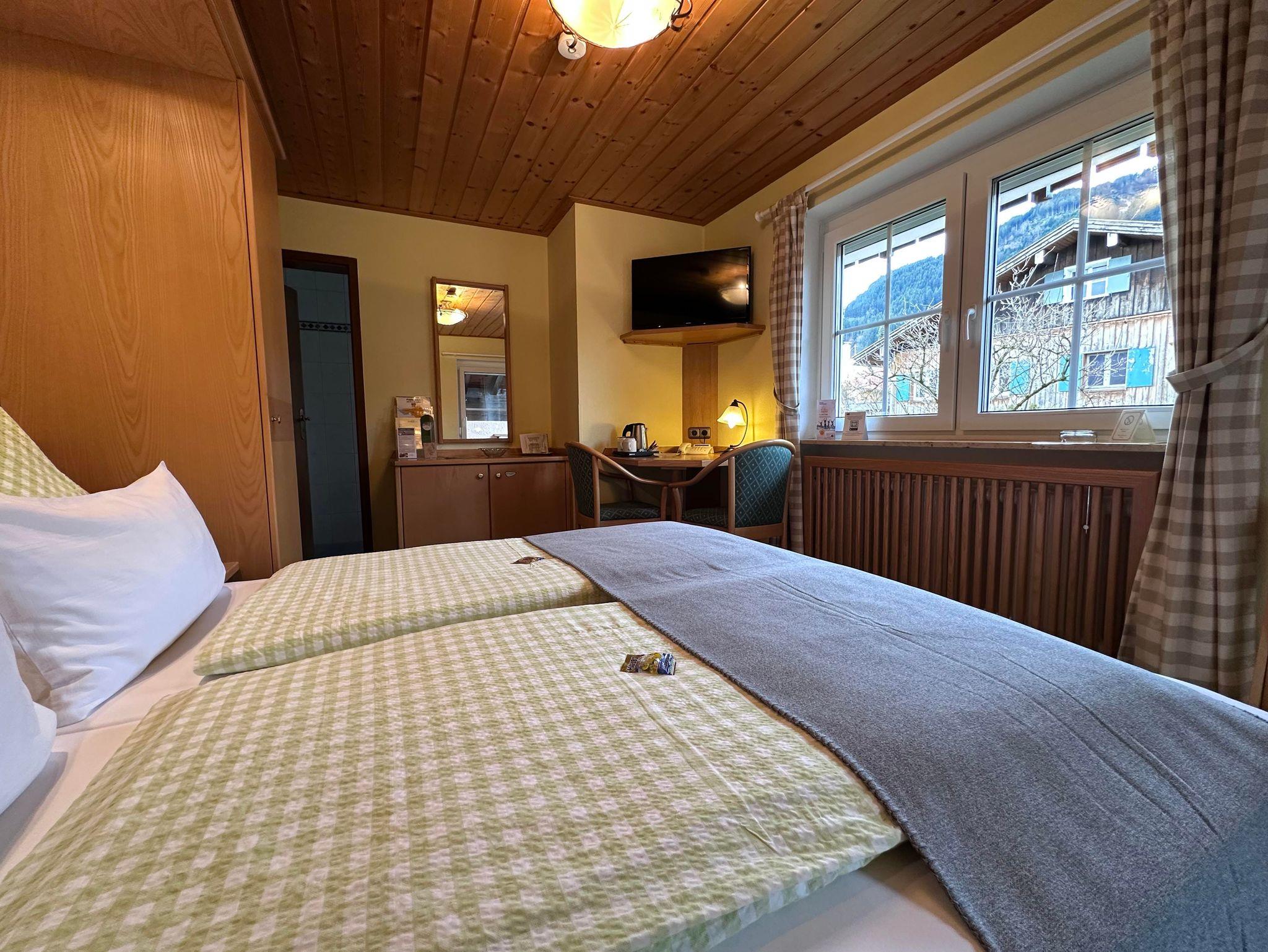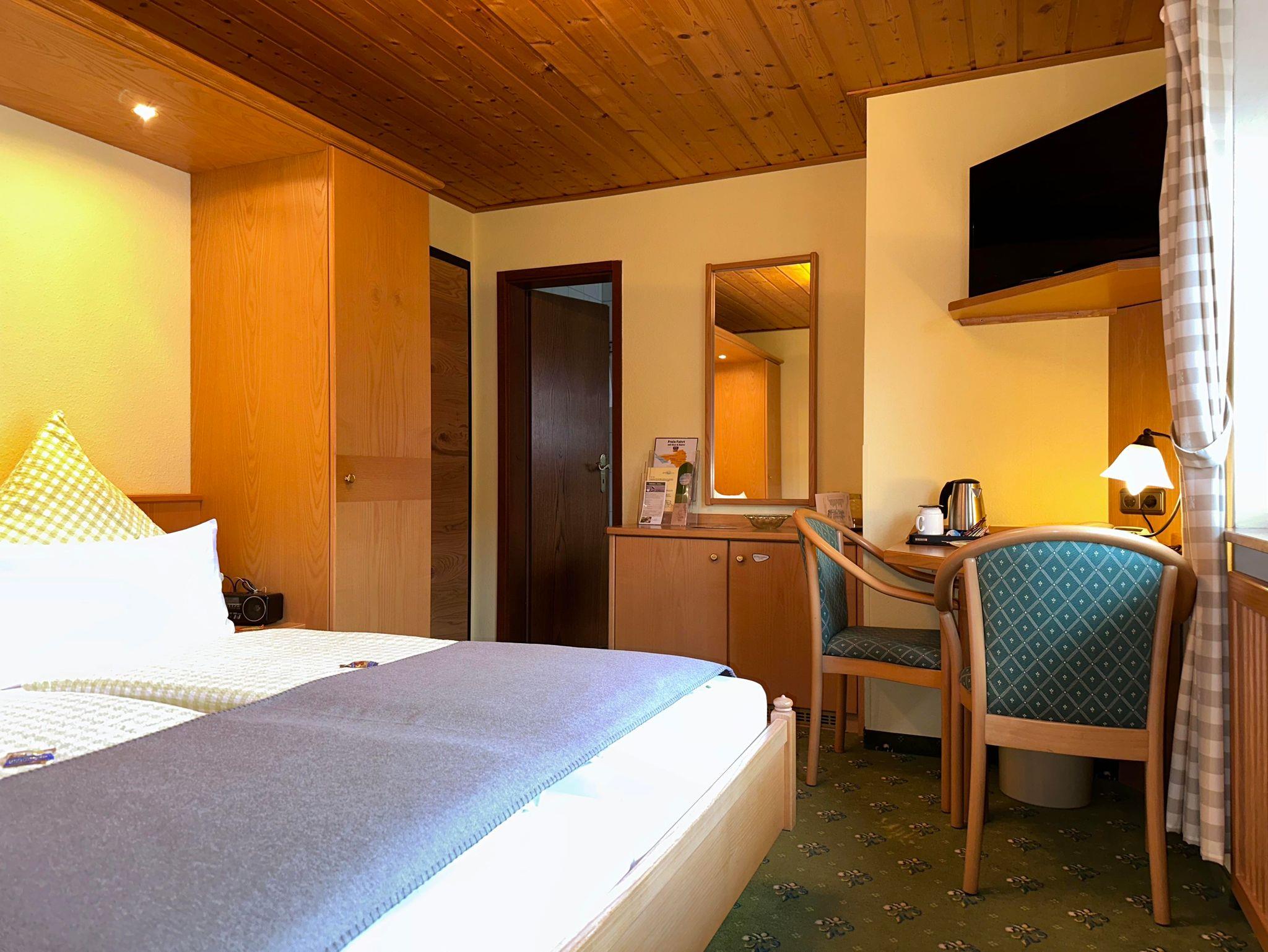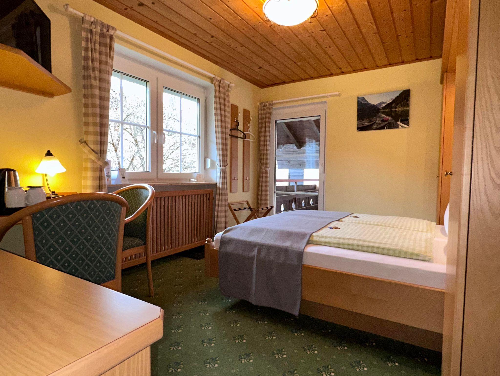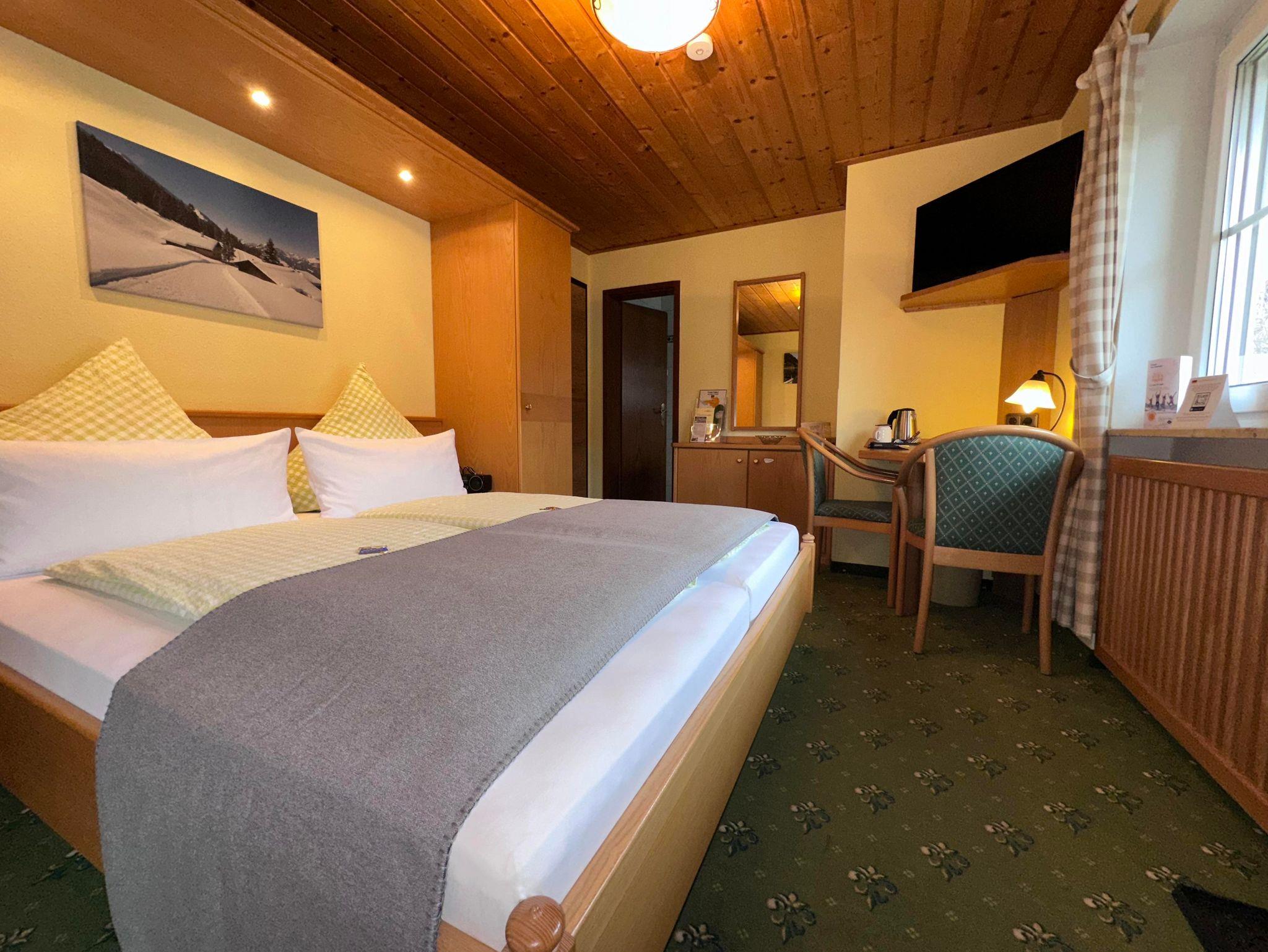 Economy-Doppelzimmer mit Balkon im Haupthaus. Lage zum Garten Blickrichtung Hörnerbahn. Bad mit Dusche/WC und Fön, Minibar und Sat-TV sowie Radiowecker. Ideal für preisbewusste & aktive Gäste.