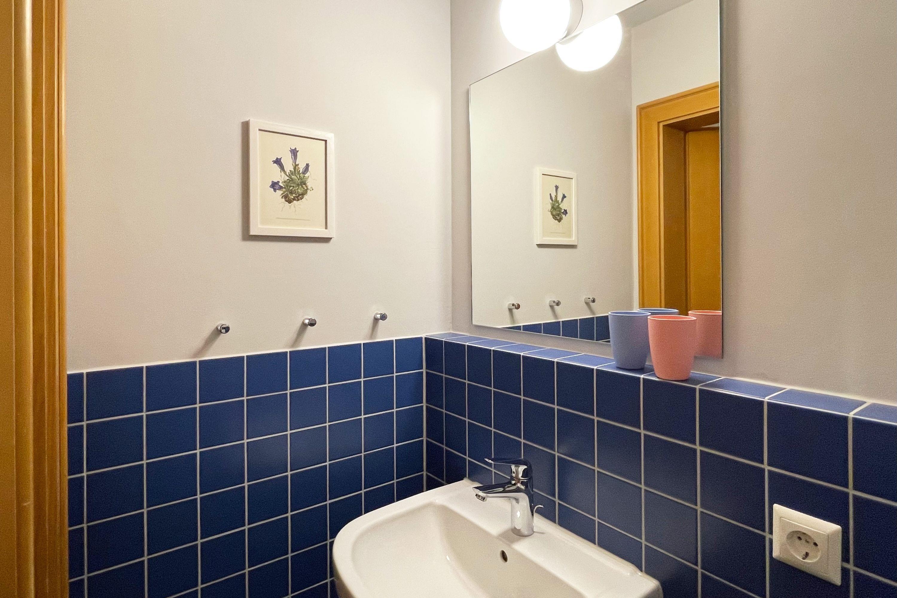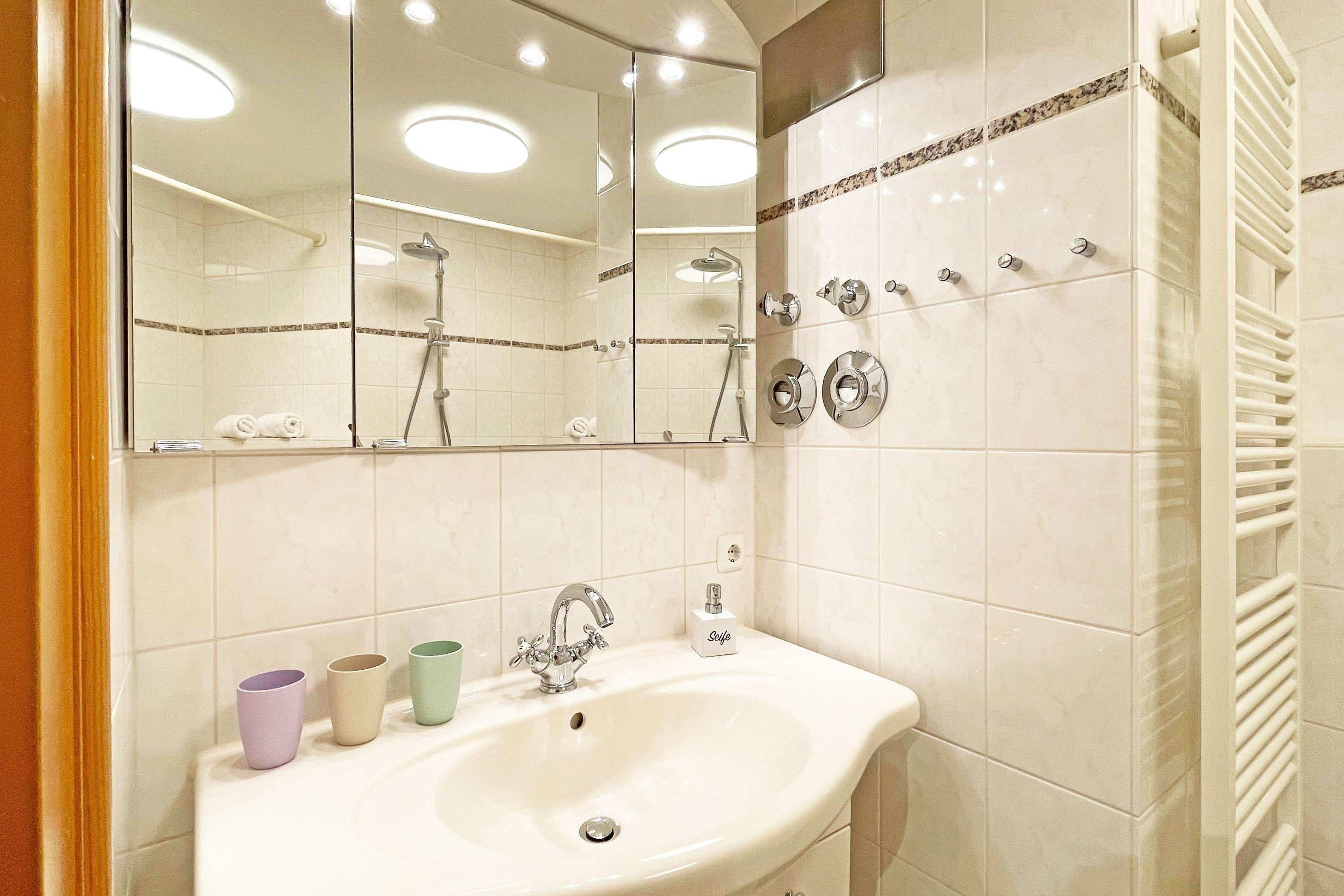 Das Badezimmer ist mit einer Badewanne inklusive Duschvorrichtung, WC und Waschtisch ausgestattet. Die Wohnung verfügt über ein zusätzliches WC mit Waschtisch.