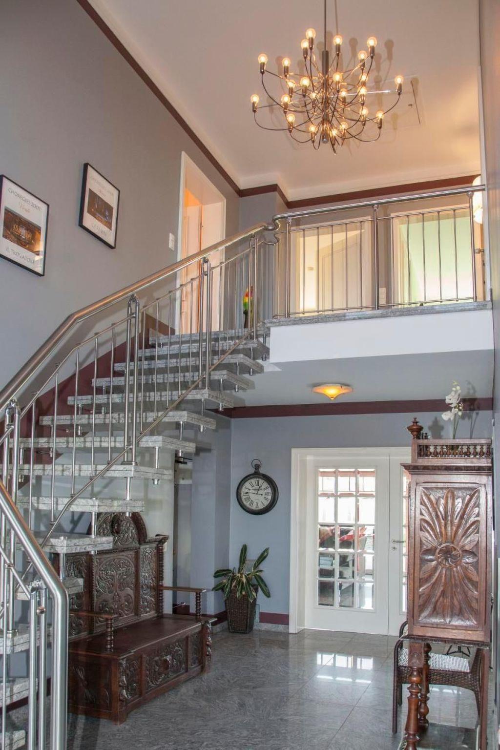 The outdoor area delights with a terrace of approx. 60 square metres, which is equipped with high-quality garden furniture, sun loungers, a Weber barbecue and pleasant lighting for the evening hours. Afterwards, the exclusive, covered pool area with loungers and Roman entrance invites you to relax. The heated pool uses ecologically sound solar thermal energy and is open from April to October. The spacious garden offers shady trees and green areas as well as plenty of space for children to play.