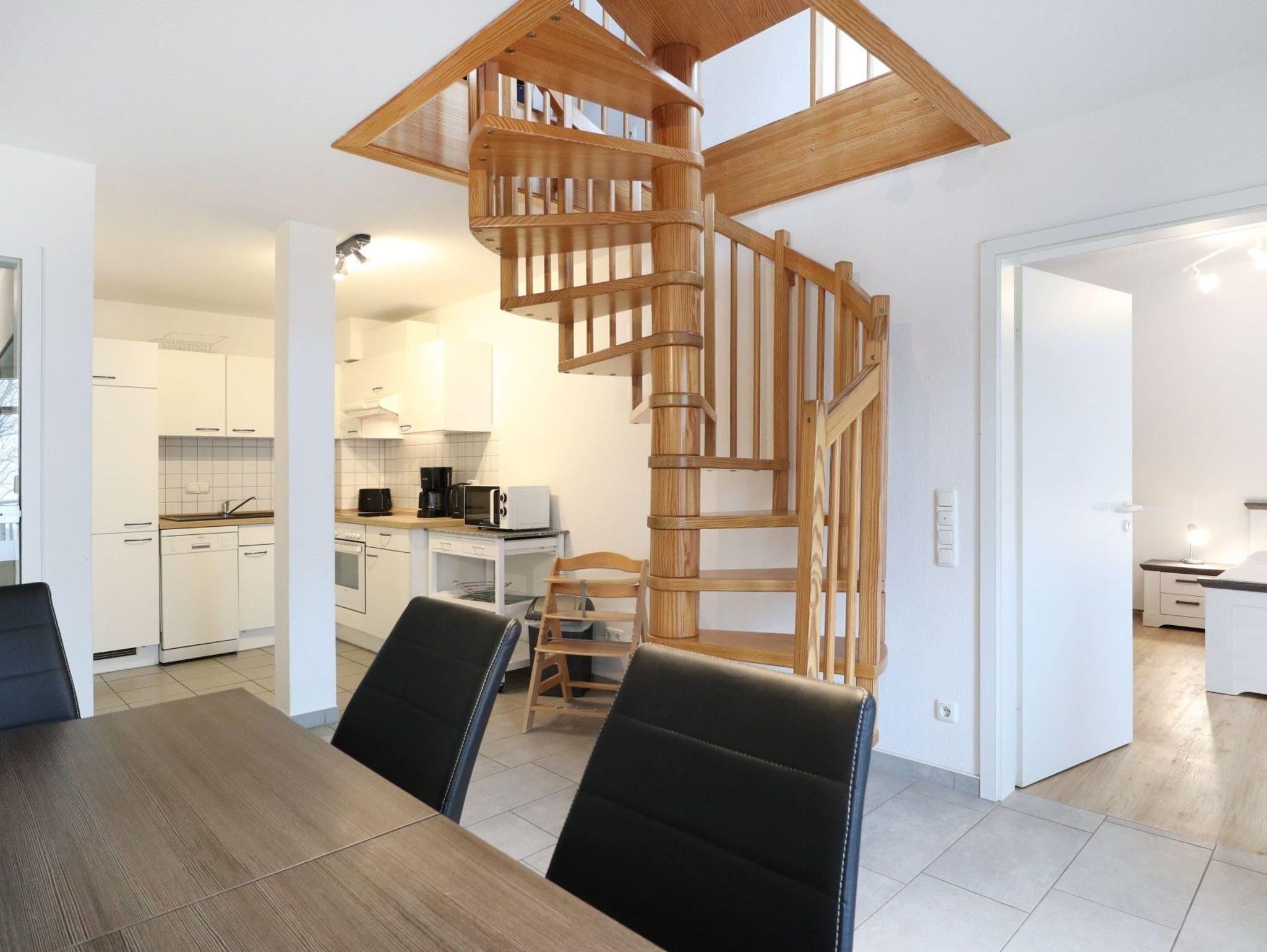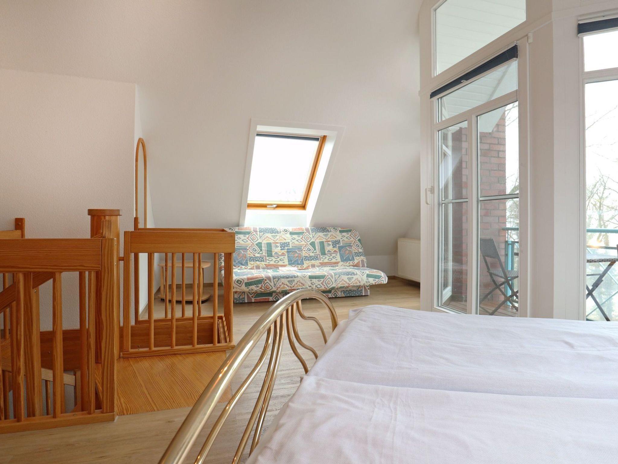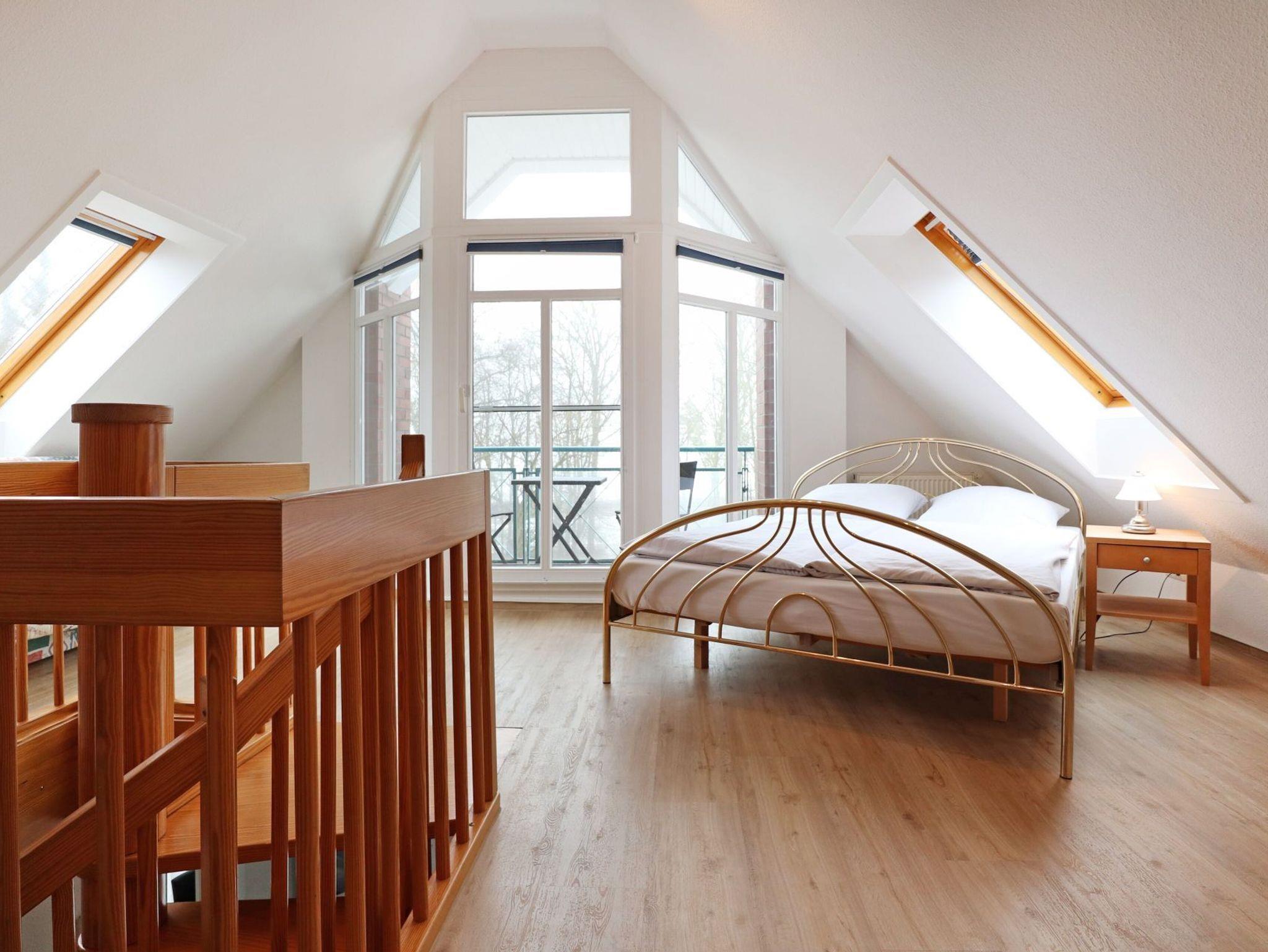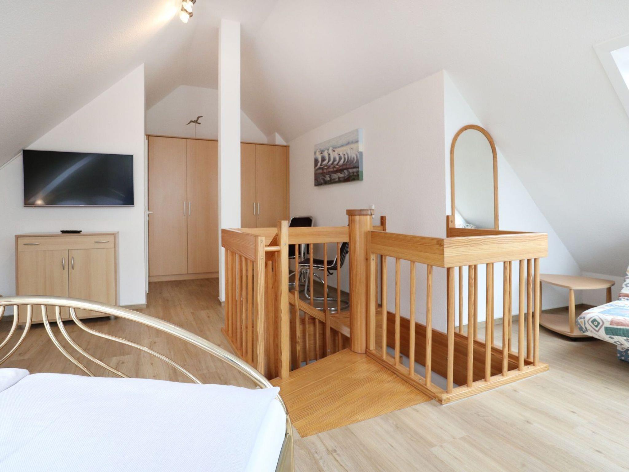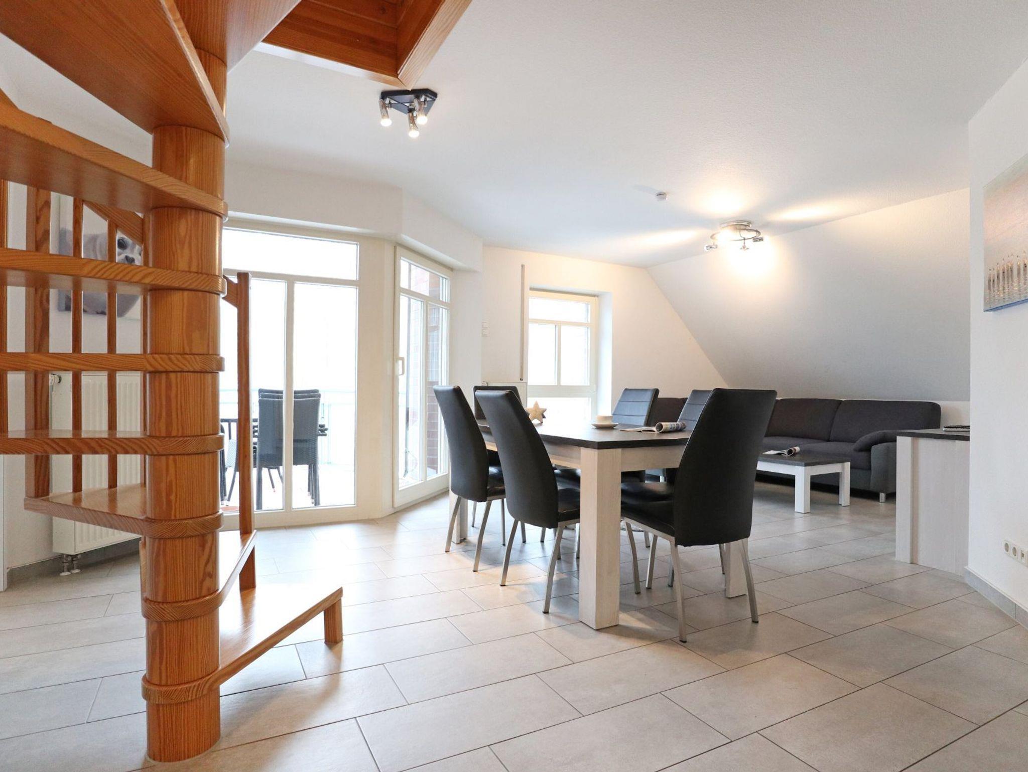 Über eine Wendeltreppe gelangen Sie in den oberen Wohnungsbereich mit einem weiteren Balkon. Hier steht ein dritter Schlafbereich zur Verfügung mit Doppelbett, Sitzgelegenheiten und Fernseher. Idealerweise befindet sich auf dieser Etage ein zweites Tageslicht Duschbad, Waschtisch, WC. Kinderreisebett und Kinderhochstuhl gehören zur Ausstattung.