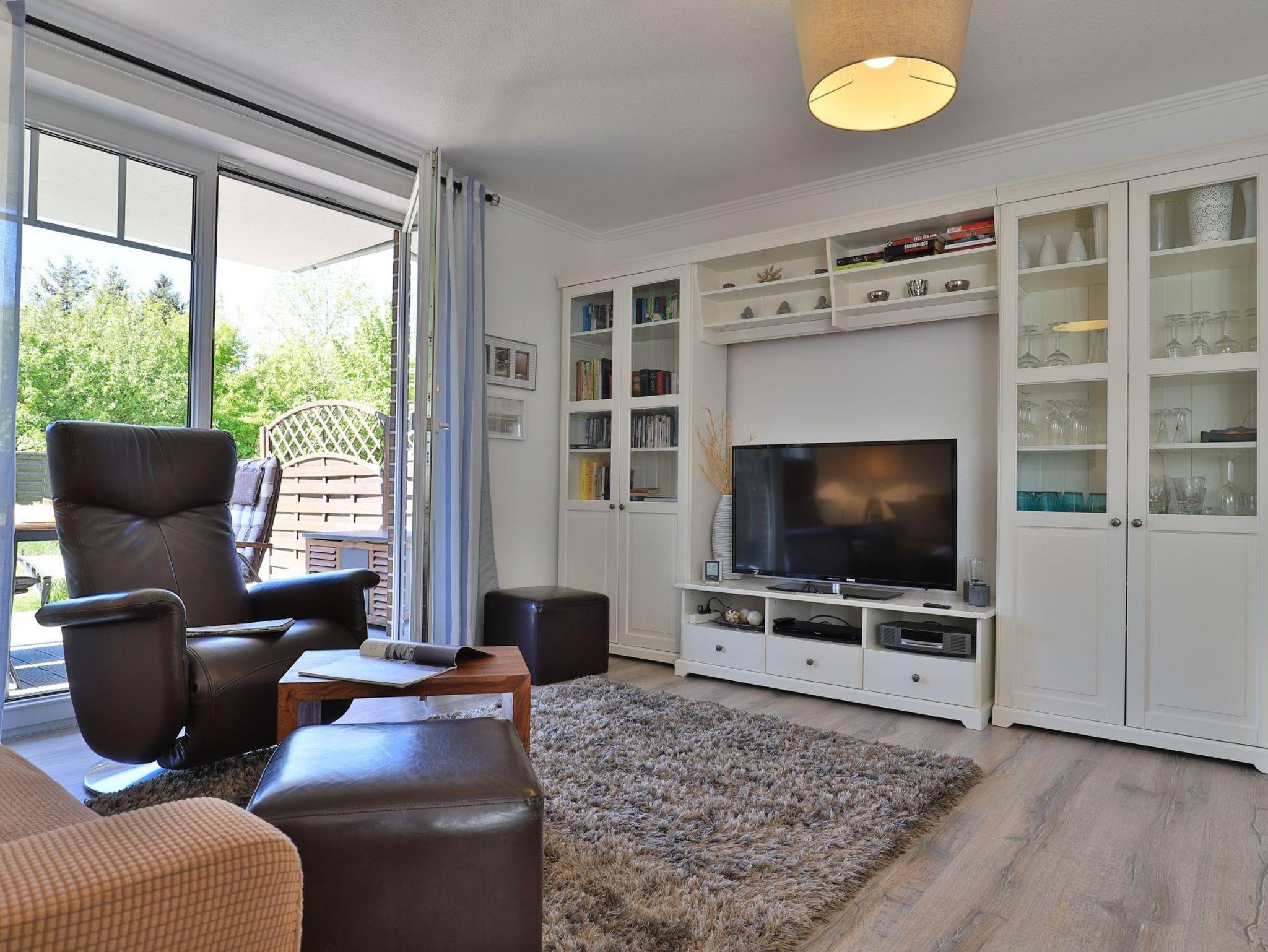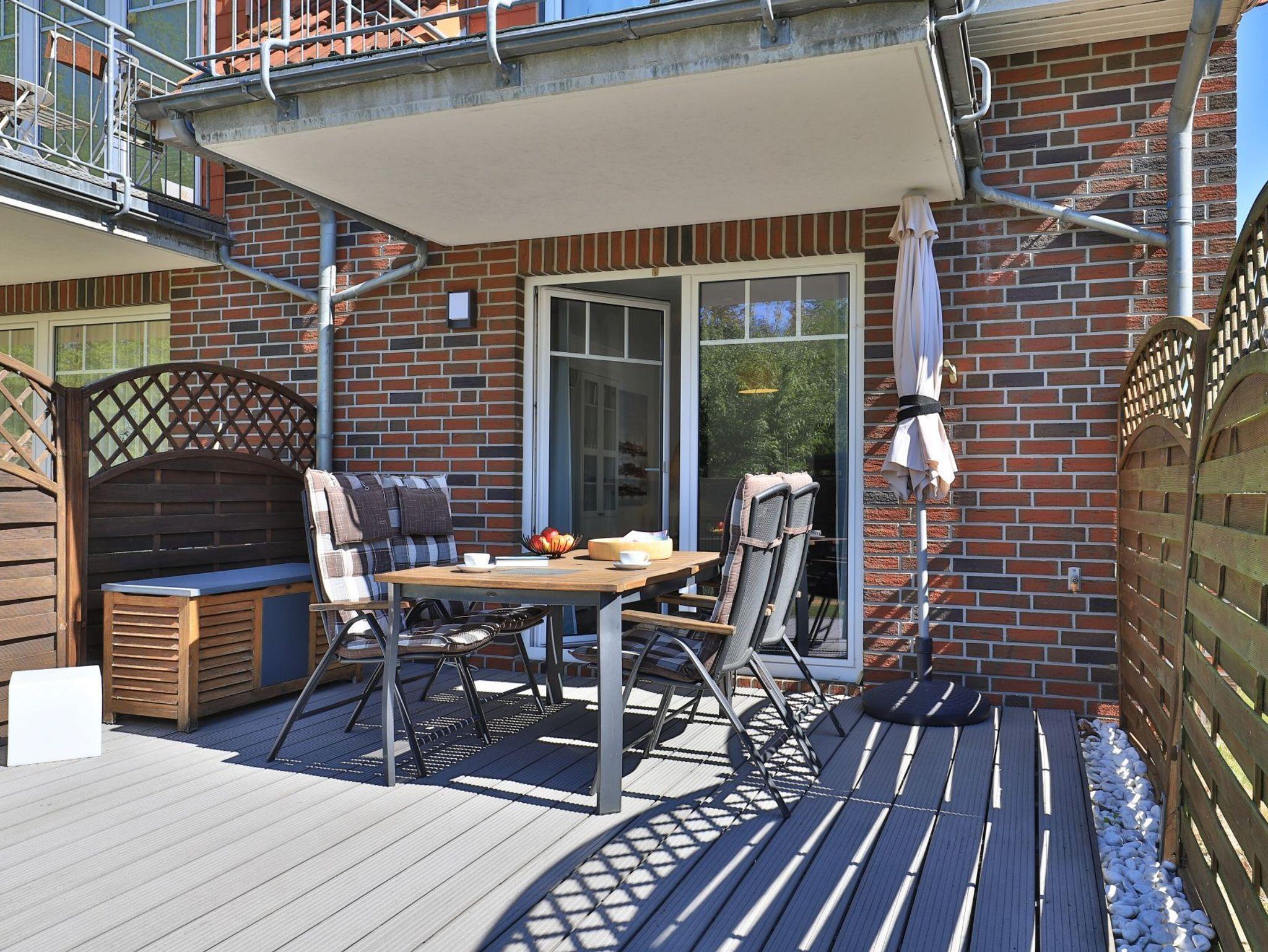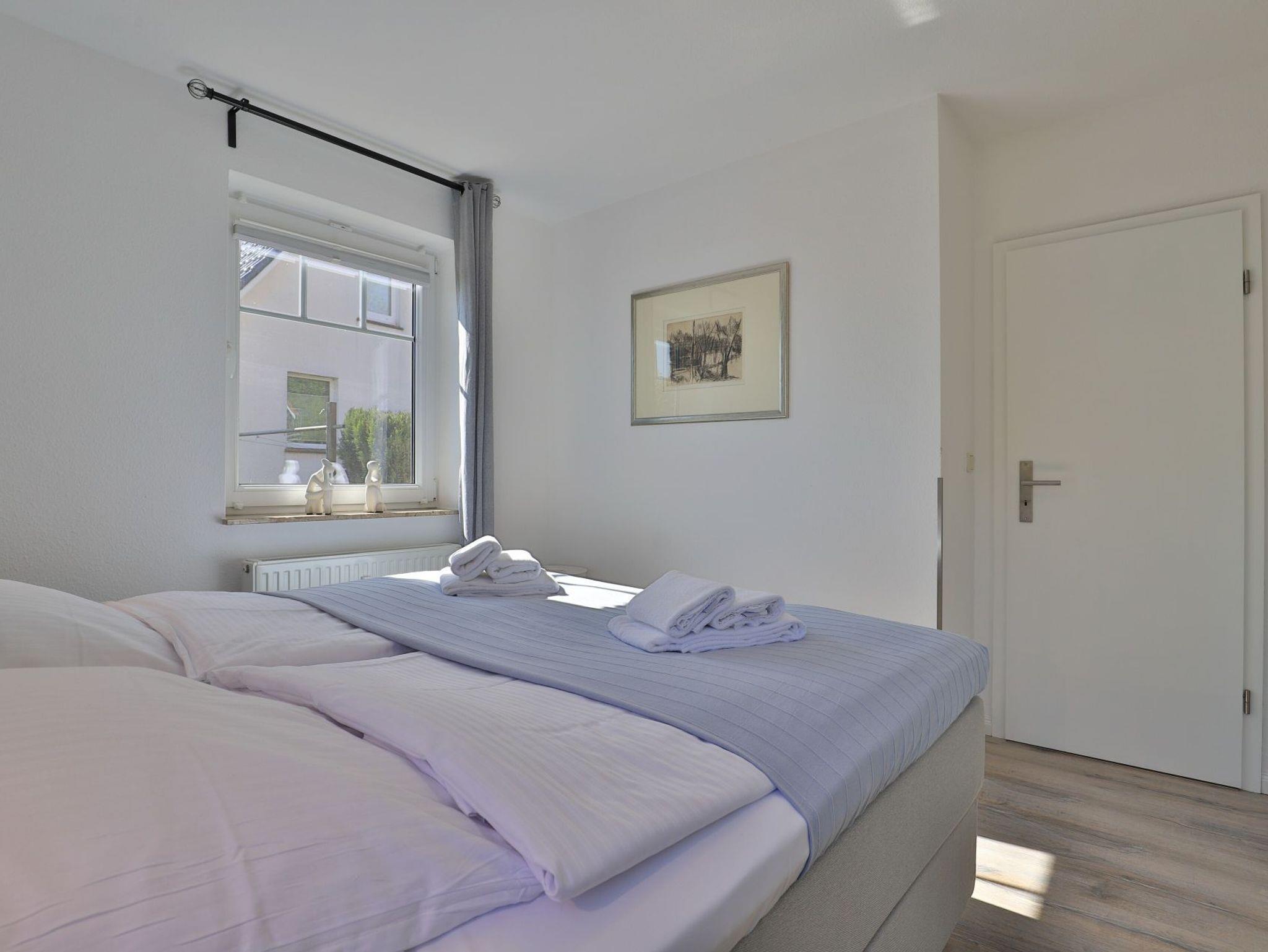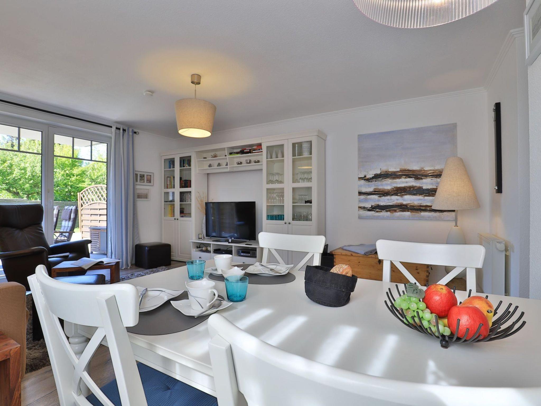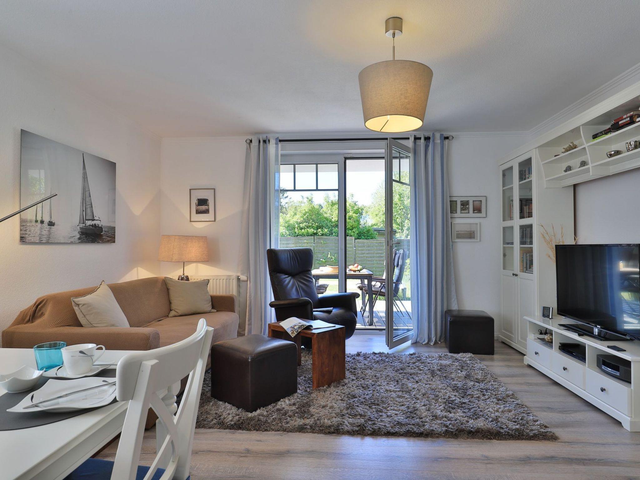 Die 2-Zimmerwohnung bietet eine großzügige Wohnfläche von 60qm und befindet sich im Erdgeschoss des Mehrparteienhauses. Eine Belegung ist mit 2 Personen möglich. Im sehr geschmackvoll möblierten Wohn-/Essbereich empfängt Sie ein Komfortsofa und ein Lesesessel mit Beinablage. Selbstverständlich ist das Appartement auch mit einem Fernseher, Musikanlage sowie WLAN ohne Mehrkosten ausgestattet. In der separaten Küche, die über eine Durchreiche zum Esstisch im Wohnbereich verfügt, können Sie Ihre Urlaubsmahlzeiten zubereiten. Ceranherd, Backofen, Dunstabzug, Kühlschrank mit sep. Gefrierfach, Kaffeemaschine, Wasserkocher, Toaster, Geschirrspüler u.v.m. sind vorhanden. Im Sommer können Sie sich auf der saisonal möblierten Terrasse wunderbar erholen und gerne das angrenzende Rasengrundstück nutzen. Geruhsame Nächte verbringen Sie in einem separaten Schlafzimmer mit Doppelbett ? 180cm mal 200cm-, Kleiderschrank und Kommode. Zugehörig ist ein modernes Duschbad mit Fenster, Waschtisch, Föhn, WC. Auch eine Waschmaschine, Bügeleisen und Bügelbett stehen zu Ihrer Verfügung. Im Safe sichern Sie persönliche Wertsachen.
