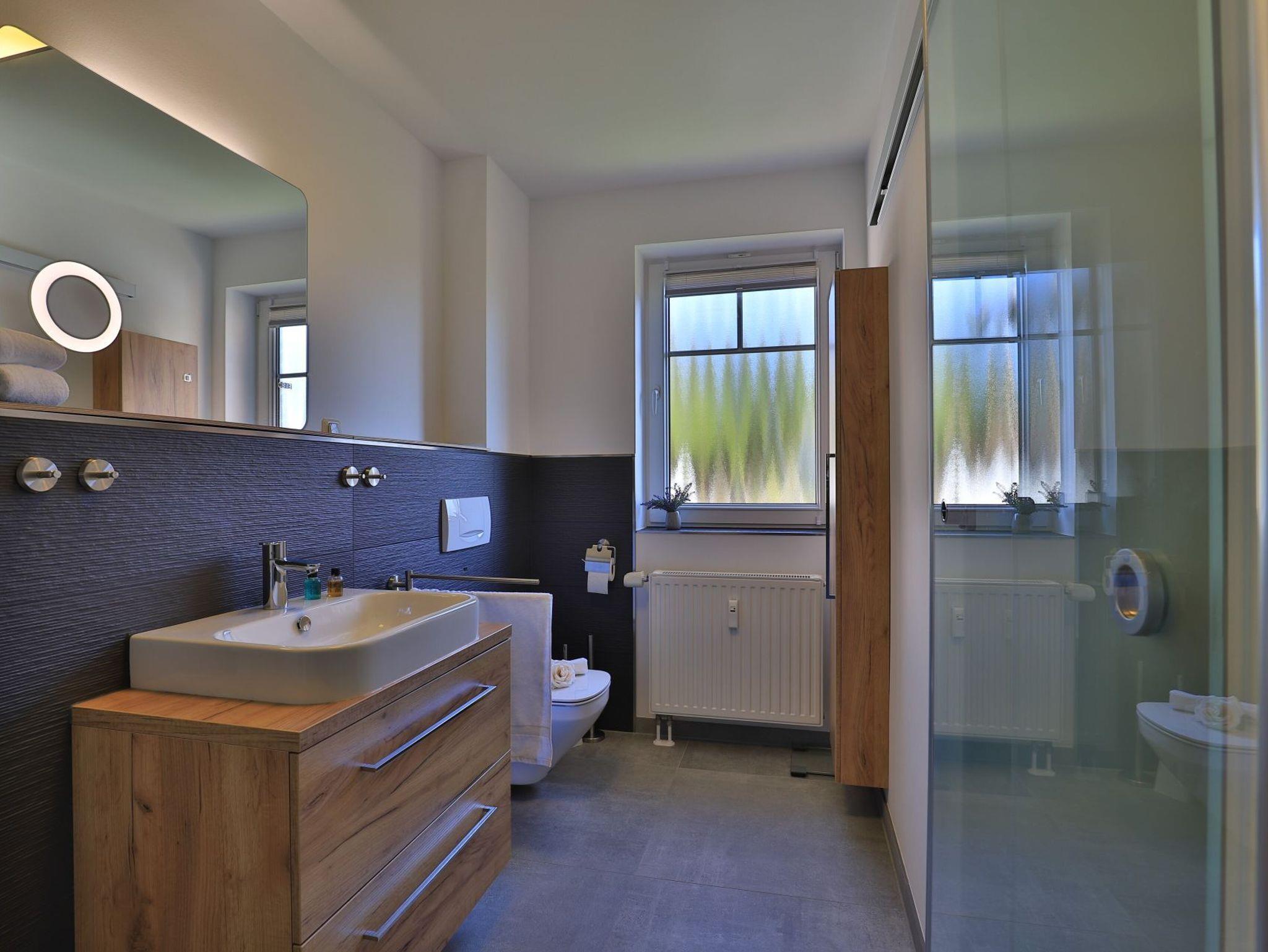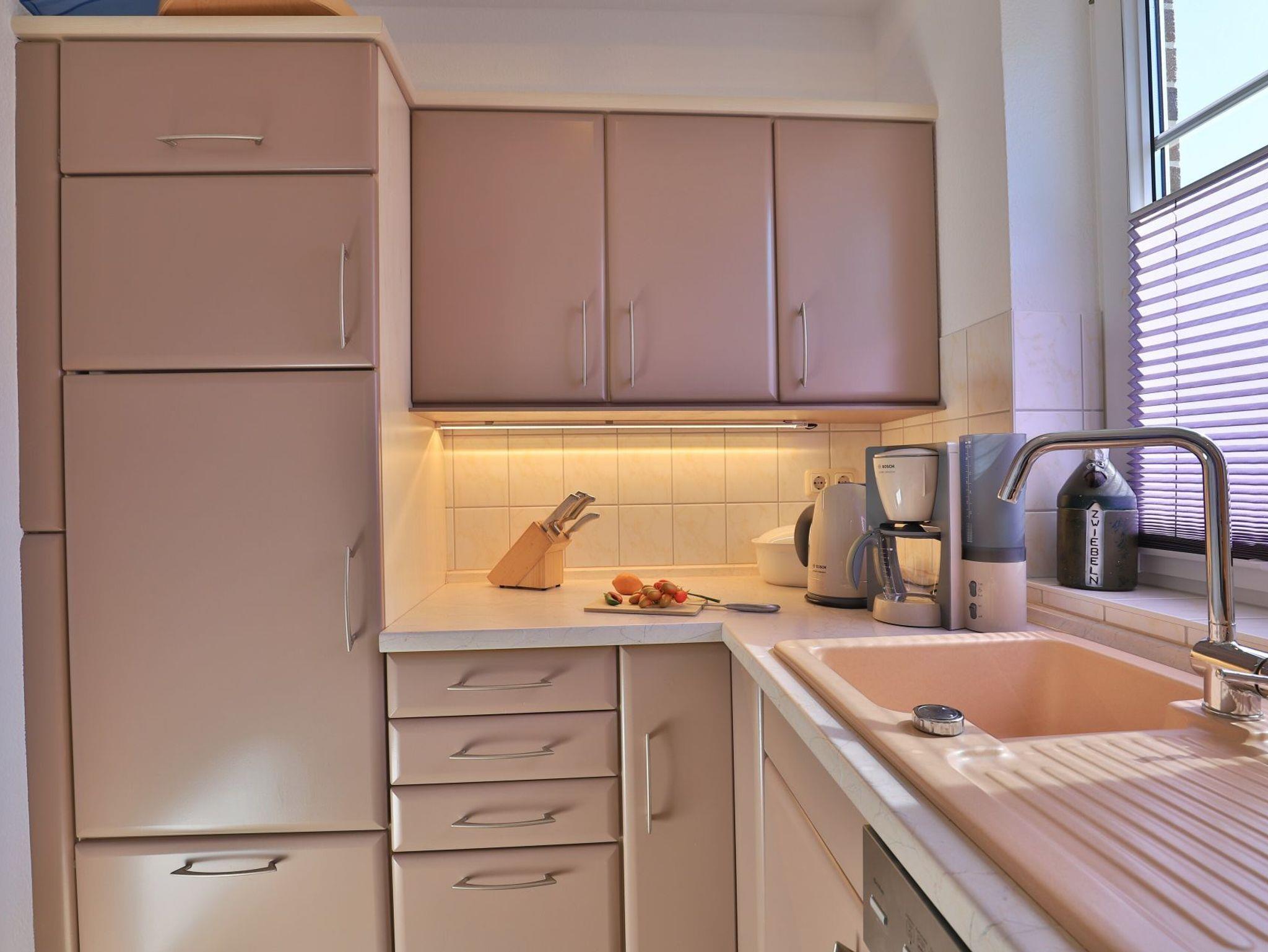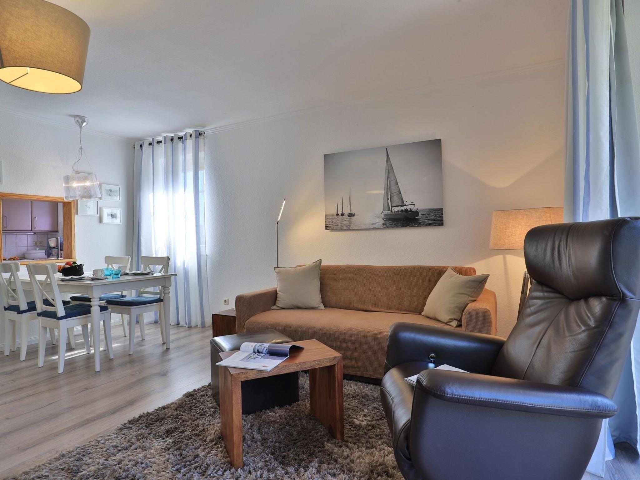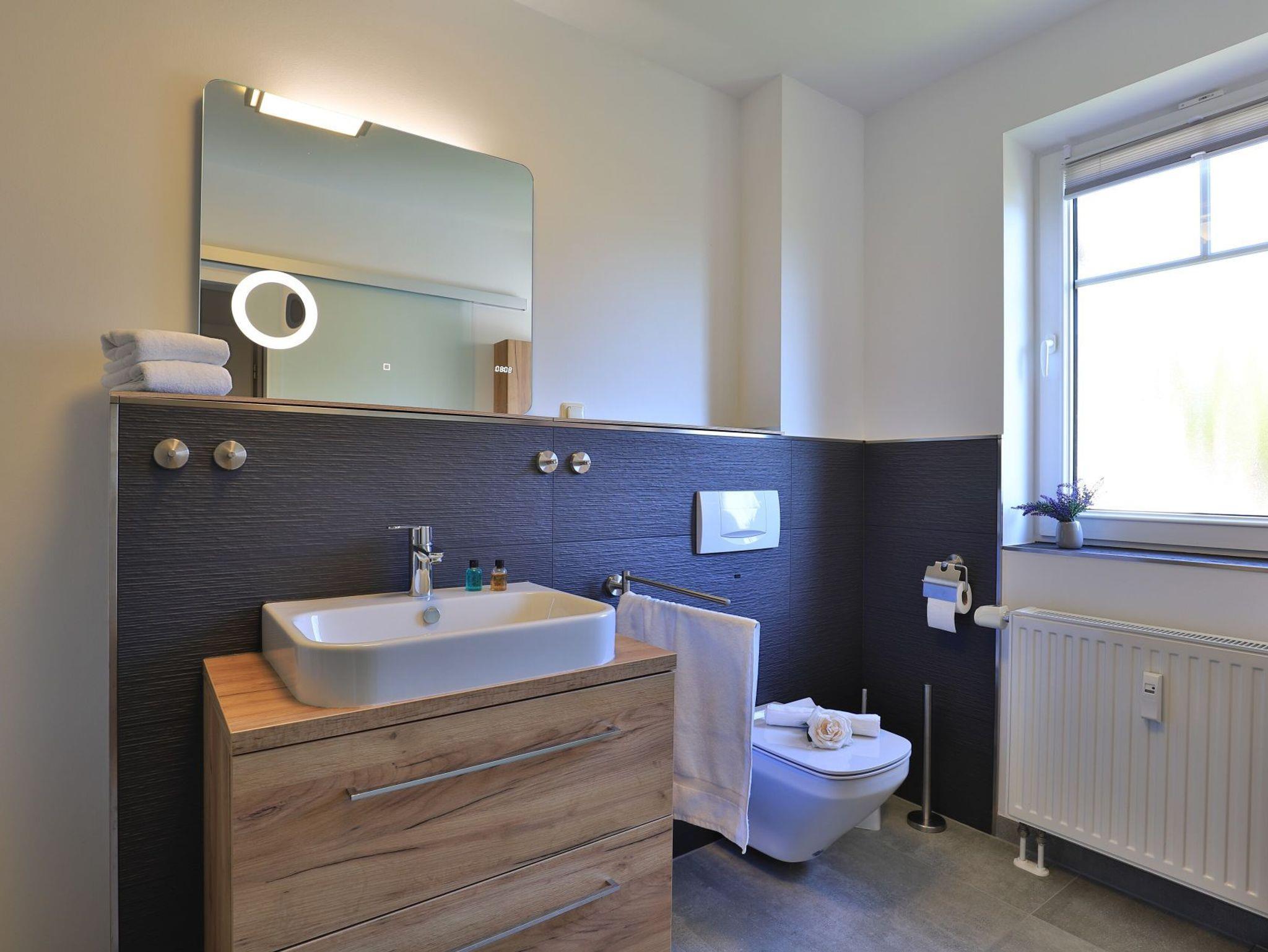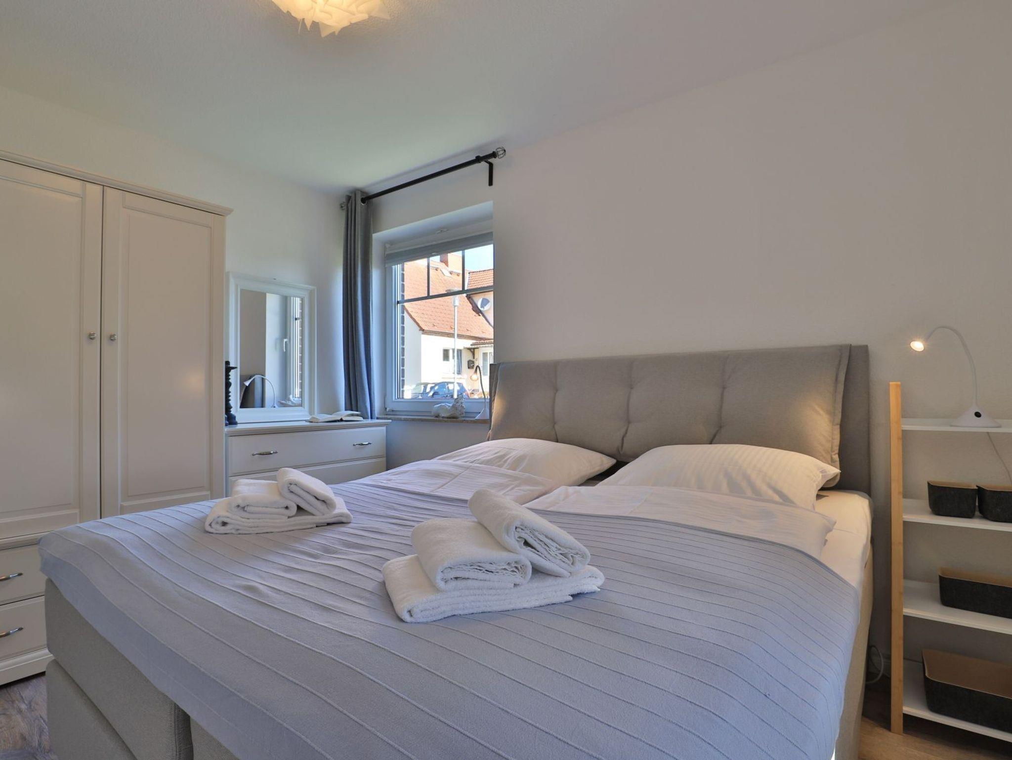 Die 2-Zimmerwohnung bietet eine großzügige Wohnfläche von 60qm und befindet sich im Erdgeschoss des Mehrparteienhauses. Eine Belegung ist mit 2 Personen möglich. Im sehr geschmackvoll möblierten Wohn-/Essbereich empfängt Sie ein Komfortsofa und ein Lesesessel mit Beinablage. Selbstverständlich ist das Appartement auch mit einem Fernseher, Musikanlage sowie WLAN ohne Mehrkosten ausgestattet. In der separaten Küche, die über eine Durchreiche zum Esstisch im Wohnbereich verfügt, können Sie Ihre Urlaubsmahlzeiten zubereiten. Ceranherd, Backofen, Dunstabzug, Kühlschrank mit sep. Gefrierfach, Kaffeemaschine, Wasserkocher, Toaster, Geschirrspüler u.v.m. sind vorhanden. Im Sommer können Sie sich auf der saisonal möblierten Terrasse wunderbar erholen und gerne das angrenzende Rasengrundstück nutzen. Geruhsame Nächte verbringen Sie in einem separaten Schlafzimmer mit Doppelbett ? 180cm mal 200cm-, Kleiderschrank und Kommode. Zugehörig ist ein modernes Duschbad mit Fenster, Waschtisch, Föhn, WC. Auch eine Waschmaschine, Bügeleisen und Bügelbett stehen zu Ihrer Verfügung. Im Safe sichern Sie persönliche Wertsachen.