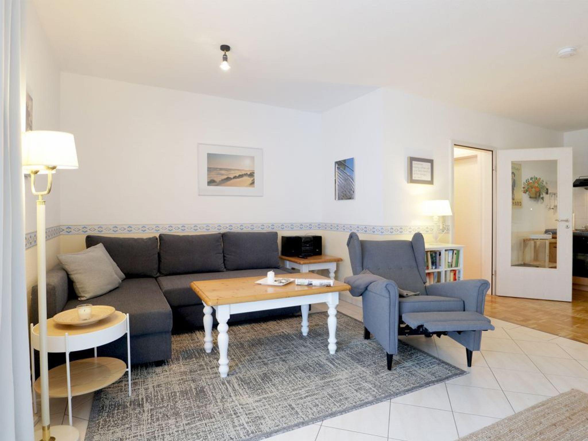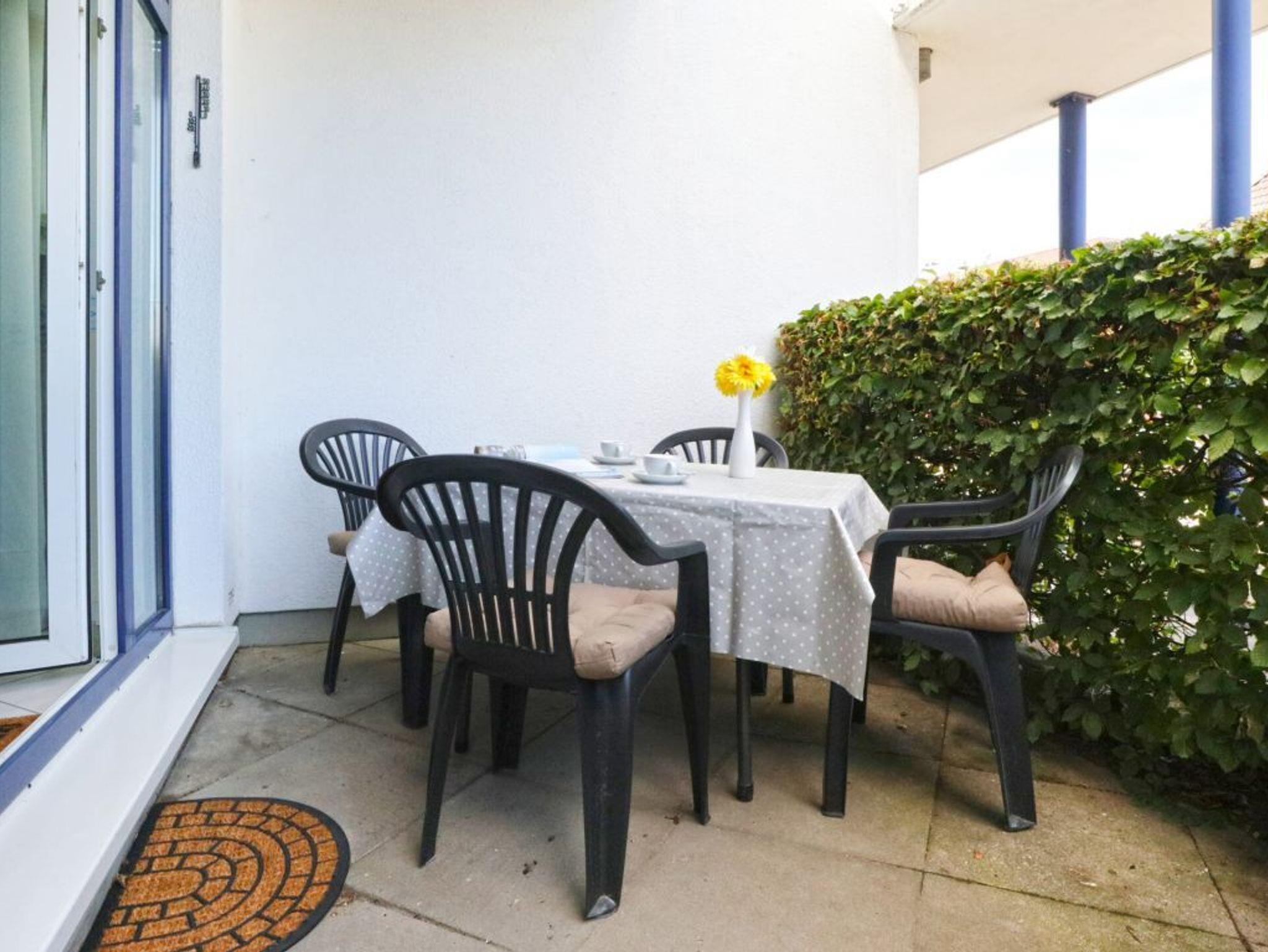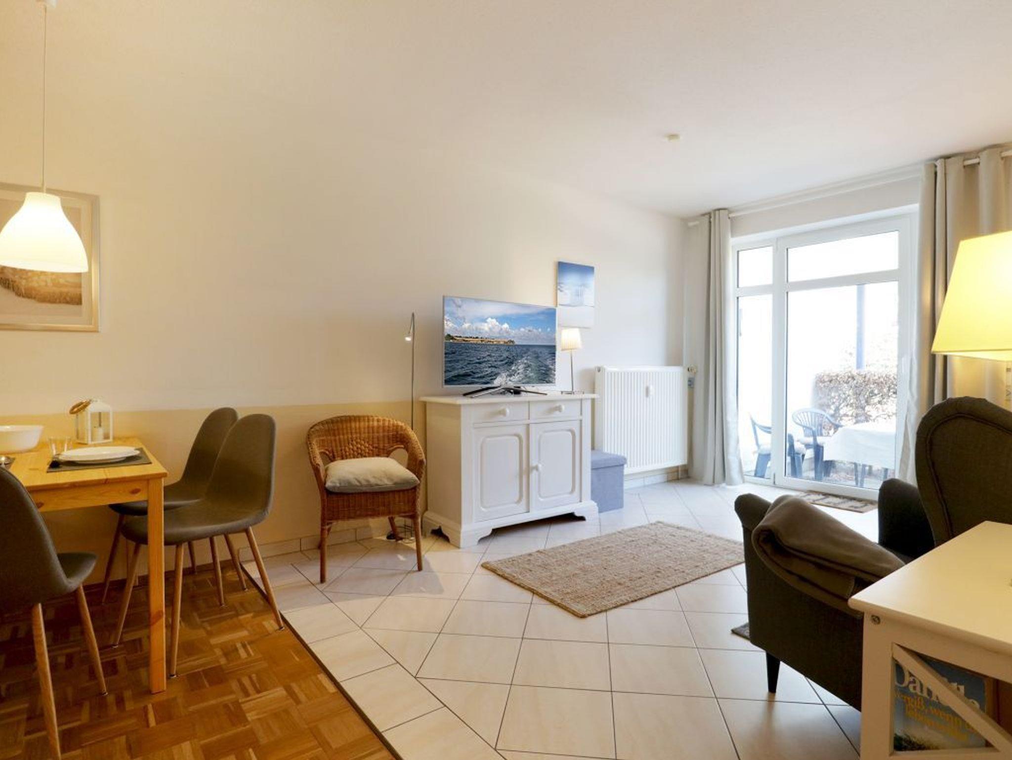 Das 2-Zimmer-Ferienappartement Haffblick 56 liegt im Erdgeschoss des Hauses und verfügt über eine Terrasse mit Grillmöglichkeit. Vom Wohnbereich gelangen Sie auf die geschützte Terrasse, welche in den Morgenstunden zum gemütlichen Frühstücken einlädt. Die Wohnfläche umfasst 49qm und eine Belegung ist mit bis zu 4 Personen möglich. Es empfängt Sie eine liebevoll möblierter Wohn-/Essbereich mit einem ausziehbaren Sofa, welches zwei weitere Schlafgelegenheiten bietet. Für gemeinsame Mahlzeiten ist ein Esstisch vorhanden. In der offenen Wohnküche können Sie bequem Ihre Urlaubsmahlzeiten zubereiten und sich somit bei Bedarf selbst versorgen. Ceranfeldherd, Backofen, Mikrowelle, Dunstabzugshaube gehören ebenso zur Ausstattung, wie Wasserkocher, Toaster, Kaffeemaschine und Geschirrspüler. Technische Unterhaltungselektronik bieten ein Fernseher mit Sky- Programmen/ Premiere, DVD-Player, eine Musikanlage sowie der gebührenfreie Internetzugang über WLAN. Geruhsame Nächte verbringen Sie in dem separaten Schlafzimmer mit Doppelbett und Kleiderschrank. Zugehörig ist ein innenliegendes Duschbad mit Waschtisch und WC. Allen Hausgästen stehen Waschmaschine und Wäschetrockner zur gemeinschaftlichen Nutzung gegen Gebühr zur Verfügung. Für Ihren PKW ist ein kostenfreier Außenstellplatz am Haus reserviert. Fahrradunterstellmöglichkeiten sind ebenfalls vorhanden. Bitte beachten Sie, dass in der Wohnung nicht geraucht werden darf und auch Haustiere nicht gestattet sind. Sie wohnen nur 200 Meter zum feinsandigen Strand mit guten Bademöglichkeiten.